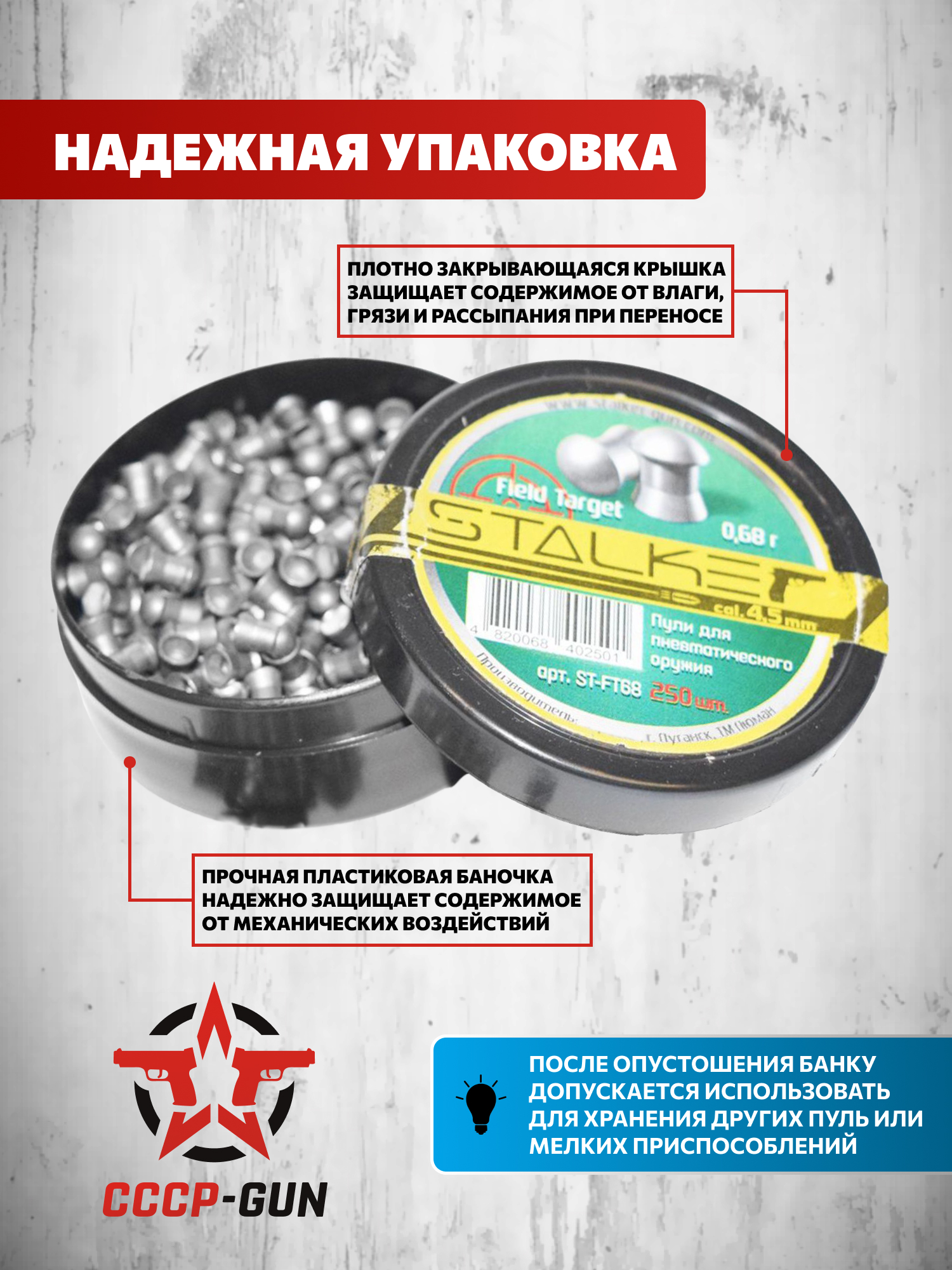 Линейка Field Target от Сталкер разработана для пневматики с нарезными стволами калибра 4.5 мм. Основой для изготовления выступает очищенный свинец, гарантирующий оптимальное сочетание плотности и пластичности. Передняя часть снарядов выполнена в куполообразной форме, что способствует минимизации аэродинамического сопротивления и повышению стабильности траектории полета.