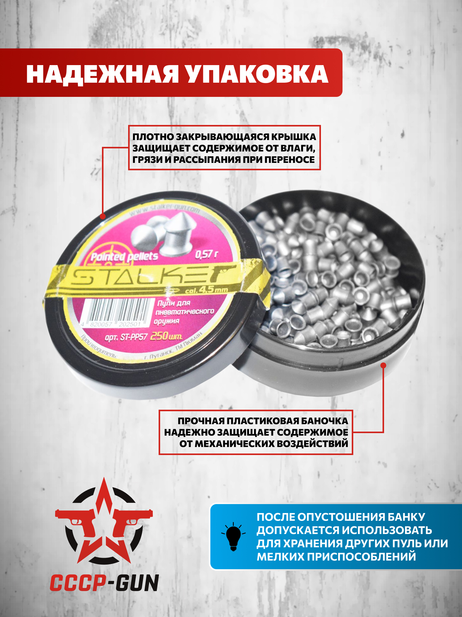 Пульки для пневматики калибр 4.5 мм Сталкер поставляются покупателю в таре - габариты емкости 60 на 60 на 20 миллиметров допускают компактное размещение в карманах одежды или небольших отсеках тактической экипировки, например, в чехле винтовки. Баночка в конкретном случае предусматривает 250 снарядов.