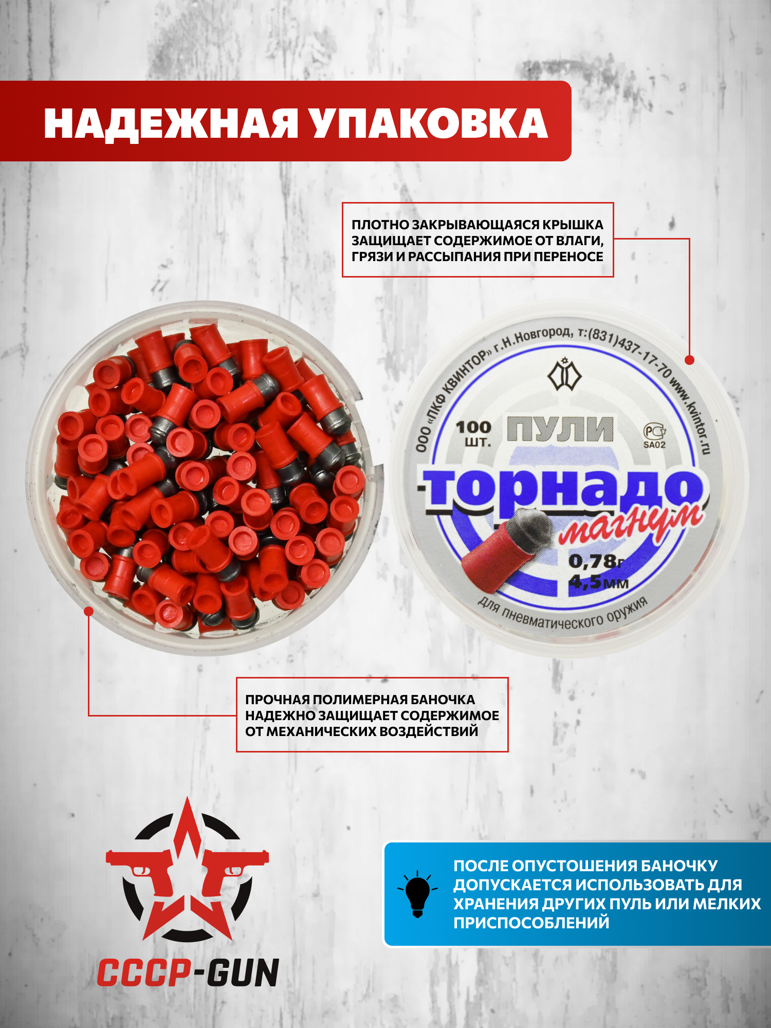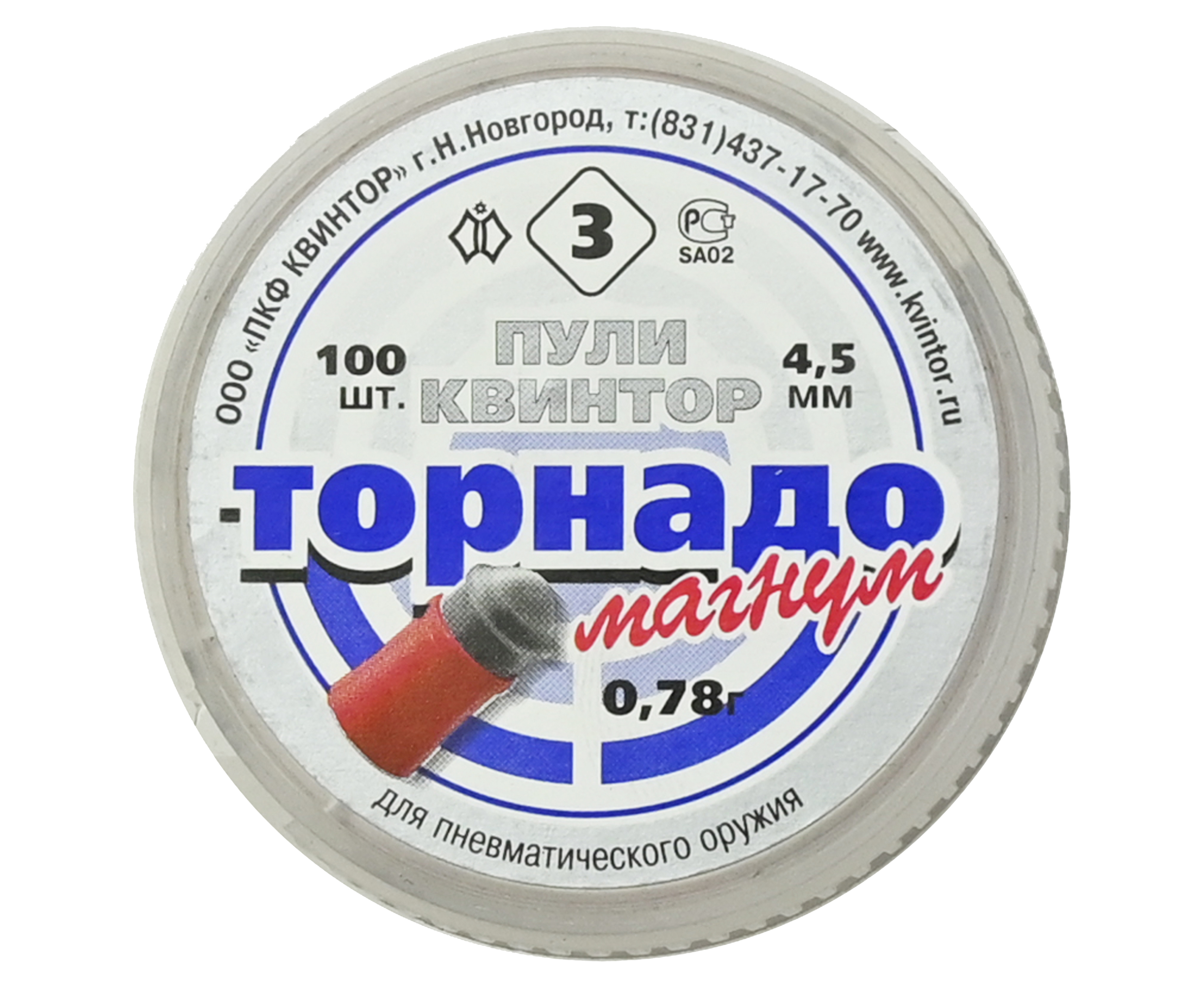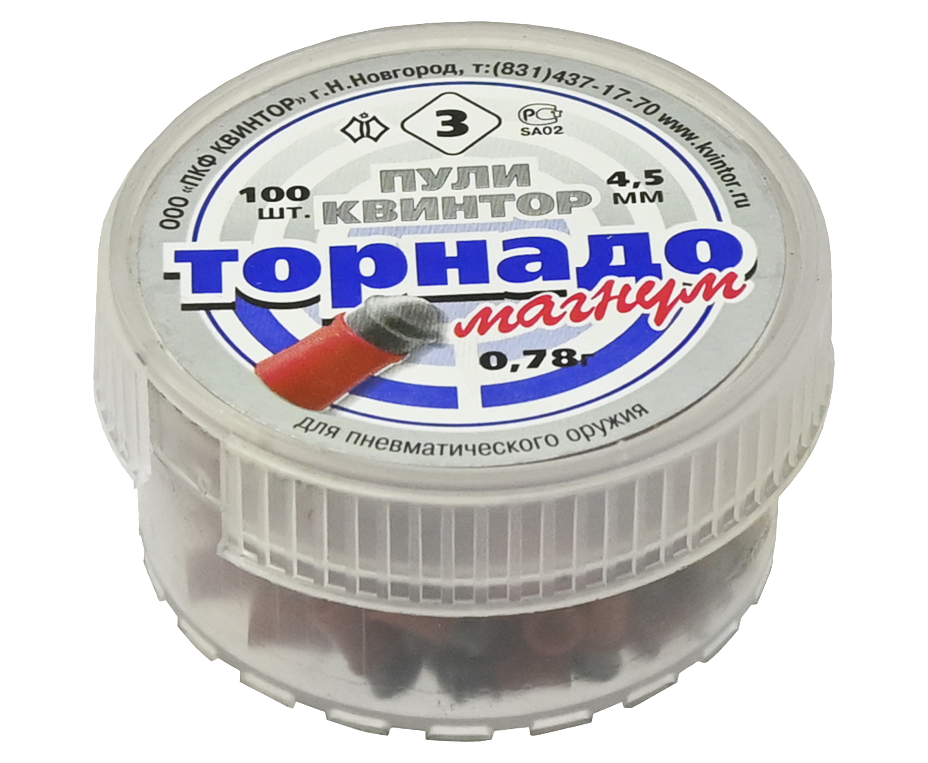 Пули Торнадо 4.5 мм для пневматики в модификации Magnum отличились конструкцией - боеприпас состоит из двух элементов. К фронтальной металлической части прикреплен хвостовик из пластика алого цвета, что повышает обтюрацию вкупе с пояском на свинцовом сердечнике. Смещение точки концентрации тяжести вместе с полимерной деталью делают выстрел стабильнее.