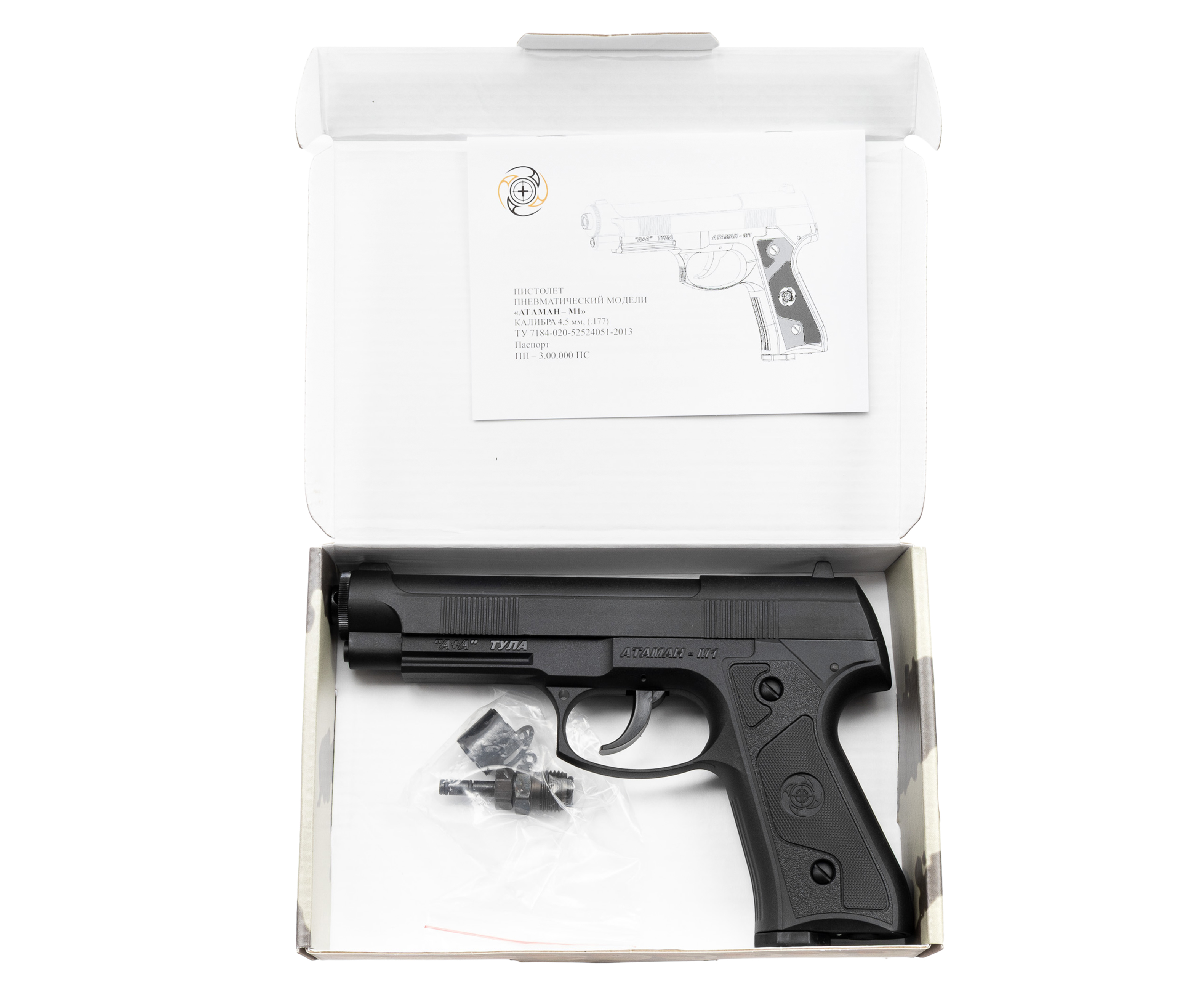 Комплект поставки Пистолет, магазин, упаковка, заправочный штуцер, краткая документация, копия сертификата (по запросу покупателя)