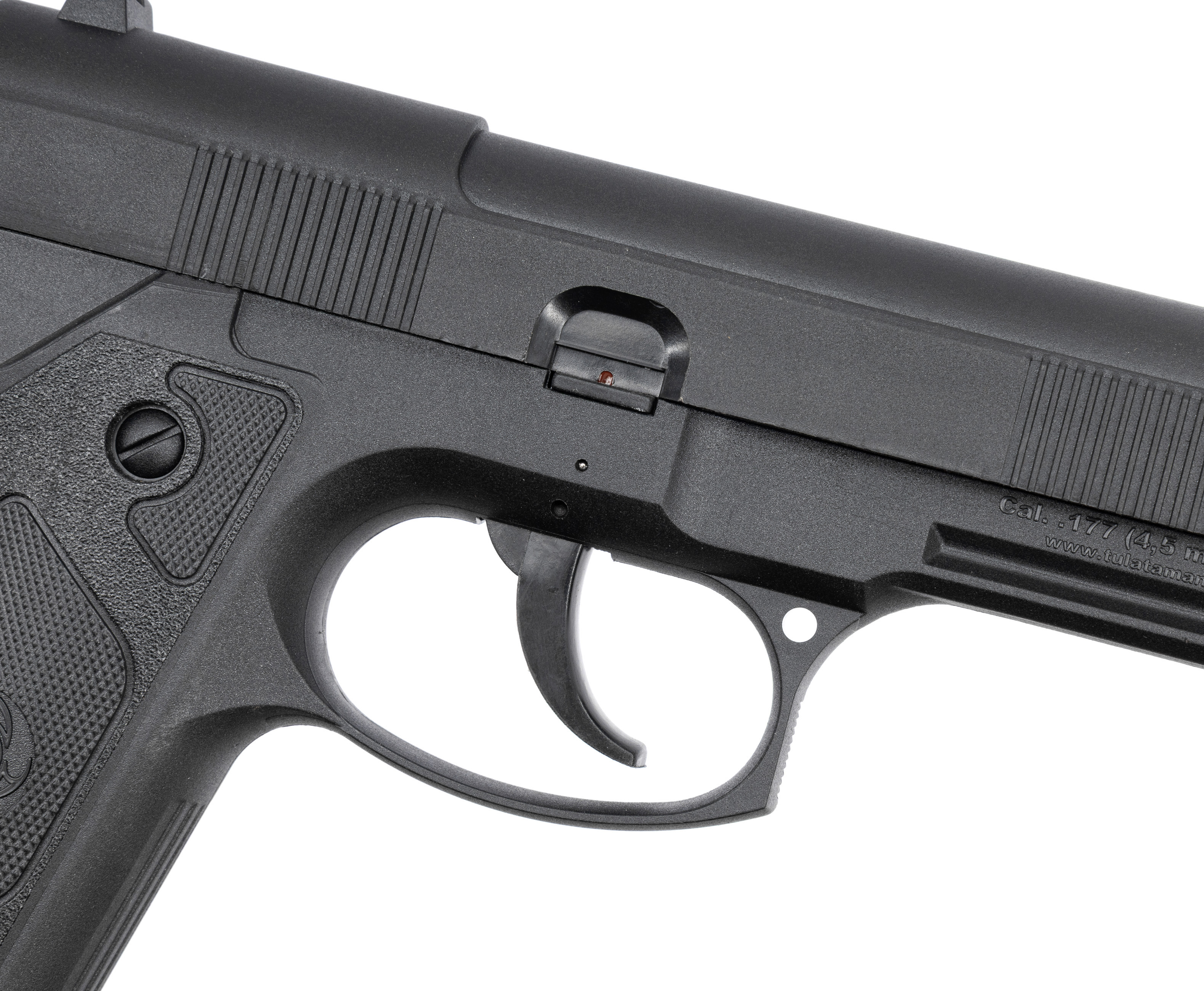 Важно отметить, что скорость боеприпаса после нажатия на спуск составляет 125 метров в секунду. Такой мощности хватит для точного попадания по мишени с расстояния до 40 метров, однако для приобретения пистолета лицензия не требуется. Это возможно благодаря тому, что производитель выпускает модель Ataman М1-У с дульной энергией составляющей менее 3 Джоулей. Для предотвращения травм с правой стороны изделия находится двухпозиционный предохранитель, помогающий обезопасить стрелка и окружающих.