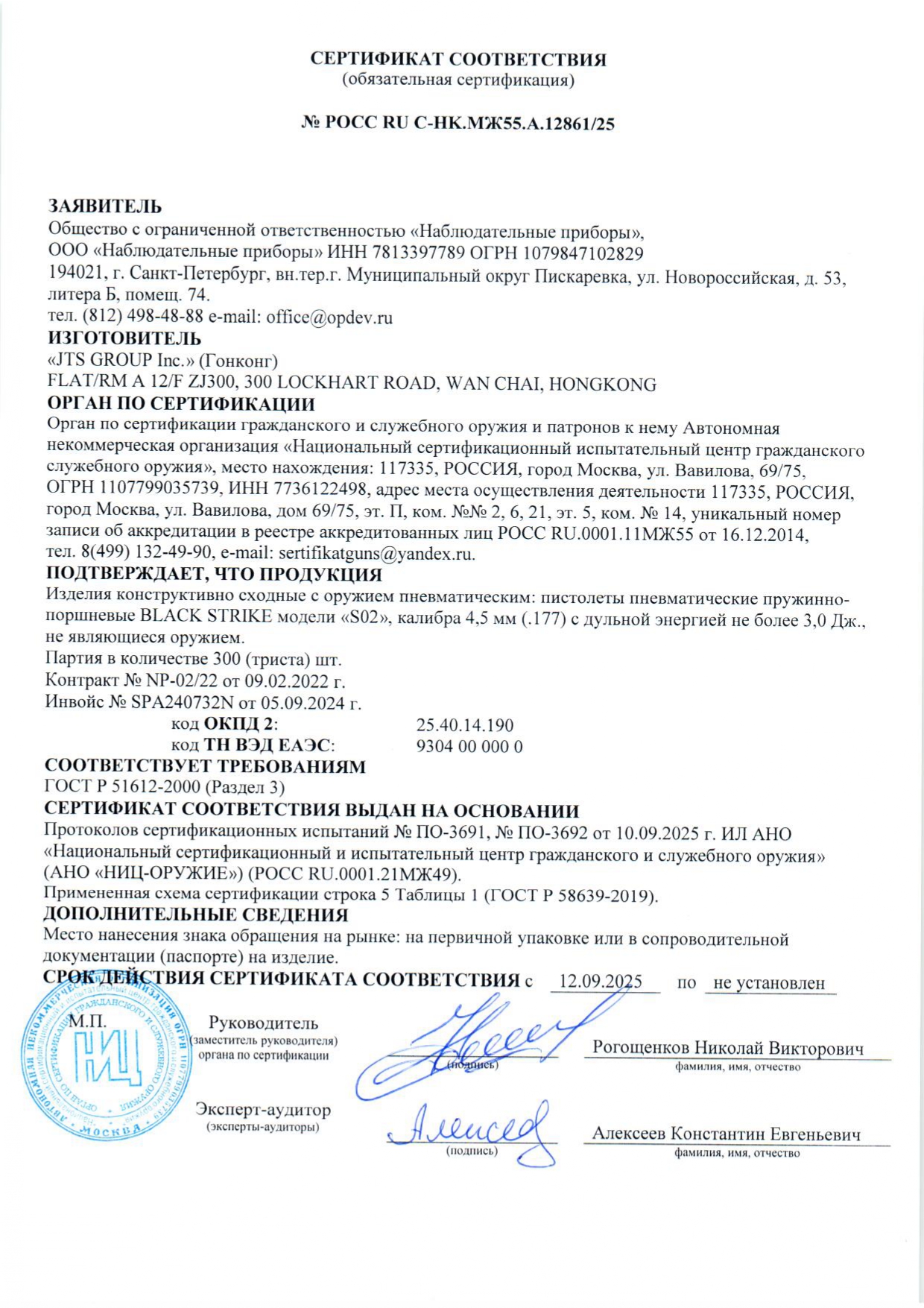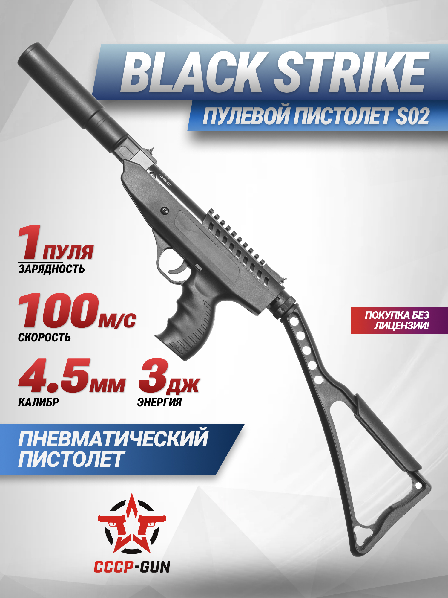 Экземпляр S02 Black Strike не является классическим пистолетом - комплектация такой модификации включает отъемный плечевой упор, что допускает ведение стрельбы с надежной фиксацией в зоне плеча. Для монтажа приклада применяется крепление через крепежный паз, благодаря чему установку можно осуществить без специального инструмента - требуется лишь вставить элемент в ответный приемник и провернуть до надежной фиксации. При отсутствии надобности в плечевом упоре последний легко и оперативно демонтируется, сокращая полную длину с 625 миллиметров до 450 миллиметров.