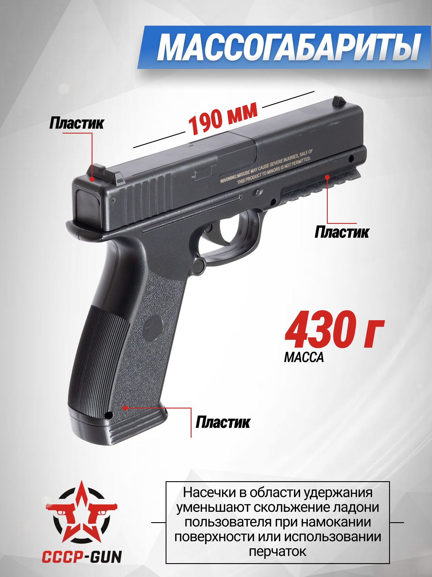 Рассматриваемое изделие выделяется своей реалистичностью внешнего вида, а также габаритами конструкции, которые составляют 198 миллиметров. Огнестрельный экземпляр, послуживший основой для создания представленной модели, является одним из самых узнаваемых видов короткоствольного оружия не только за счет его повсеместного использования силовыми структурами и вооруженными силами разных стран, но и благодаря частой демонстрации пистолета в играх, фильмах и других веяниях популярной культуры.