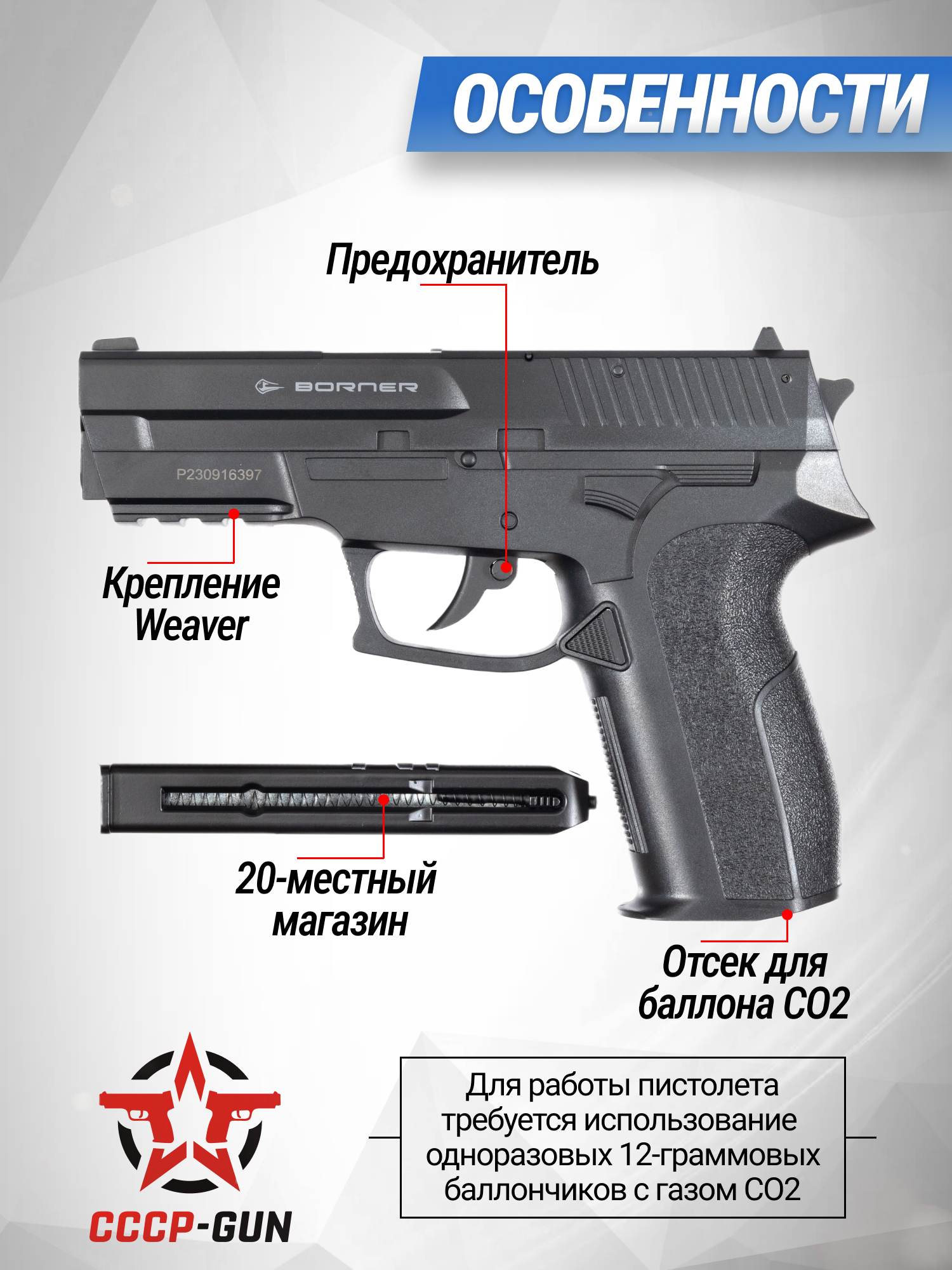 Пневматическая модель от фирмы Borner, в свою очередь, применяется для развлекательной стрельбы или обучения начинающих пользователей оружия. На российском рынке приобретение рассматриваемого изделия не требует от покупателя наличия каких-либо лицензионно-разрешительных документов за счет соответствия показателя дульной энергии пистолета в 3 Джоуля требованиям законодательства. Изготовитель также отмечает, что при выстреле стандартный боеприпас разгоняется до скоростной отметки, достигающей 120 метров в секунду.
