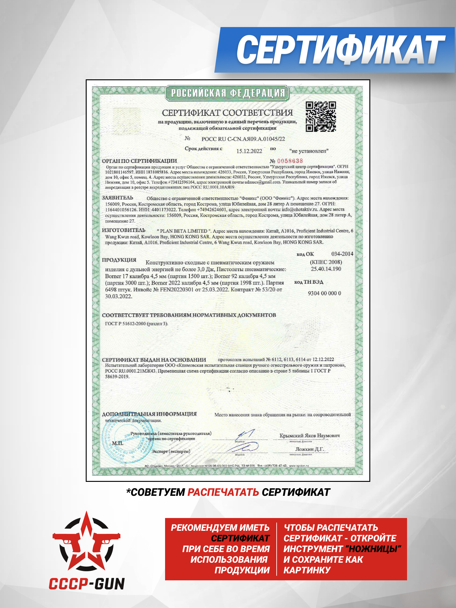 Классифицируется представленный пистолет Borner 2022 как пневматика, применяющая энергию расширения газа углекислоты в качестве силы для разгона боеприпаса. Воздушная масса образуется в процессе закипания жидкой фазы CO2 и содержится в специализированном 12-граммовом баллончике, который перед началом эксплуатации устанавливается в соответствующий отсек в основании рукояти оружия.
