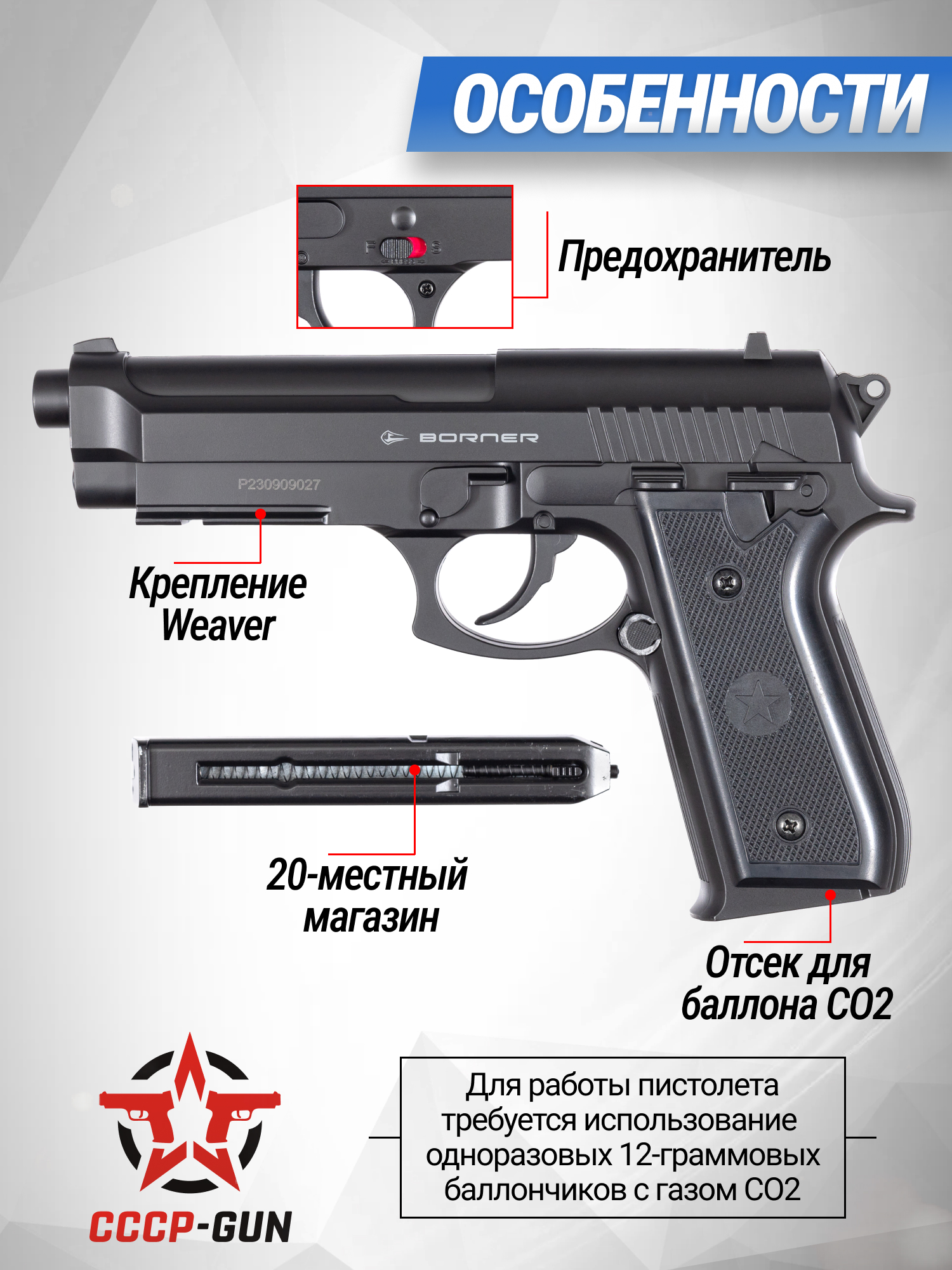 В качестве снарядов рассматриваемая модель пневматики Borner 92 использует стальные пули сферического форм-фактора в калибре 4.5 миллиметра, для питания которыми в комплекте предусмотрен однорядный 20-местный магазин универсального типа с пружинным подавателем. Важно отметить, что стрельба из описываемого пистолета ведется в полуавтоматическом режиме и для обеспечения требуемого уровня безопасности на правой стороне рамки изготовитель предусмотрел двухпозиционный предохранитель, который блокирует работу спускового крючка и не дает произвести случайный выстрел.