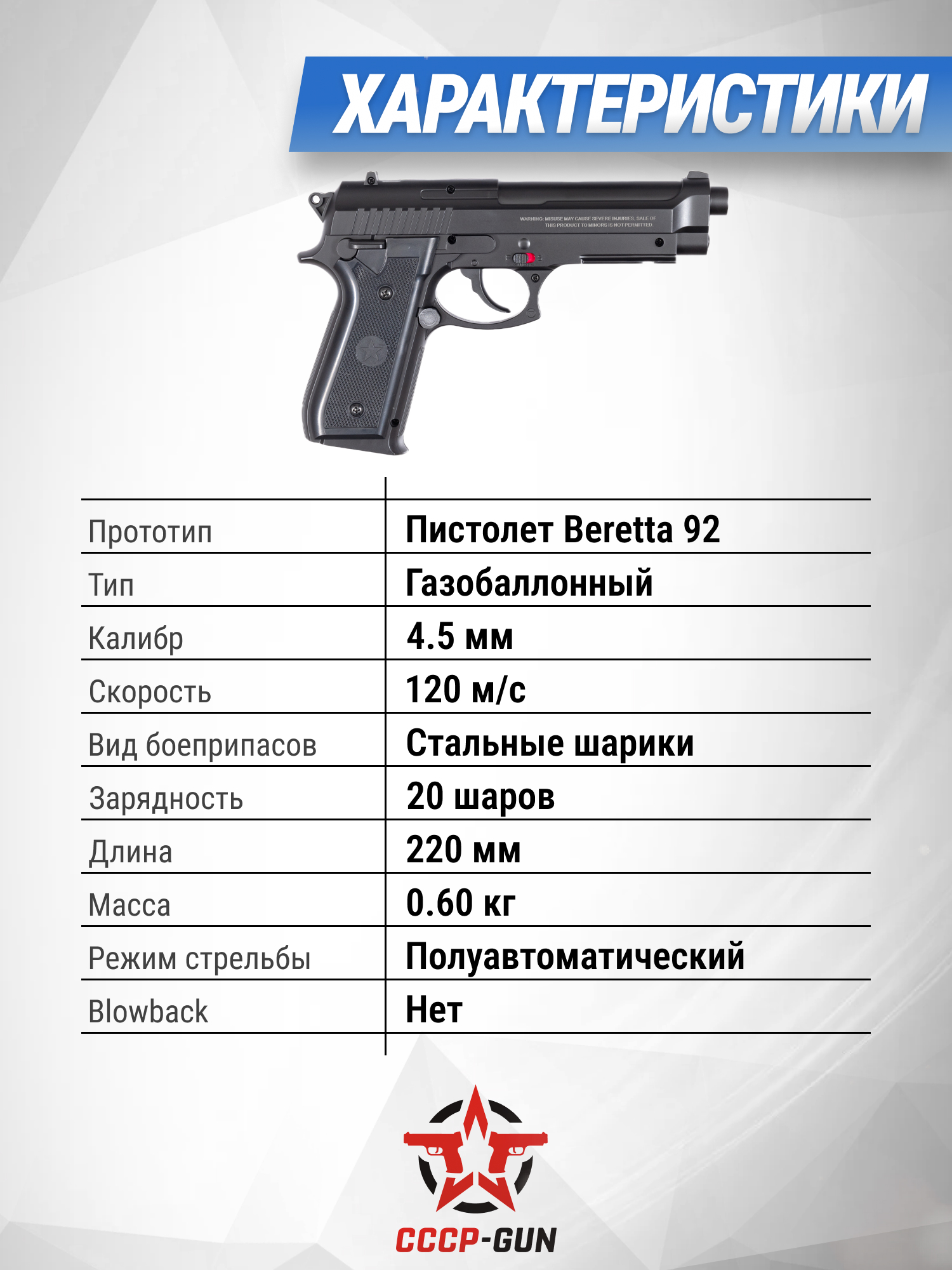 Образцом для разработки рассматриваемого пневматического оружия послужил одноименный пистолет Beretta 92 итальянского производства, который больше 50 лет активно эксплуатируется различными военизированными и силовыми структурами по всему миру. Повсеместную узнаваемость указанной модели короткоствольного вооружения принесла его частая демонстрация в фильмах, видеоиграх и других направления популярной культуры.