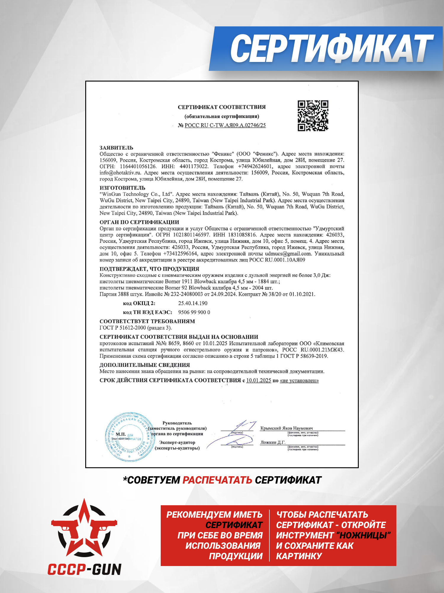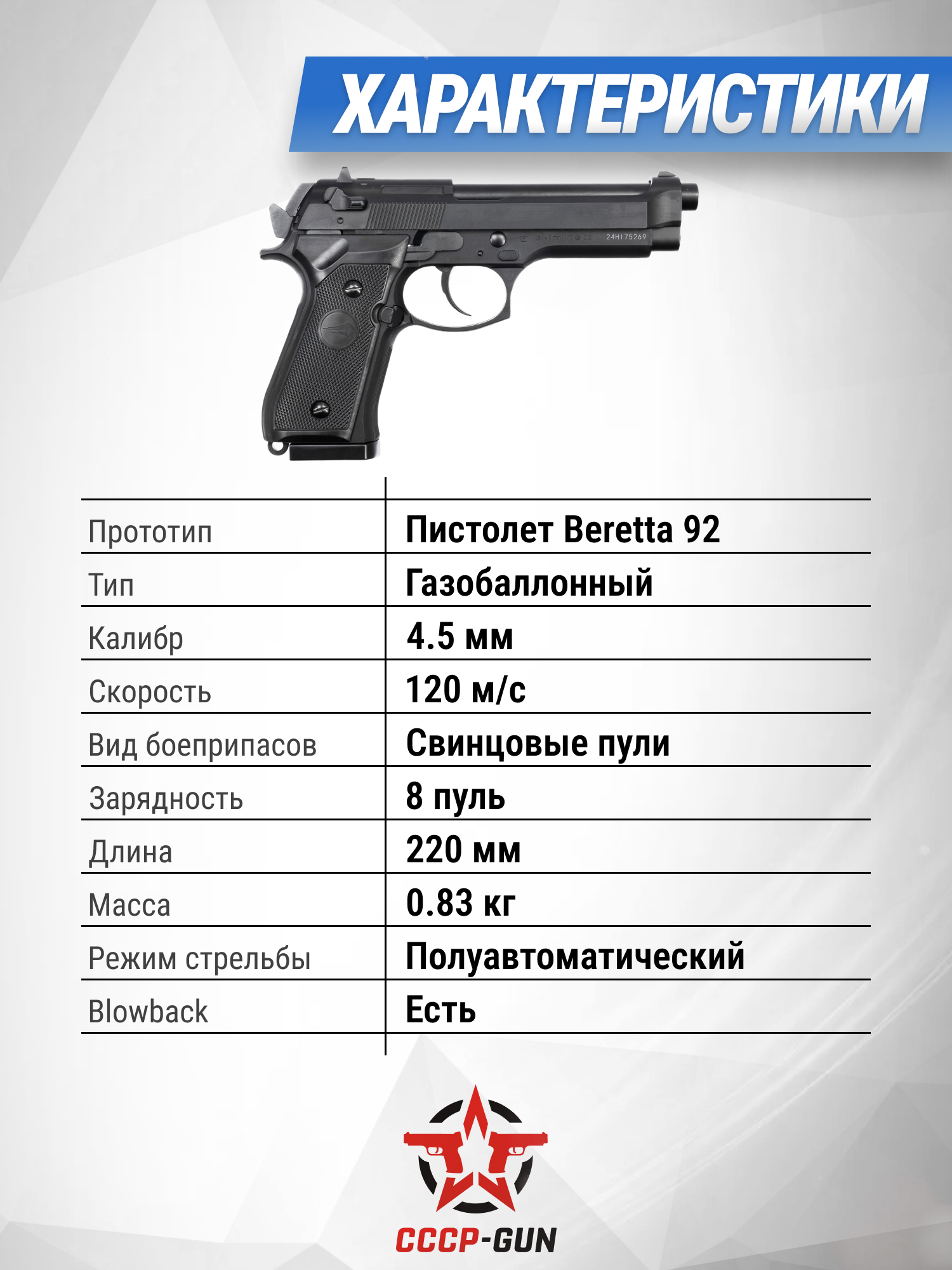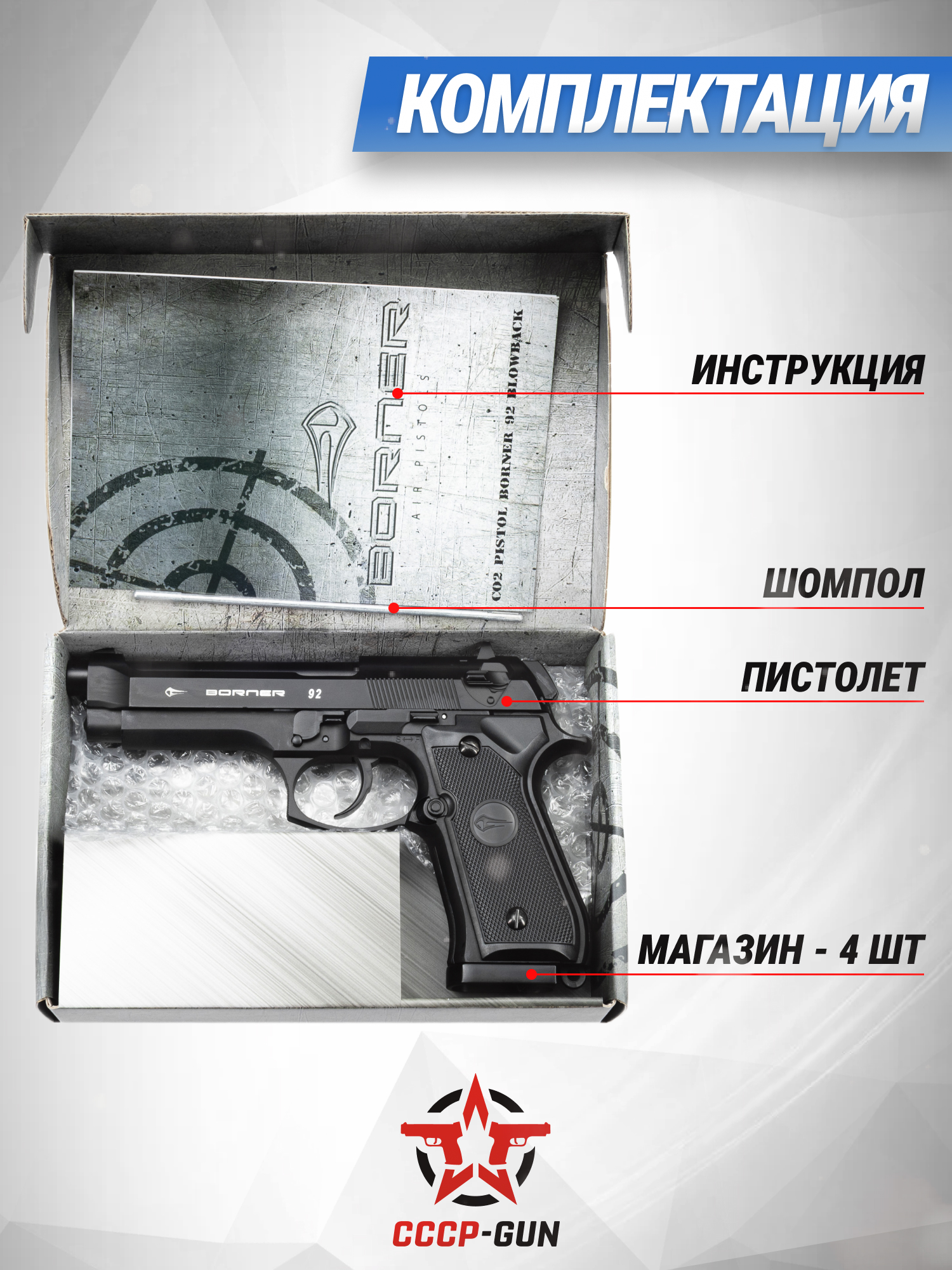 Максимальная скорость полета легкой свинцовой пули из пистолета Borner 92 составляет около 120 метров в секунду. Такой показатель отлично подойдет для тренировок меткости, развлекательной стрельбы на природе или плинкинга. При этом модель продается в России свободно и не обязует покупателя получать специальное разрешение, что подходит для начинающих стрелков и пользователей, которые хотят приобрести изделие для коллекции.