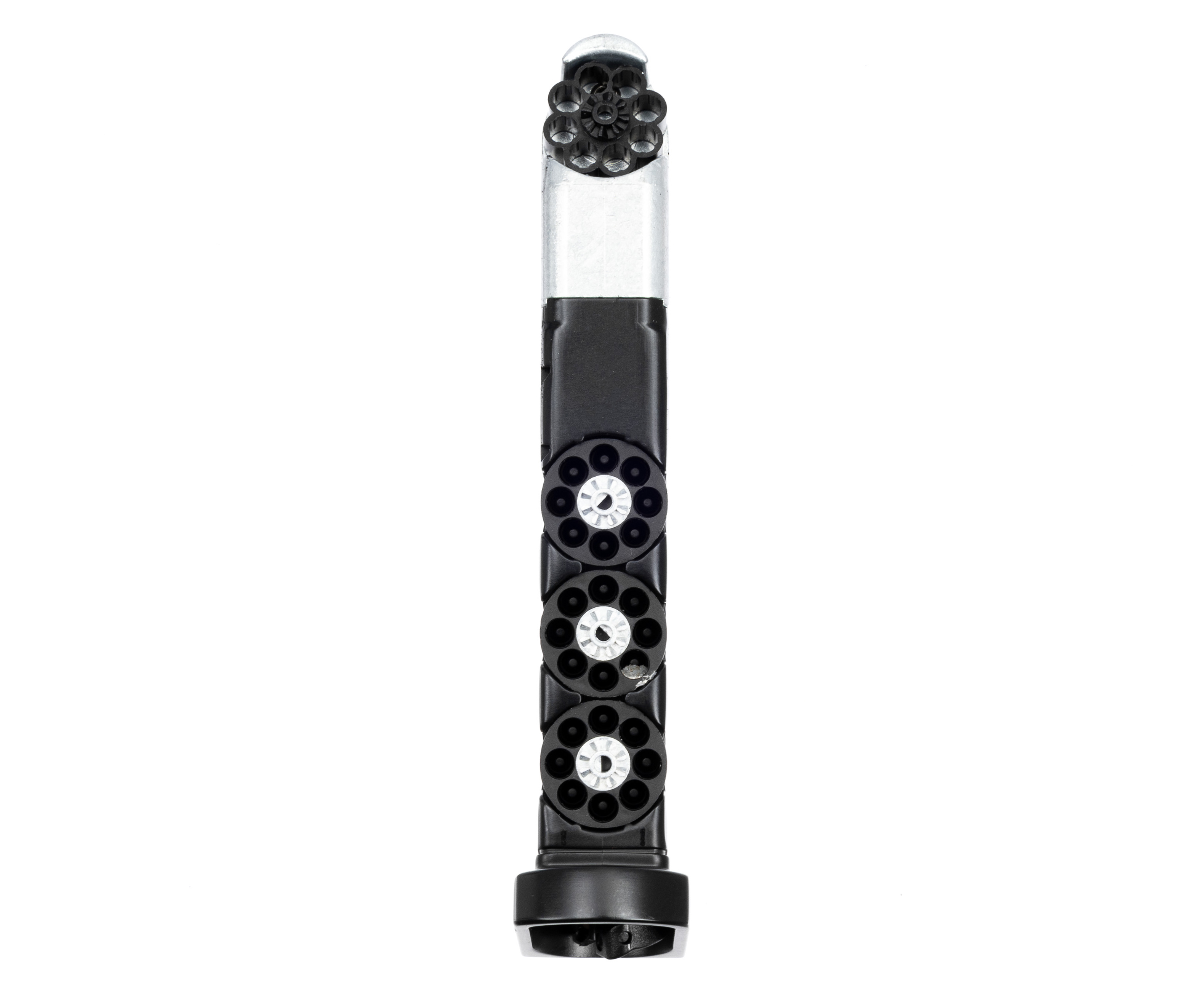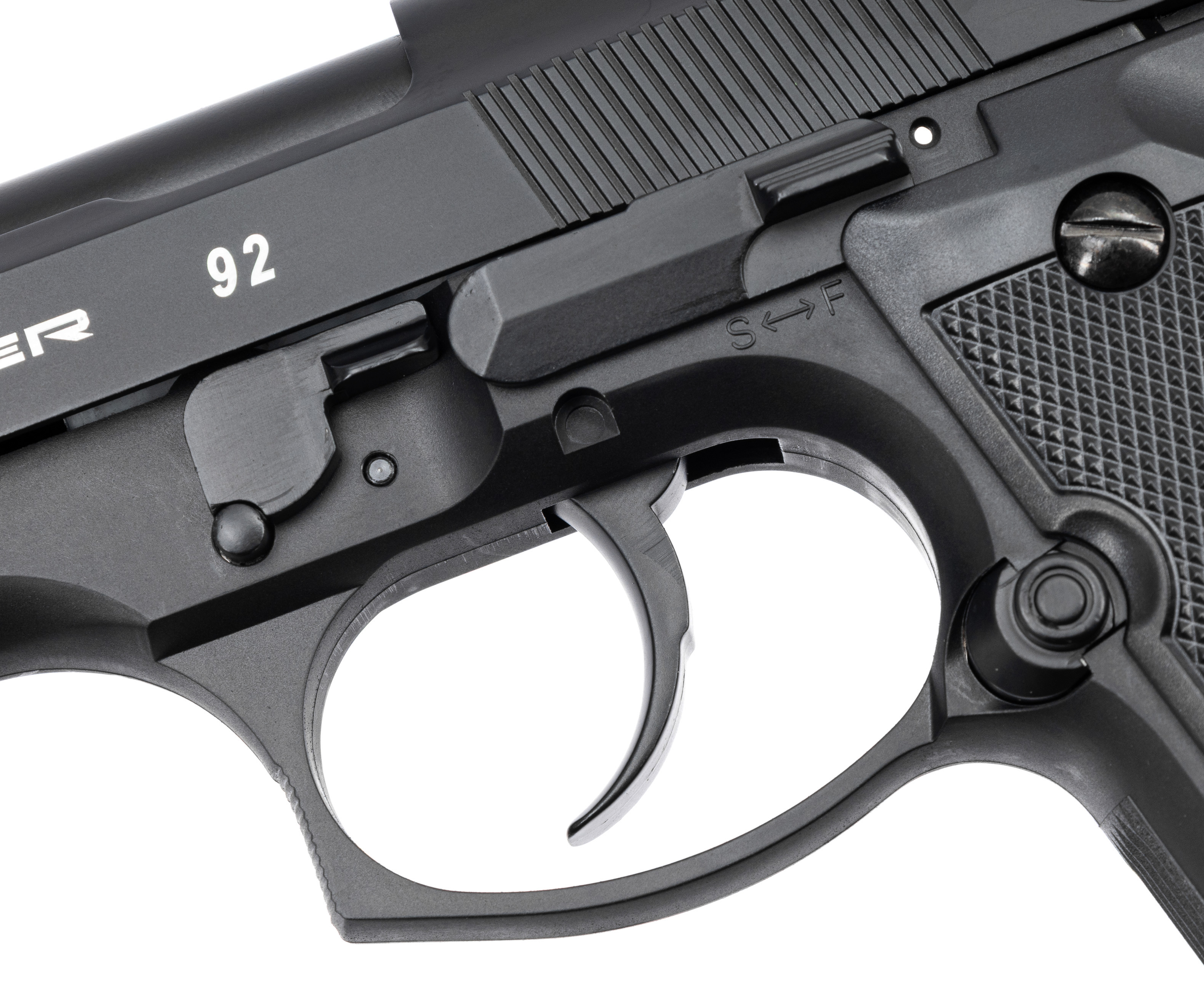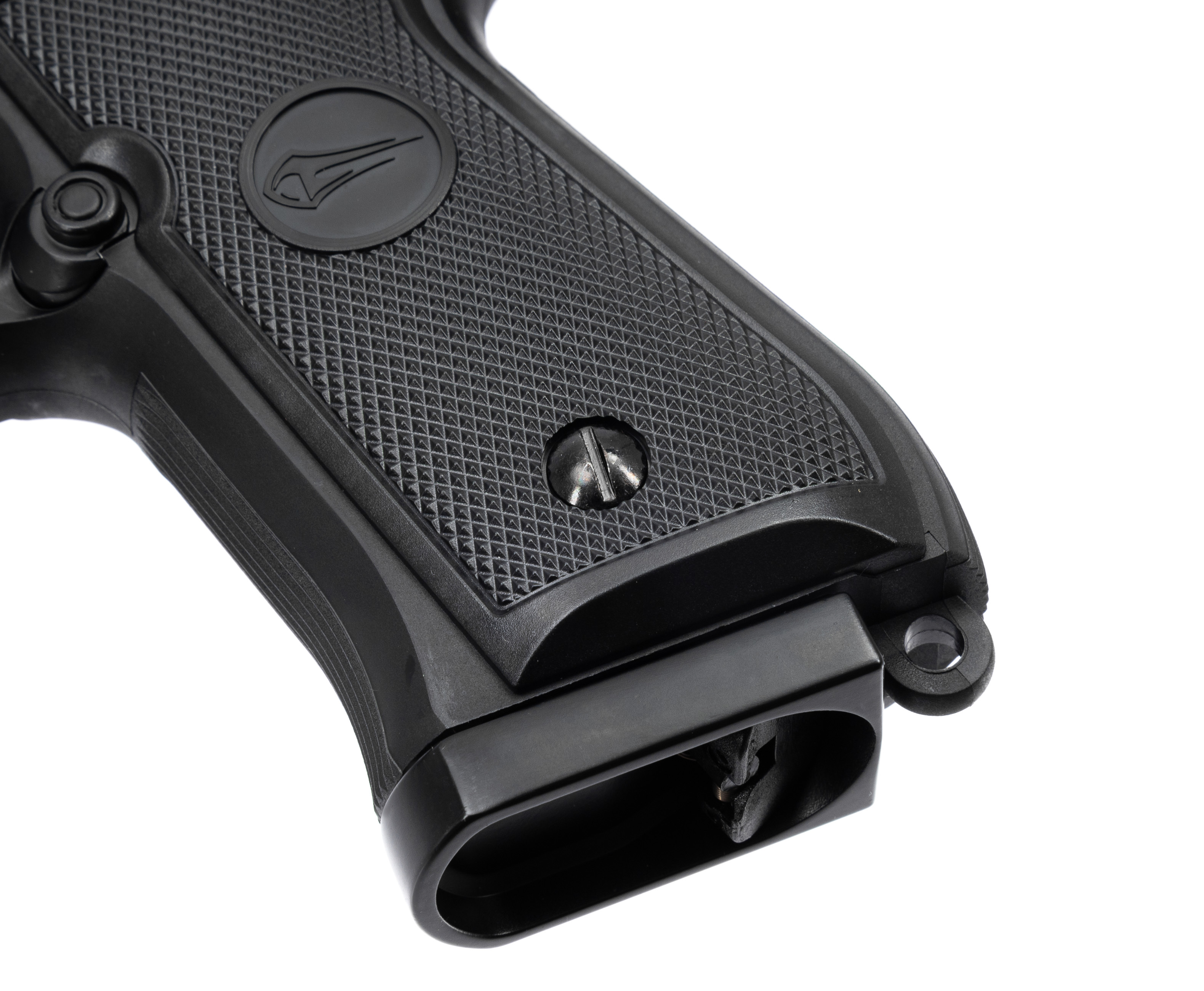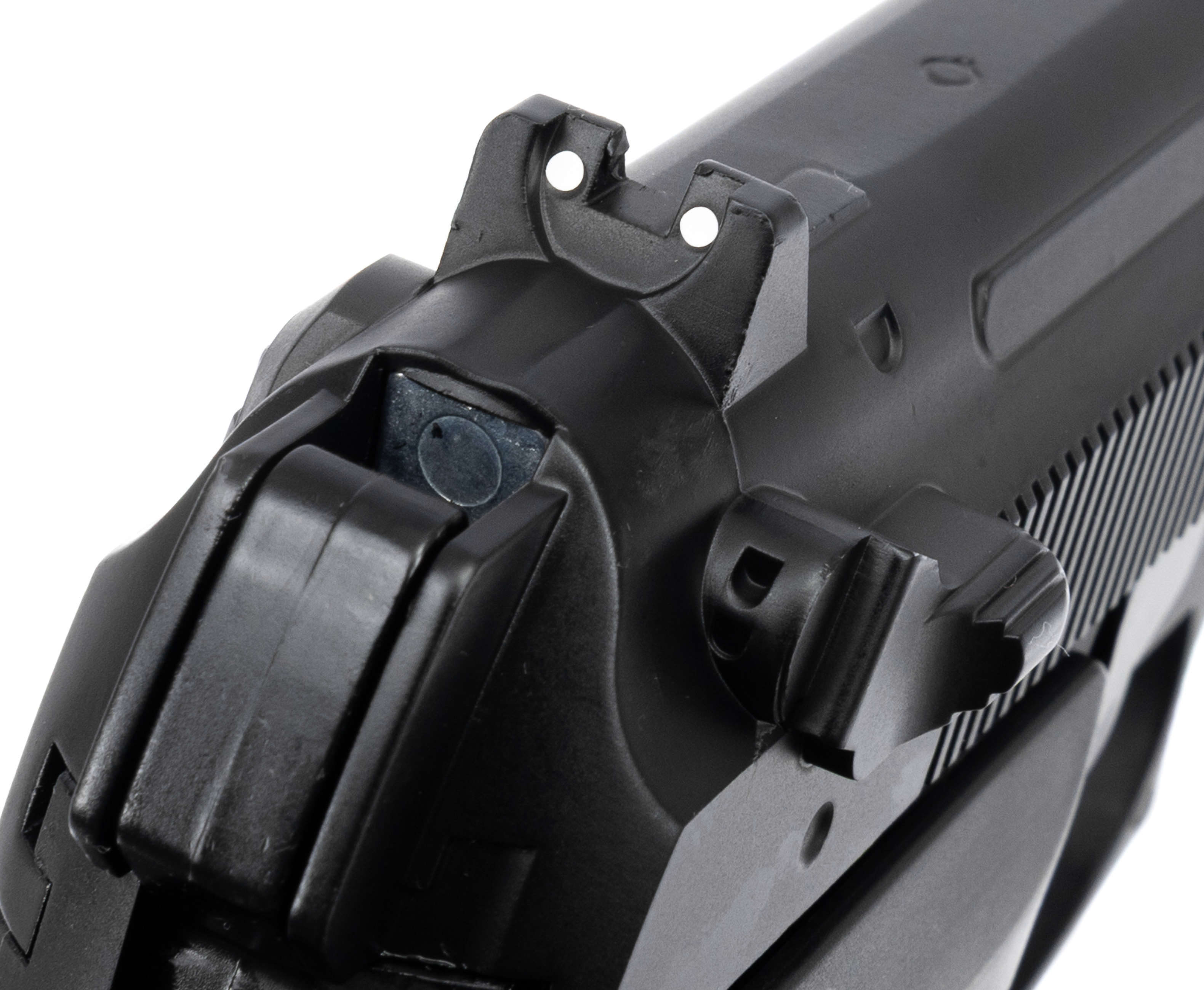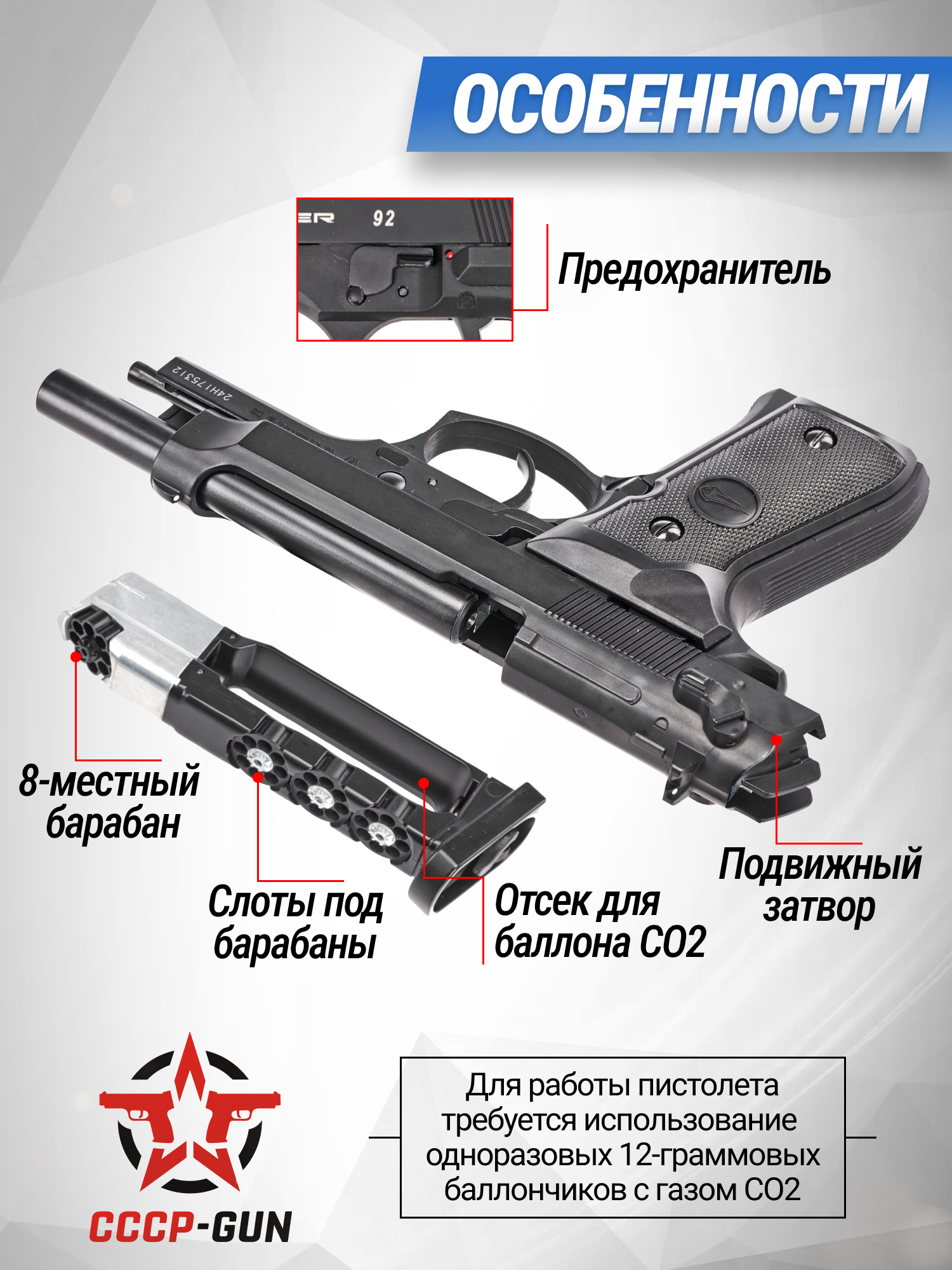 Borner 92 Blowback относится к пулевым CO2 пистолетам, поэтому в качестве боеприпасов используются воланчиковые снаряды из свинца под калибр 4.5 миллиметра, которые заряжаются в 8-слотовые барабанчики. В комплекте приложено сразу четыре таких картриджа, устанавливающихся в специальные отсеки выдвижного полноразмерного магазина. Ствол у обозреваемой модели нарезной, что помогает добиться точности во время стрельбы.