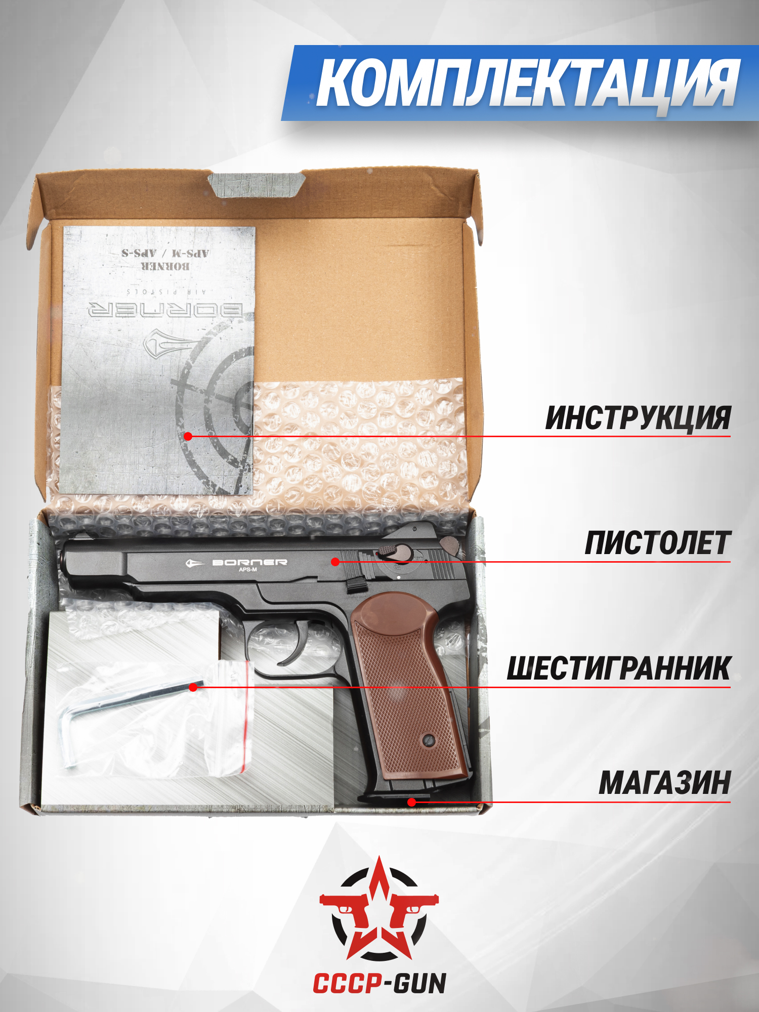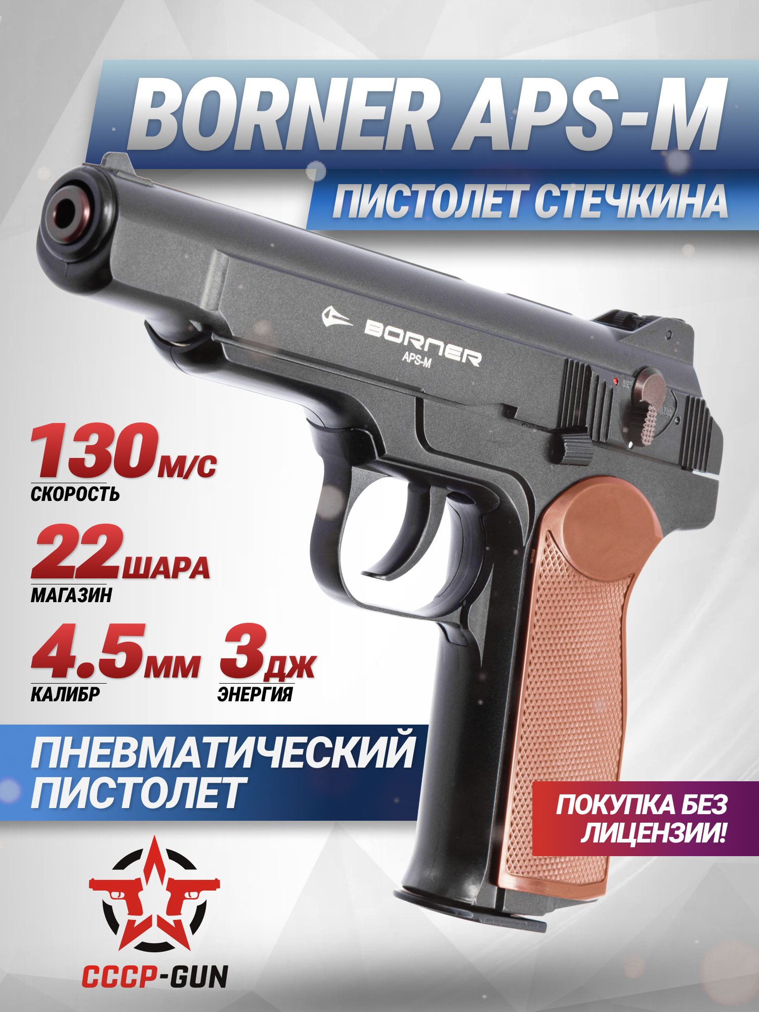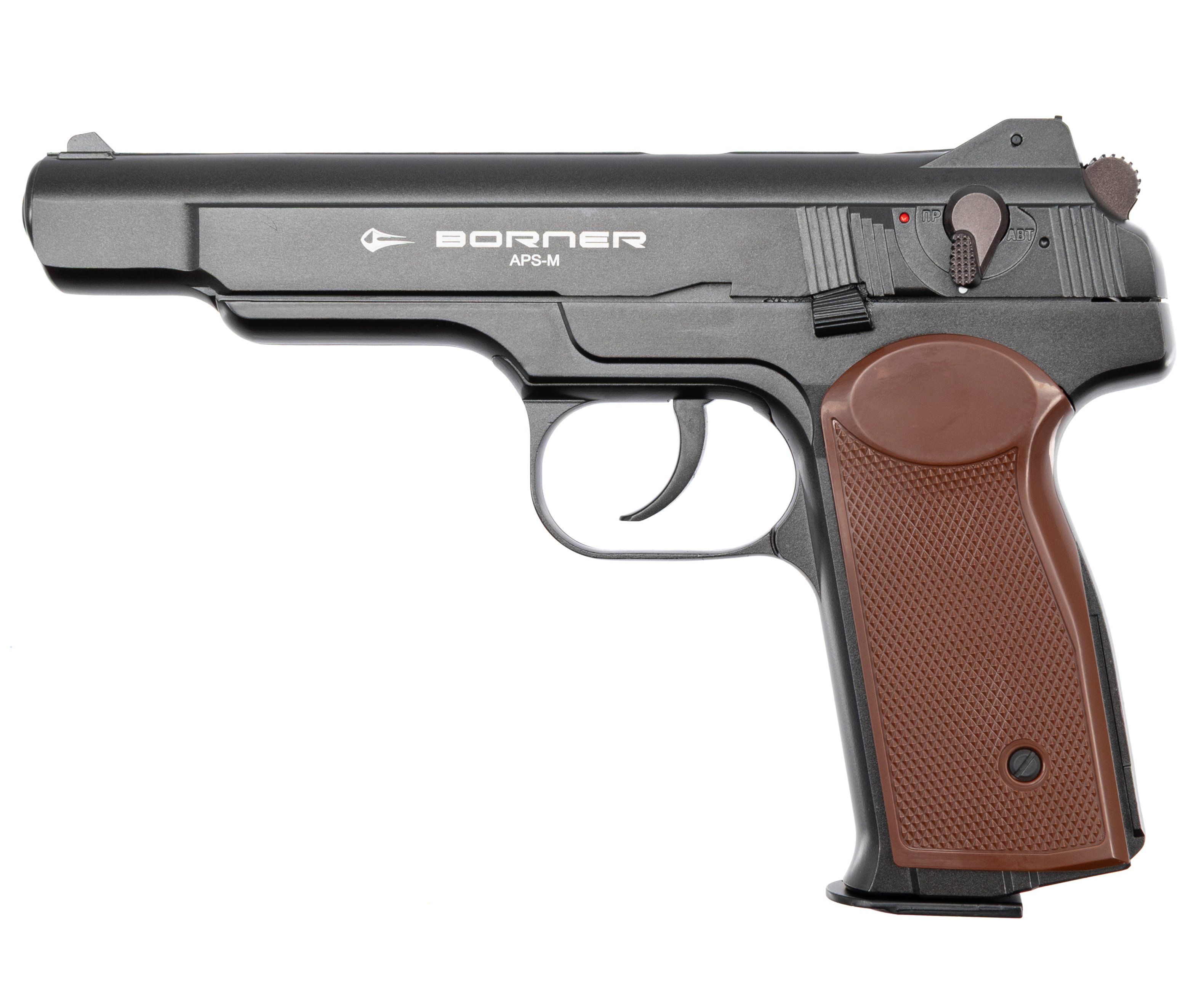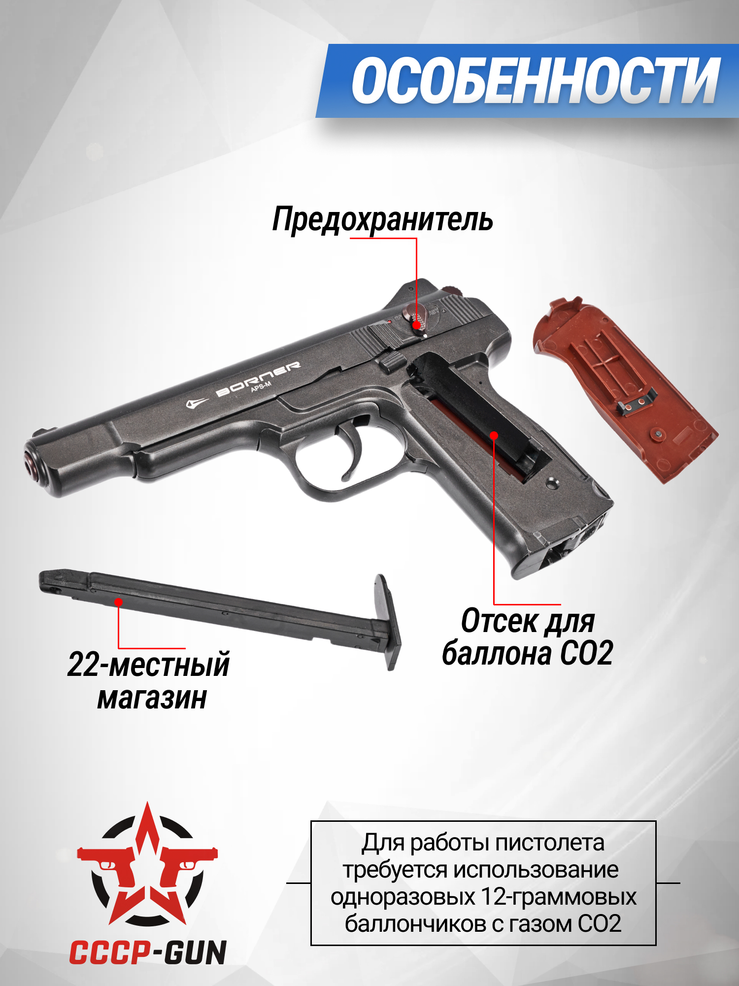 Требуется упомянуть, что Borner APS пневматический классифицируется в нашей стране как изделие, которое имеет конструктивную схожесть с оружием, но таковым не является. Это свидетельствует о свободной покупке пистолета без необходимости в получении специализированной лицензии. Однако, главной особенностью изделия выступает то, что мощностные характеристики модели дают ей при выстреле разгонять пули до 130 метров в секунду.
