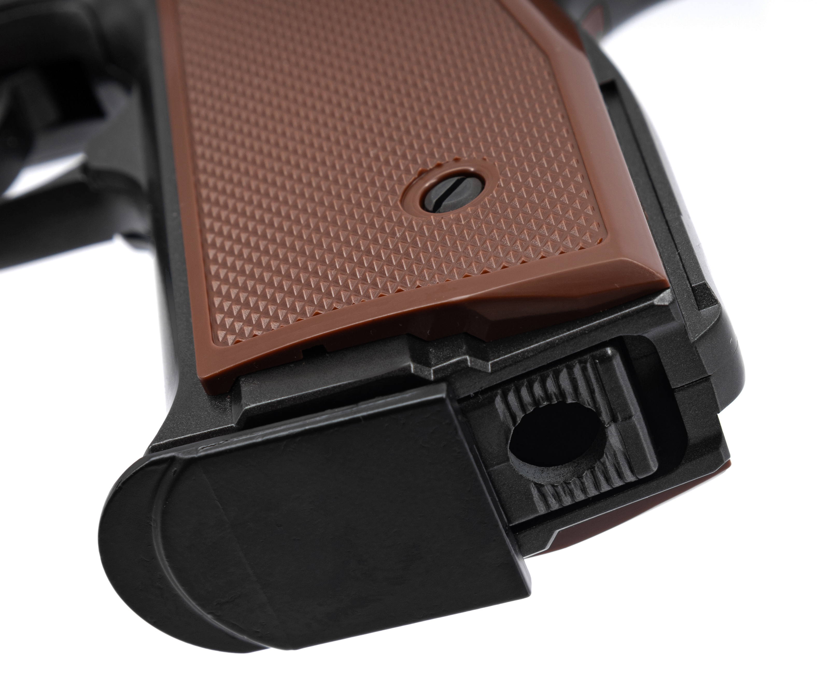 Принцип действия описываемого образца оружия основан на эксплуатации энергии высвобождения газа углекислоты, содержащегося в сменных 12-граммовых баллончиках. Емкость с CO2 размещается в рукояти пистолета и фиксируется в специализированном пропускном клапане с резиновым уплотняющим кольцом, что исключает потери газообразного вещества и обеспечивает постоянные показатели мощности выстрела в нормальных условиях.