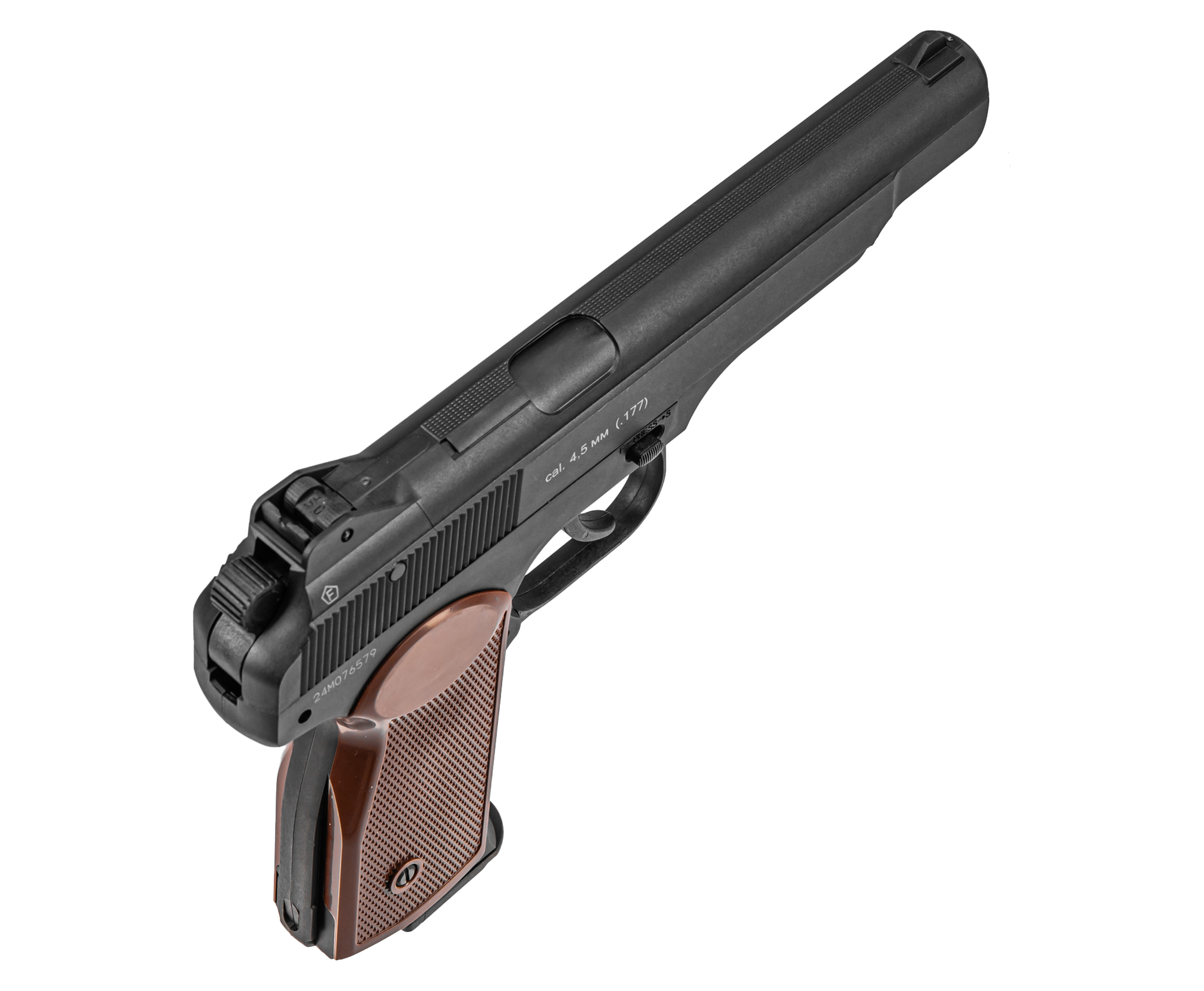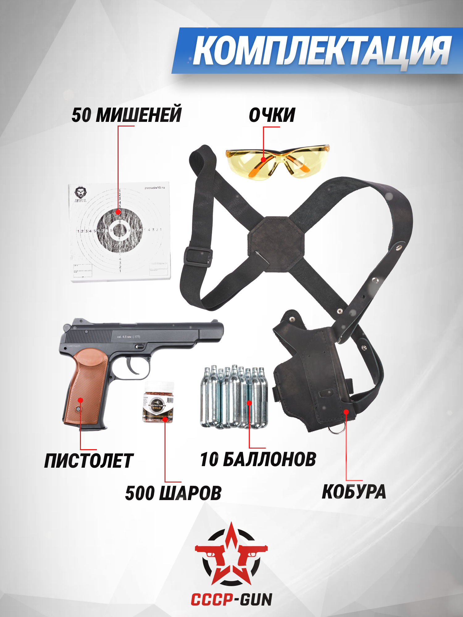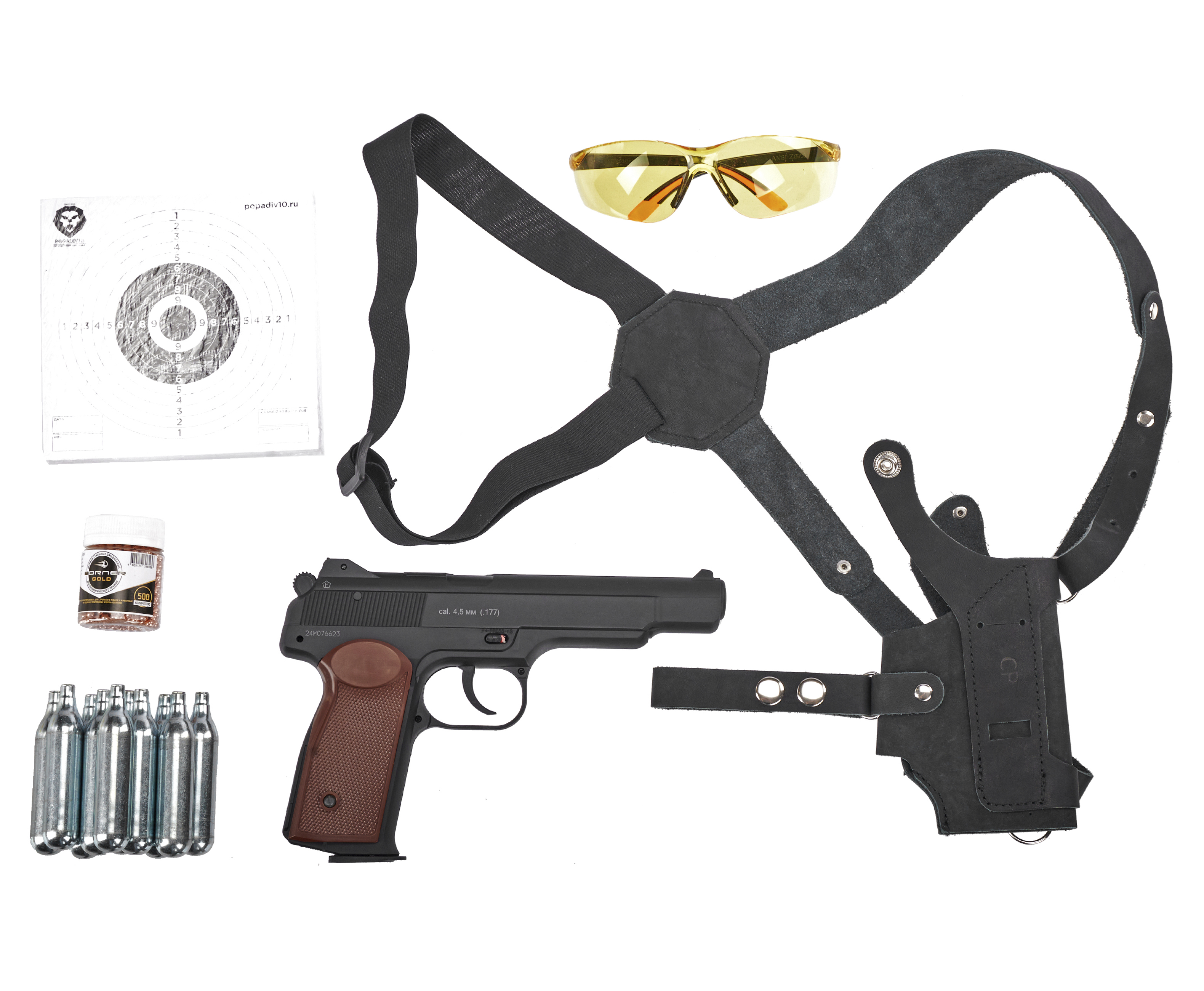 Стрельба ведется в самозарядном режиме, поэтому постоянно взводить ударно-спусковой механизм не потребуется. Также производитель сохранил функцию предохранителя, предотвращающего непроизвольный выстрел из пневматического оружия - переключатель находится справа над спусковым крючком. Помимо боеприпасов и газовых баллонов, комплект также включает кобуру для транспортировки, защитные очки для стрелка и пятьдесят мишеней для тренировок.