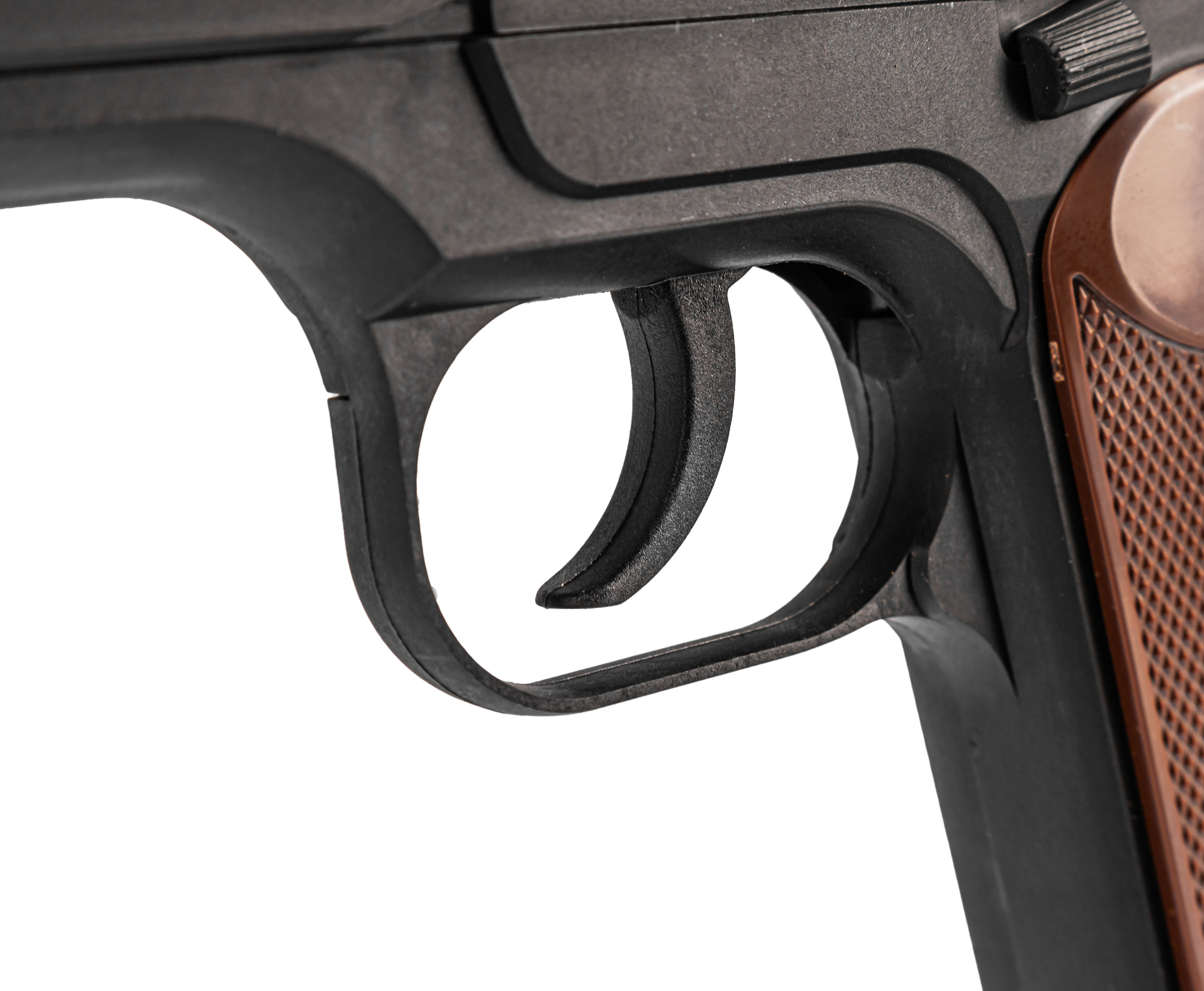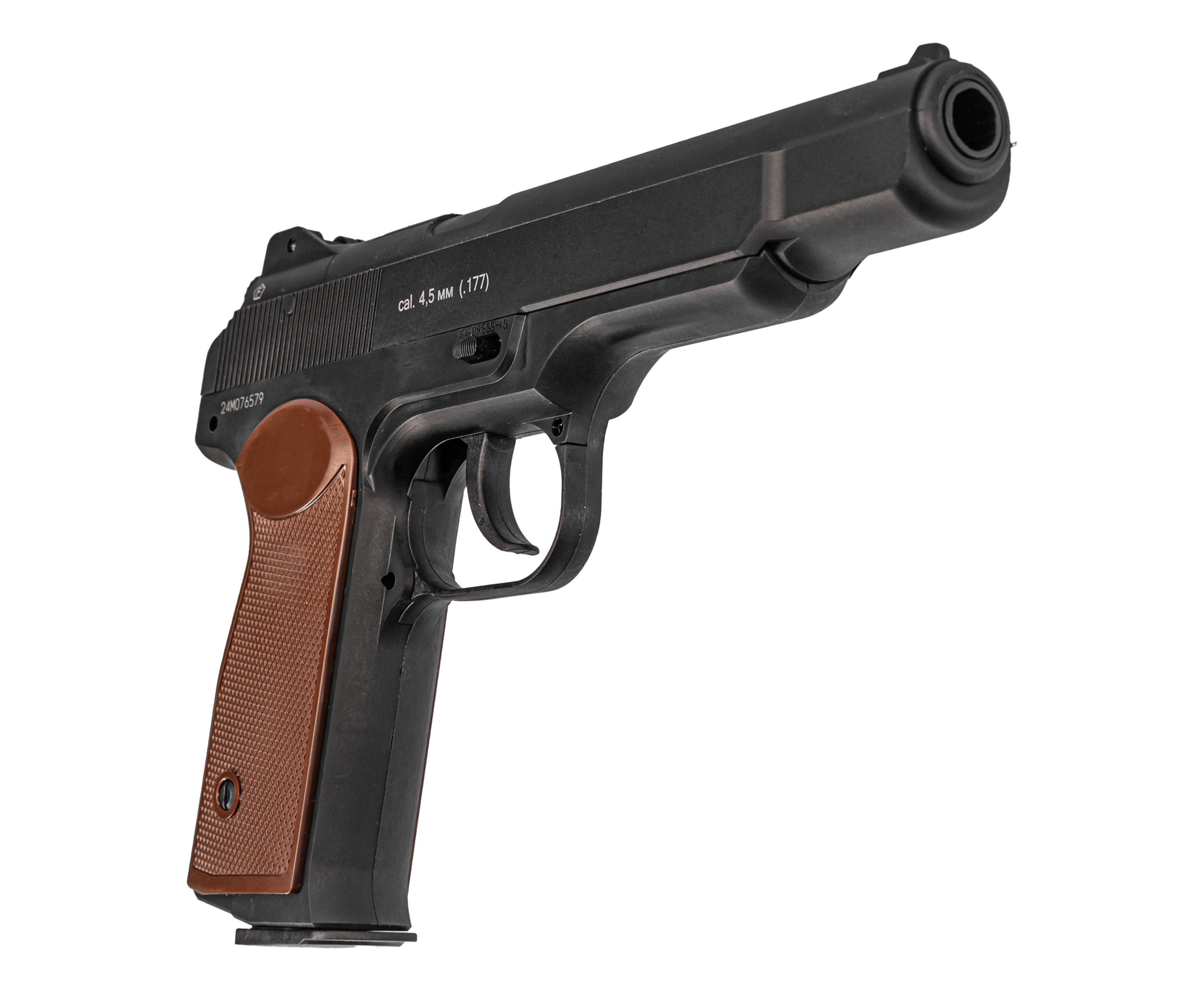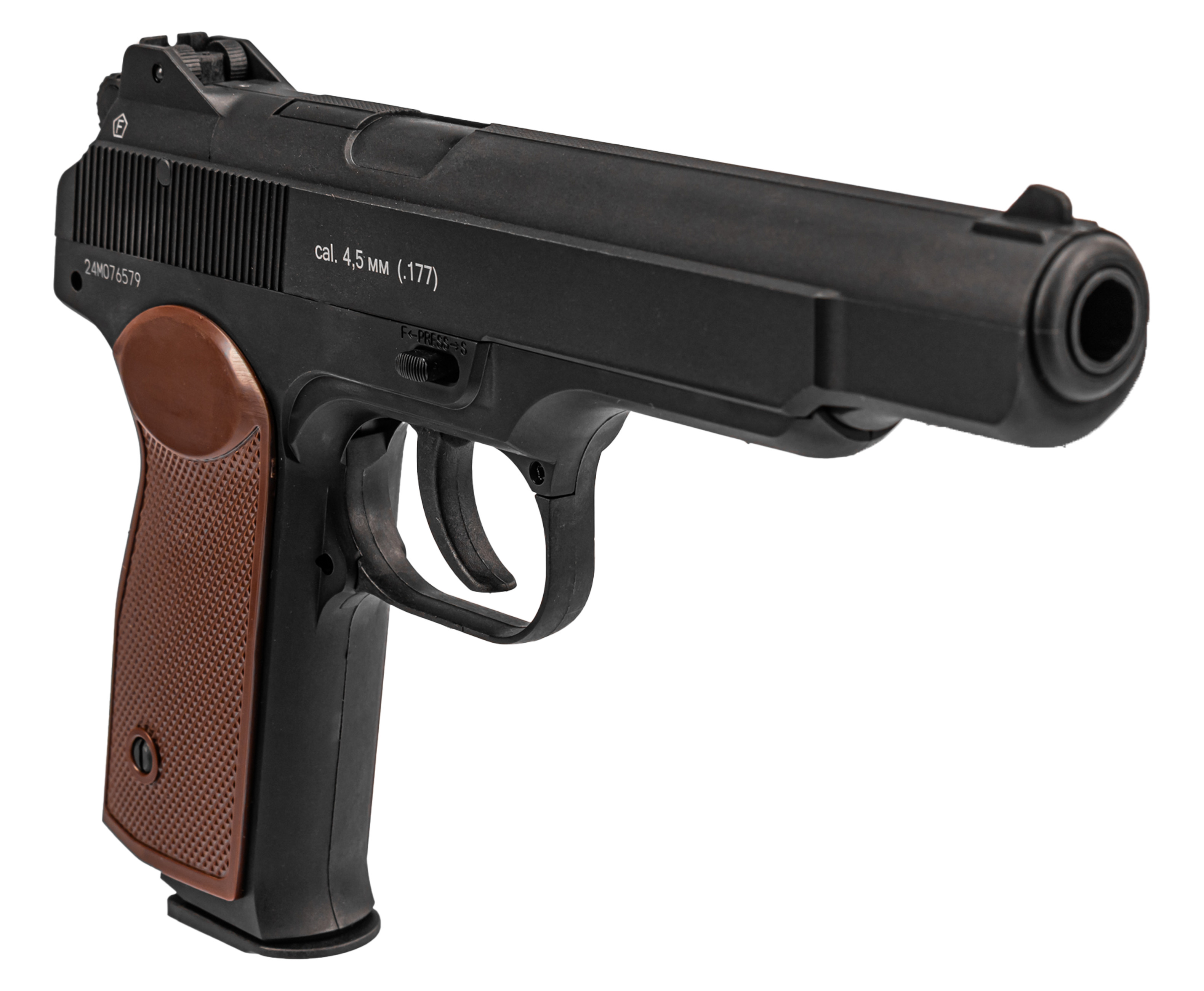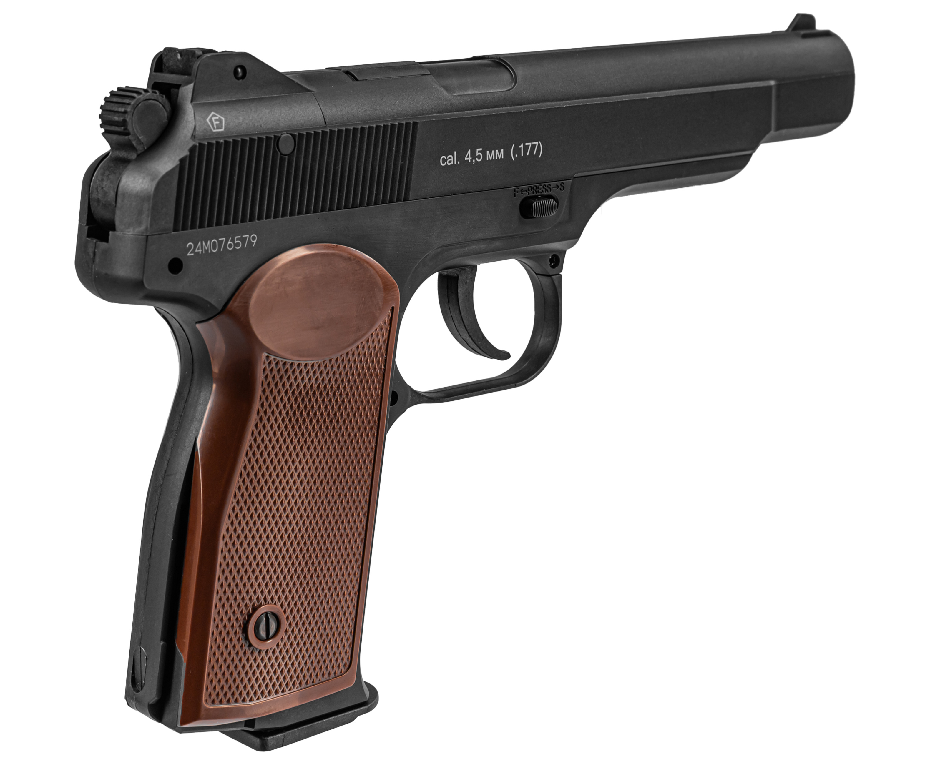 Стрельба ведется в самозарядном режиме, поэтому постоянно взводить ударно-спусковой механизм не потребуется. Также производитель сохранил функцию предохранителя, предотвращающего непроизвольный выстрел из пневматического оружия - переключатель находится справа над спусковым крючком. Помимо боеприпасов и газовых баллонов, комплект также включает кобуру для транспортировки, защитные очки для стрелка и пятьдесят мишеней для тренировок.