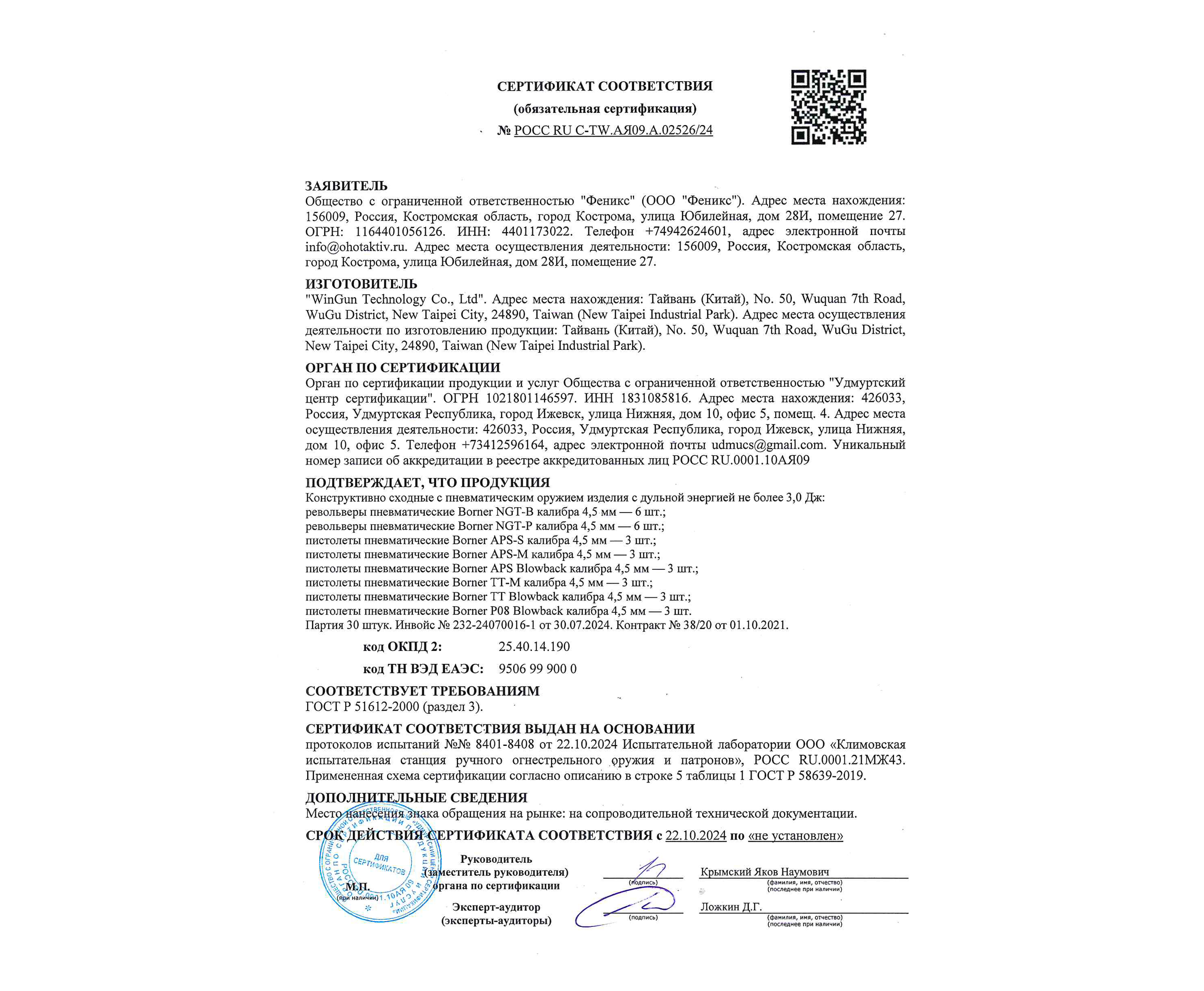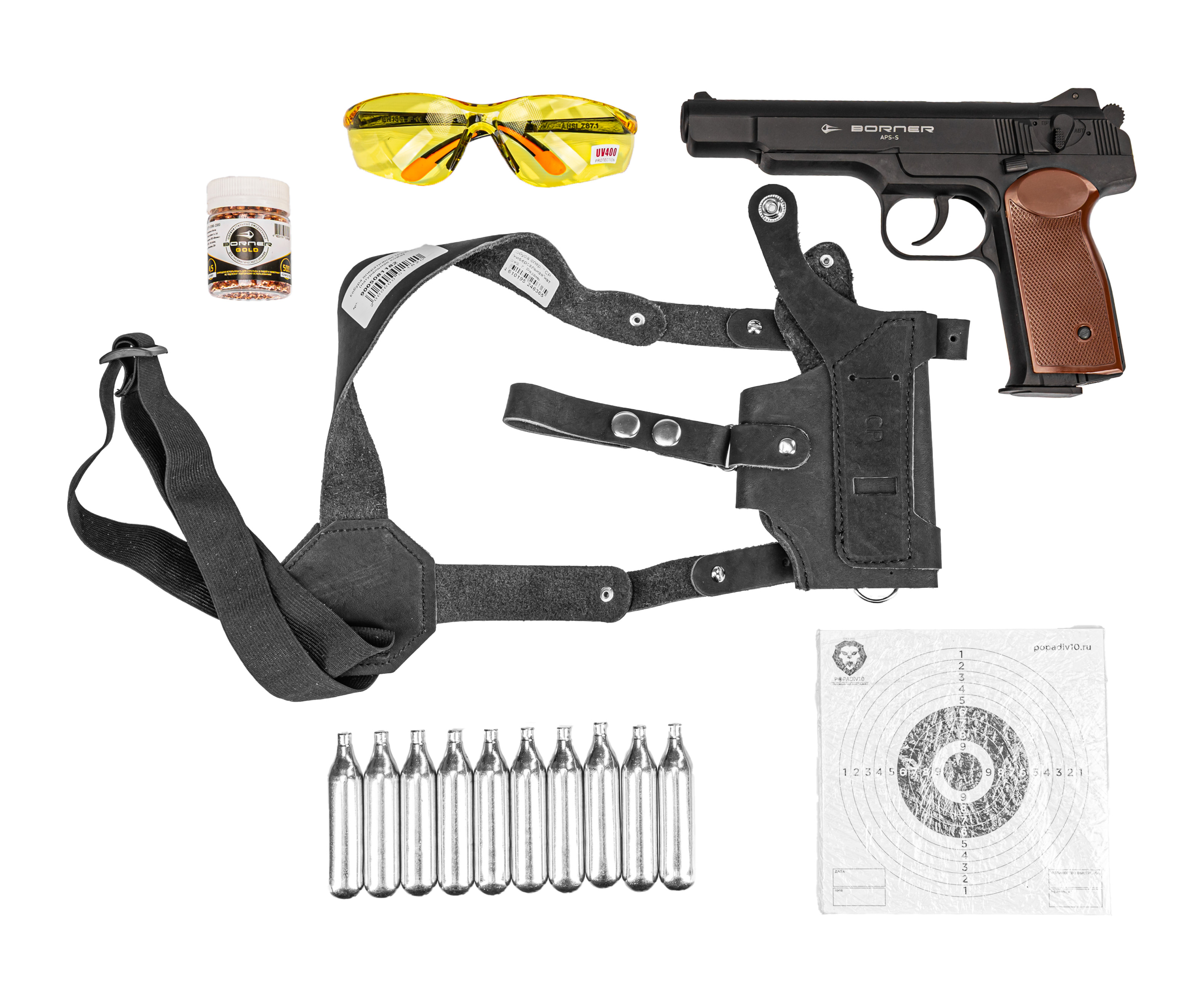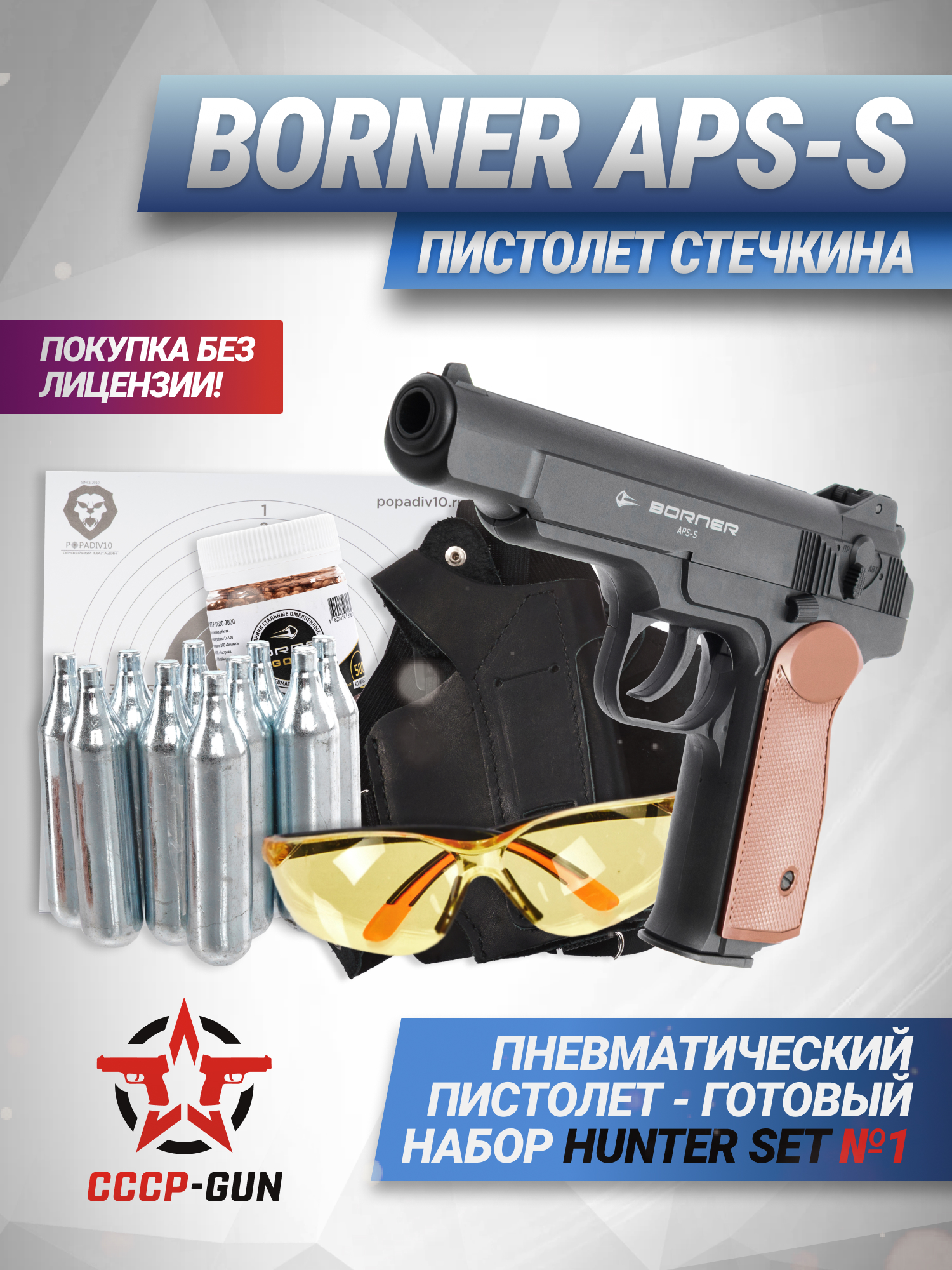Представленный комплект №1 создан на основе популярной среди российских поклонников пневматики модификации - пистолета Стечкина от компании Borner. Прототип экземпляра считается знаковым в истории вооружения - многозарядную автоматическую систему ценили в государственных силовых ведомствах. Разработан прототип в период 1940-1950 гг конструктором И.Я. Стечкиным.