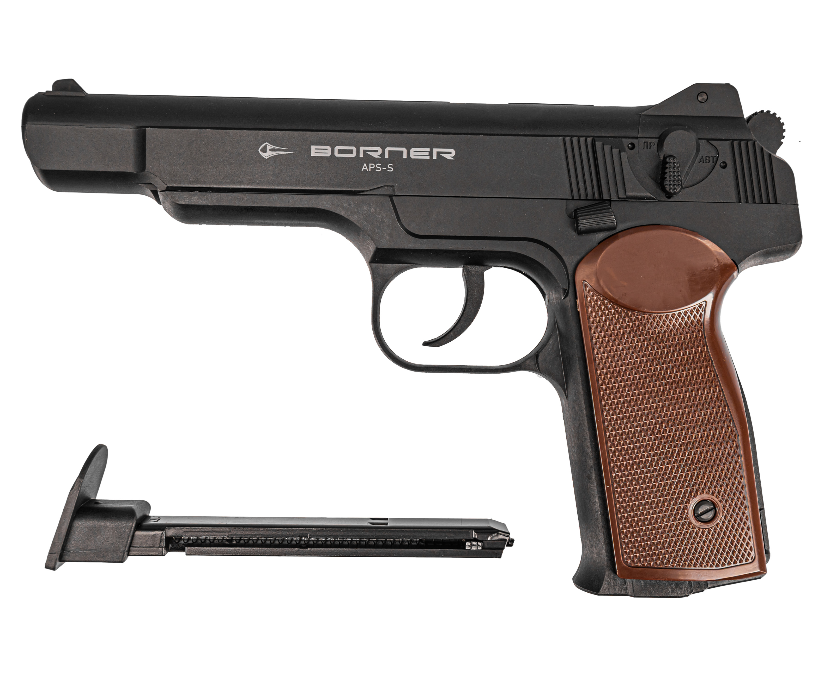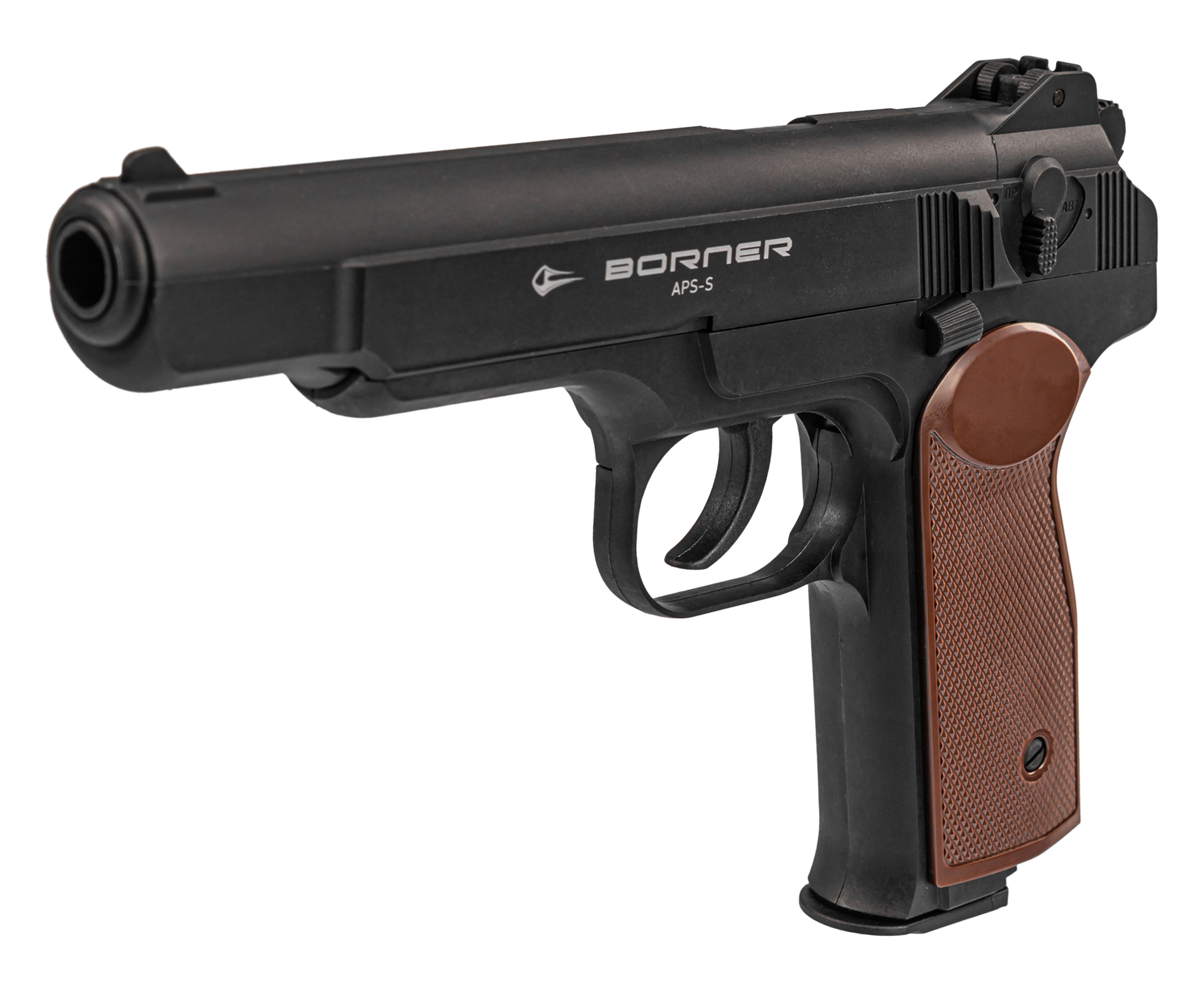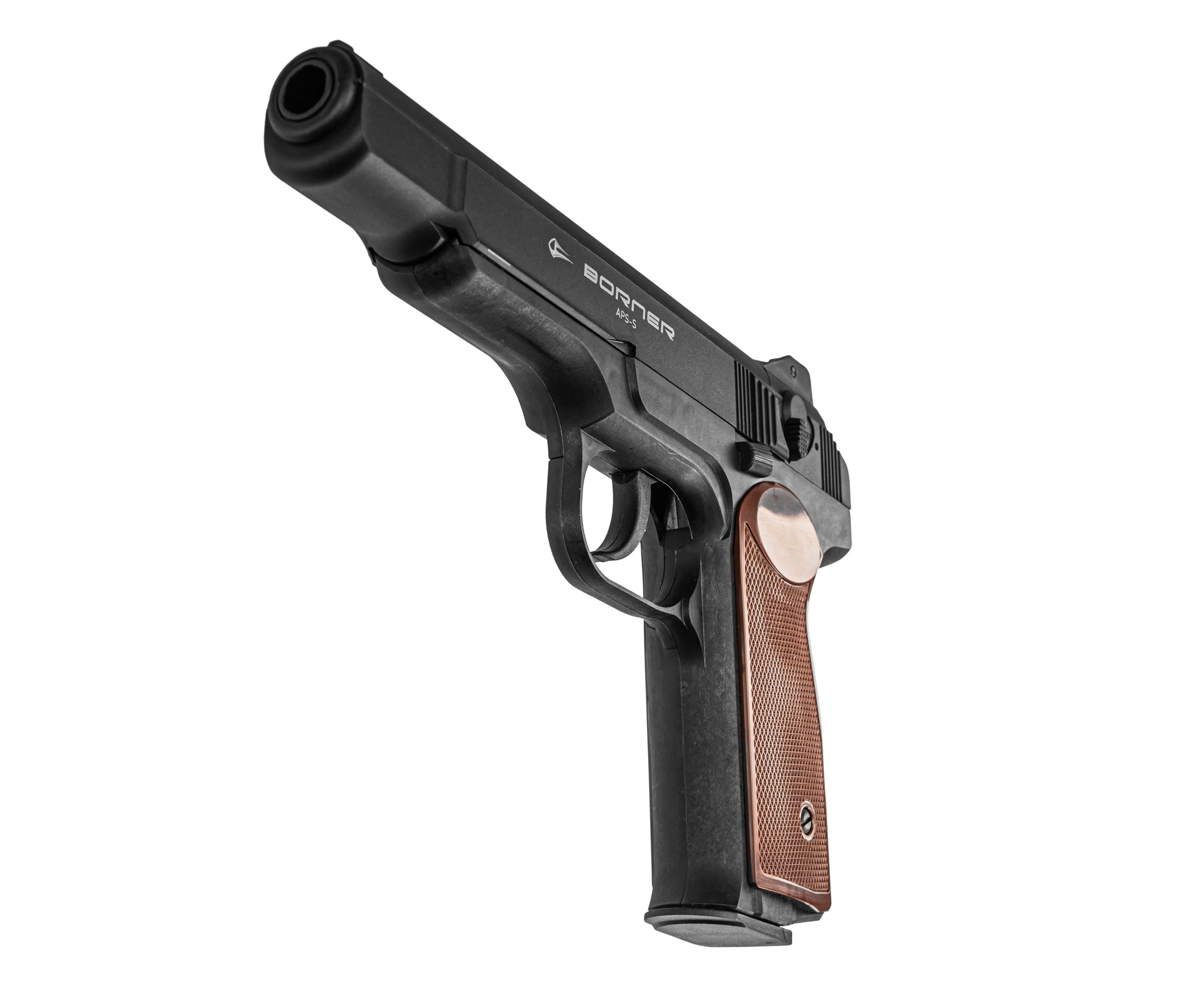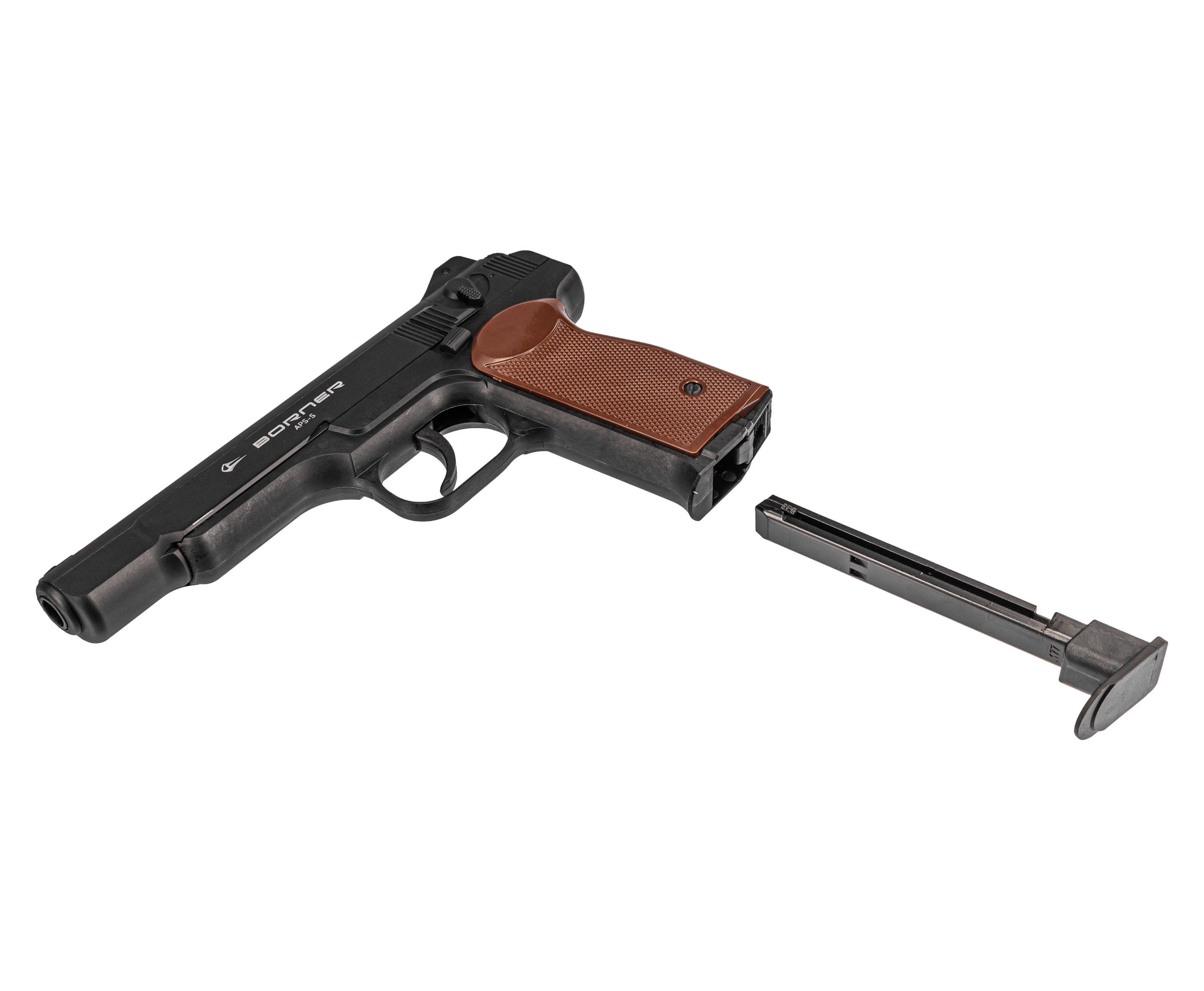Основа пистолета изготовлена из прочного пластика - благодаря такому конструктивному решению удалось уменьшить массу до 480 граммов. По габаритам представленный пневматический Borner идентичен боевому образцу - полная длина последнего и описываемой модели составляет 225 миллиметров.