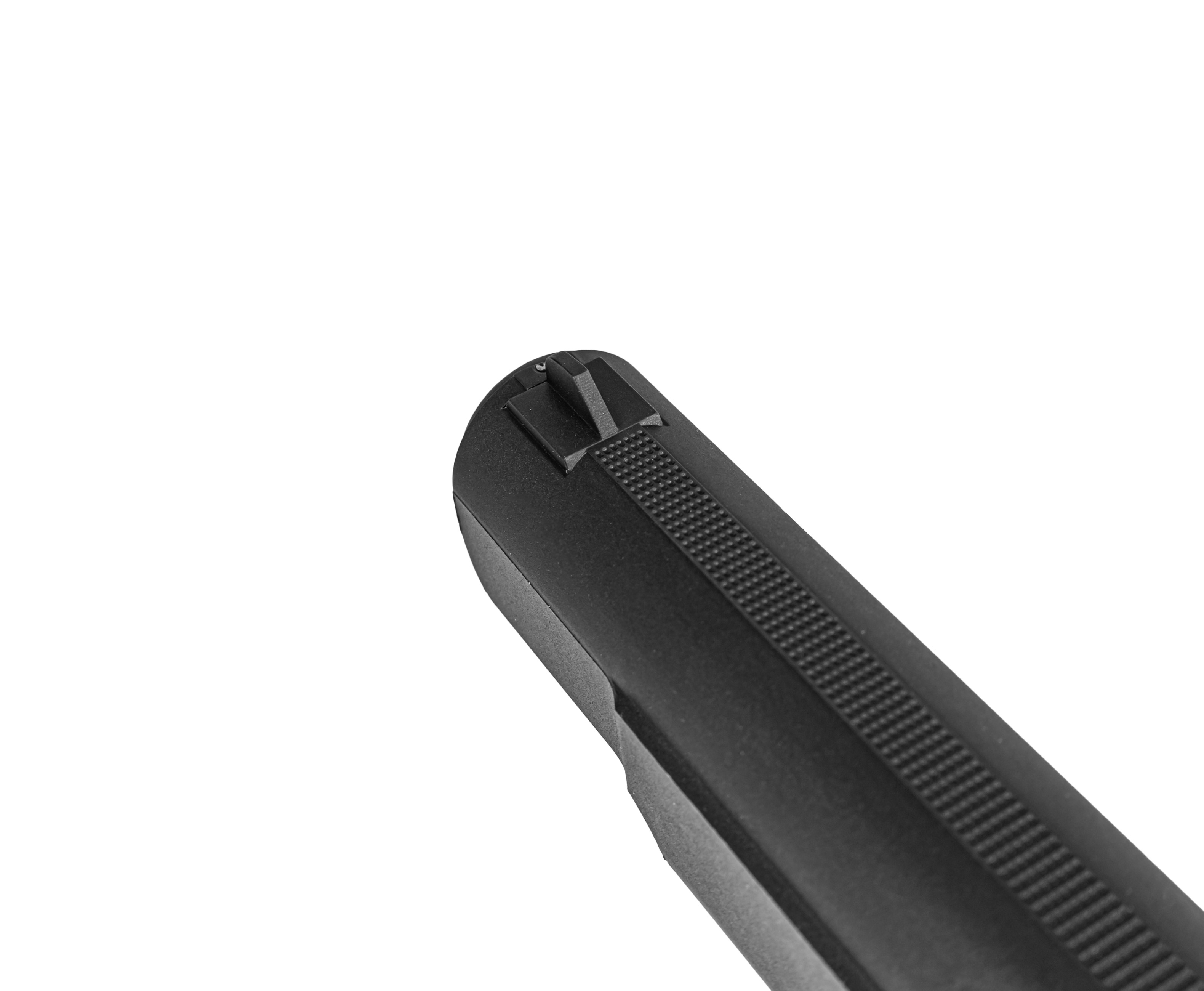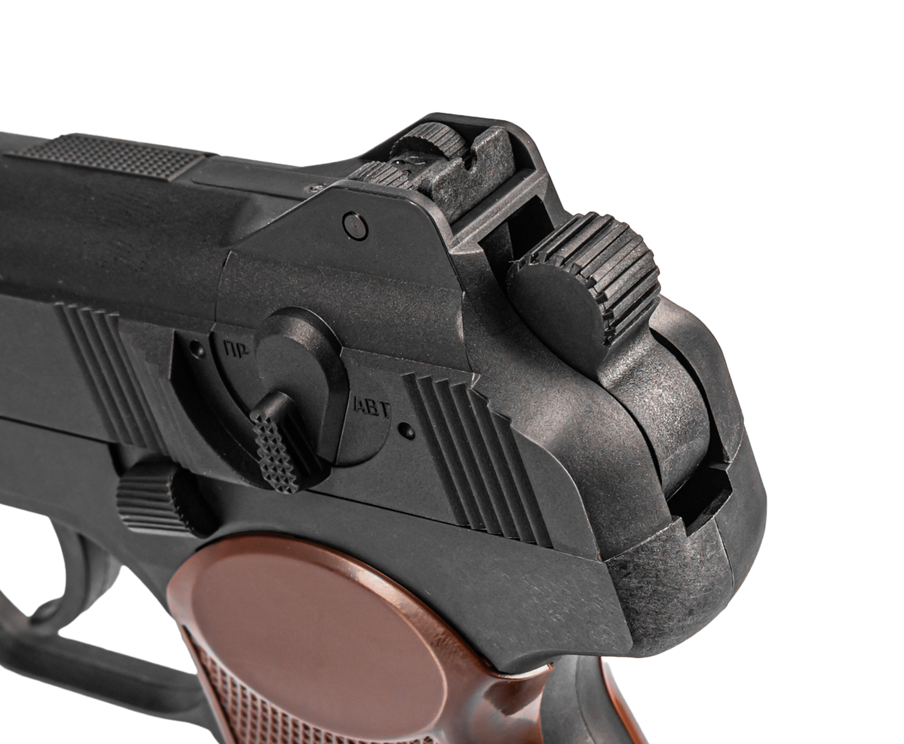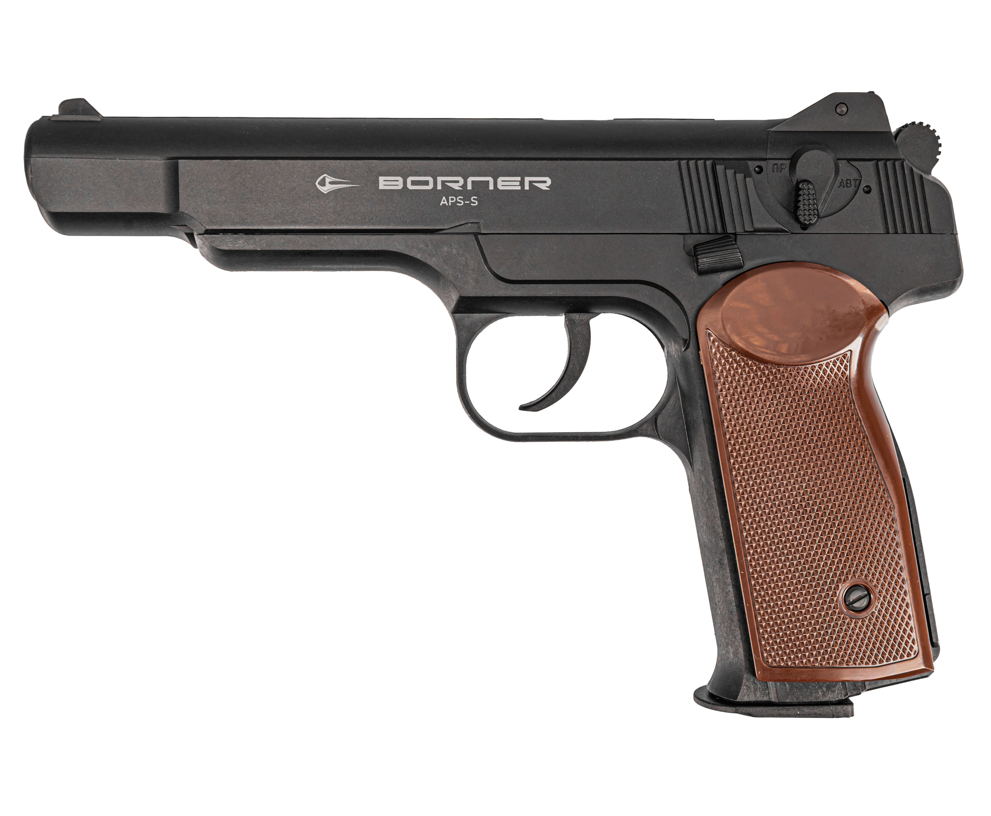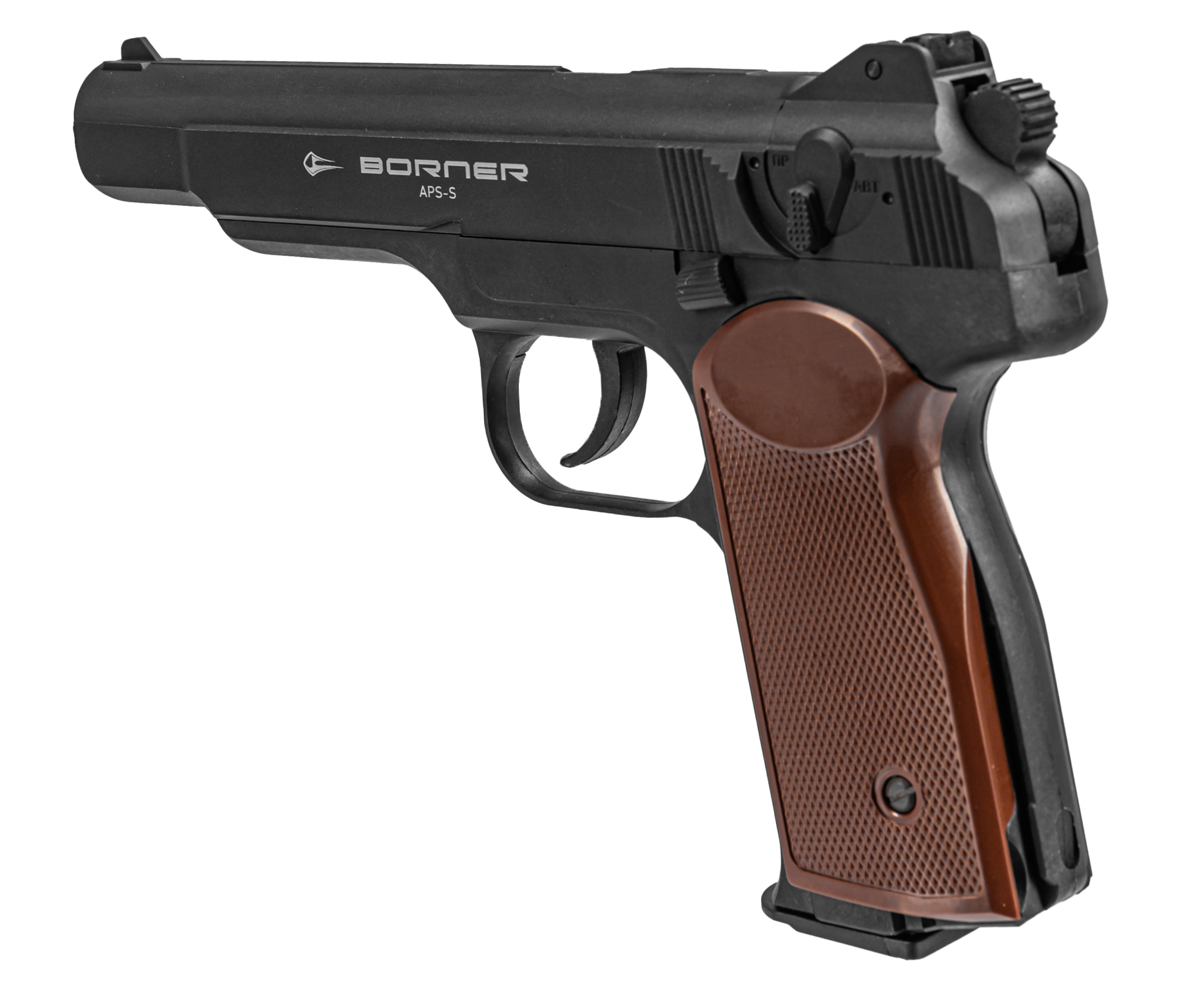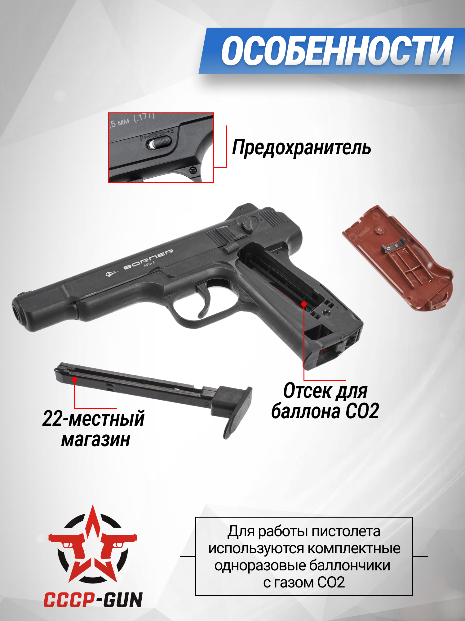 Основа пистолета изготовлена из прочного пластика - благодаря такому конструктивному решению удалось уменьшить массу до 480 граммов. По габаритам представленный пневматический Borner идентичен боевому образцу - полная длина последнего и описываемой модели составляет 225 миллиметров.