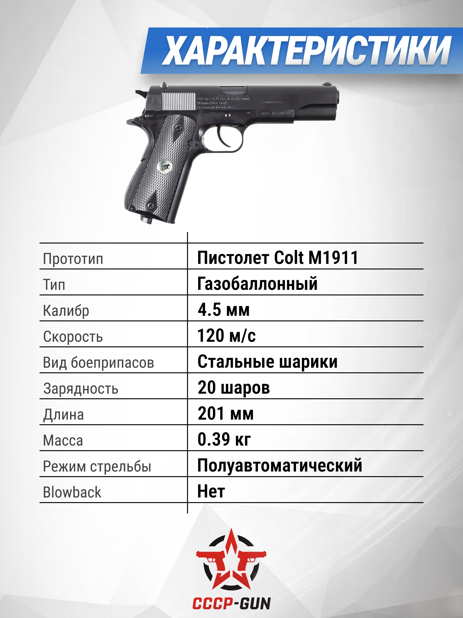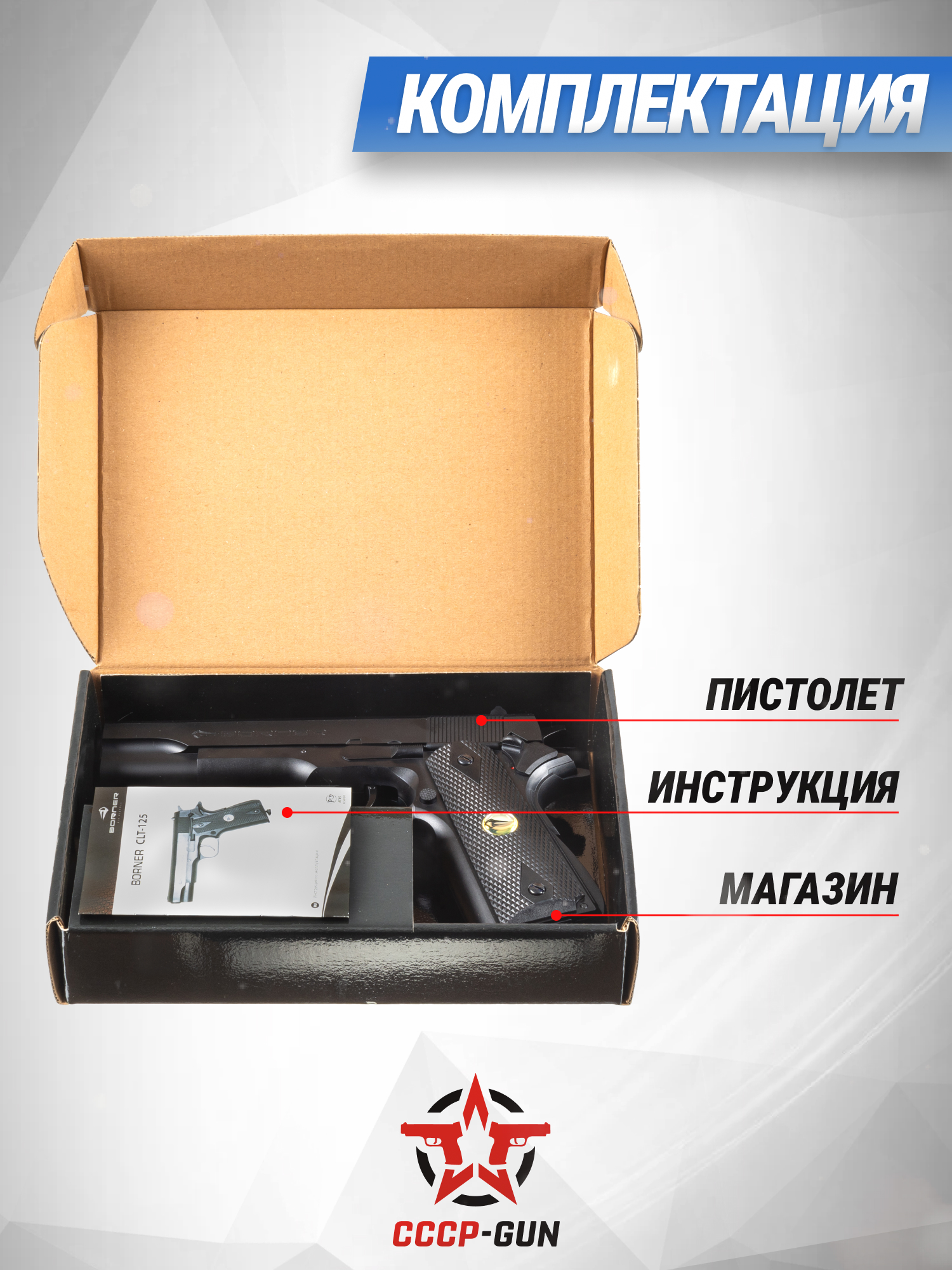 Пистолет пневматический Borner CLT125 изготовлен из прочного полимерного материала, благодаря чему масса изделия равна 0.38 кг, а внутренние детали сделаны из металла для увеличения ресурса службы. При создании этой модели проектировщики опирались на внешний вид легендарного Colt 1911, который прочно укоренился в культуре за счет демонстрации в компьютерных играх и фильмах. Полные габариты пневматики составляют комфортные 220 миллиметров, а классическая пистолетная рукоять с текстурными накладками помогает удобно удерживать оружие в руках.