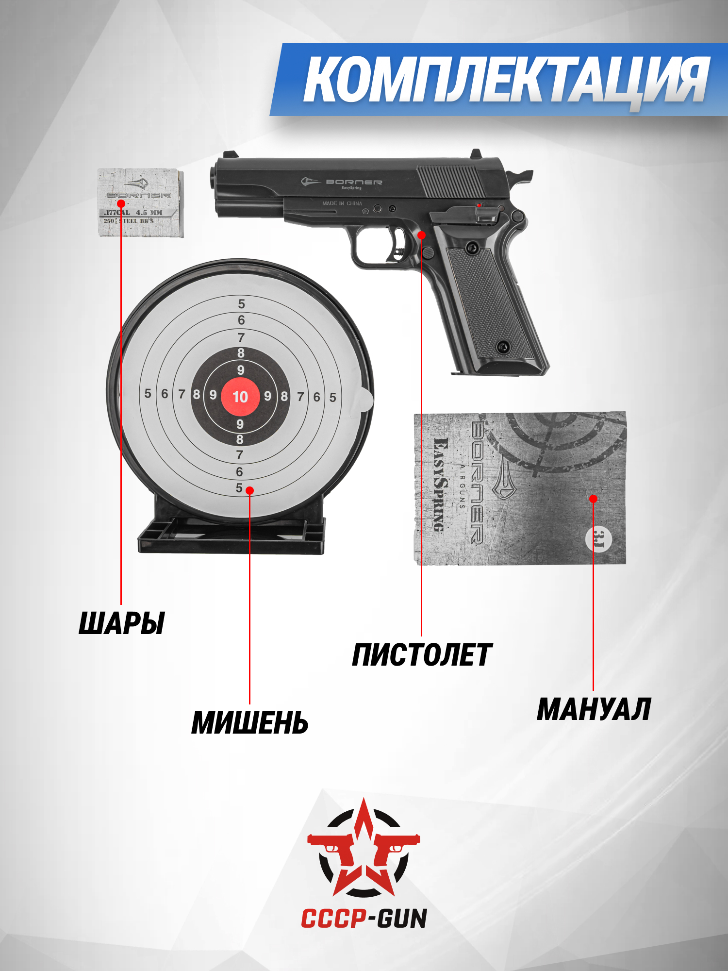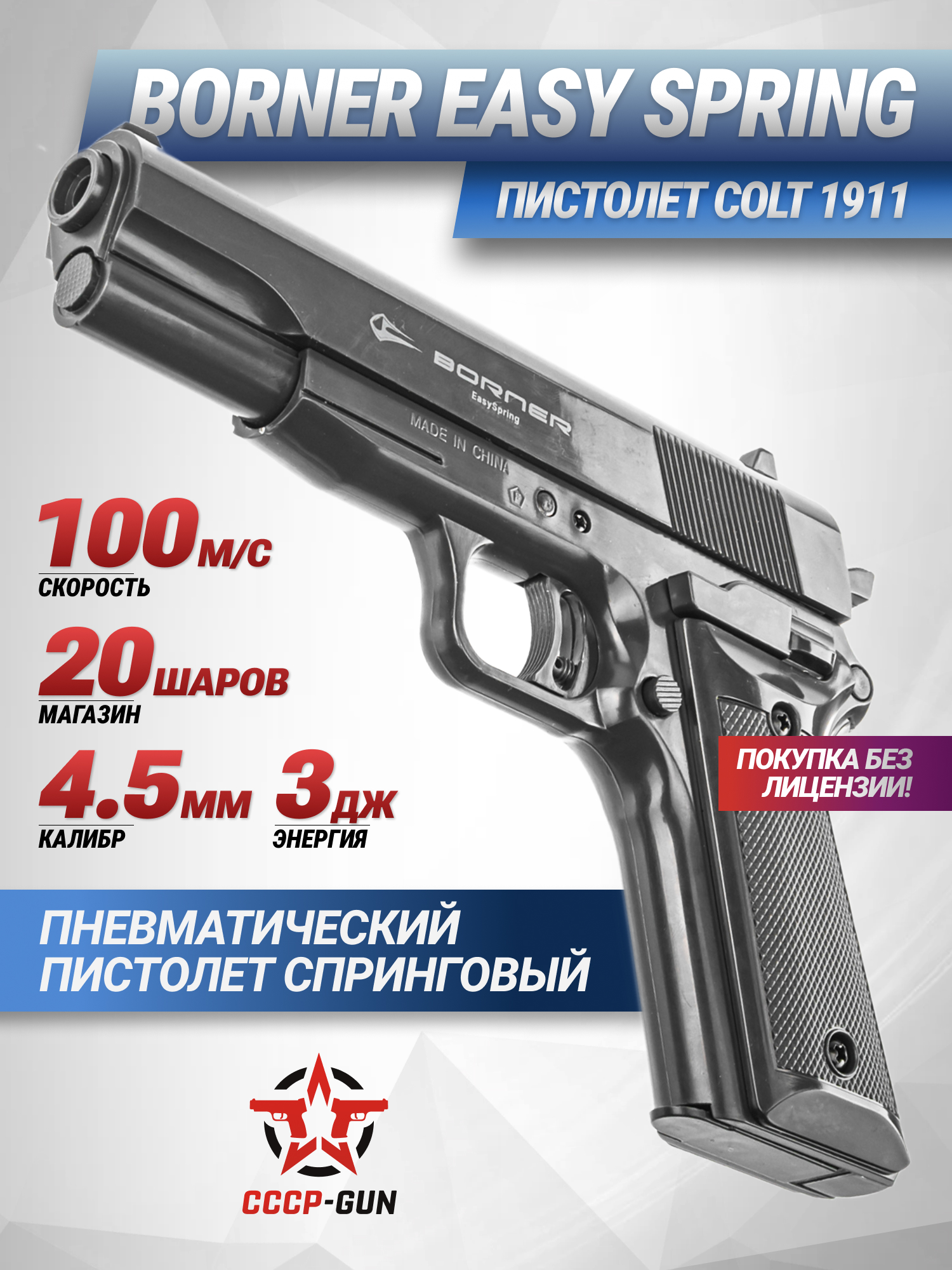 Модель Easy Spring 4.5 миллиметра представлена компанией Борнер - облик этому образцы подарил 1911 пистолет Кольт, классика, не нуждающаяся в представлении. Предприятие внесло в общий вид несколько изменений, что улучшило удобство обращения с пневматическим пистолетом. Конструктивно этот экземпляр прост, что повысило его надежность.
