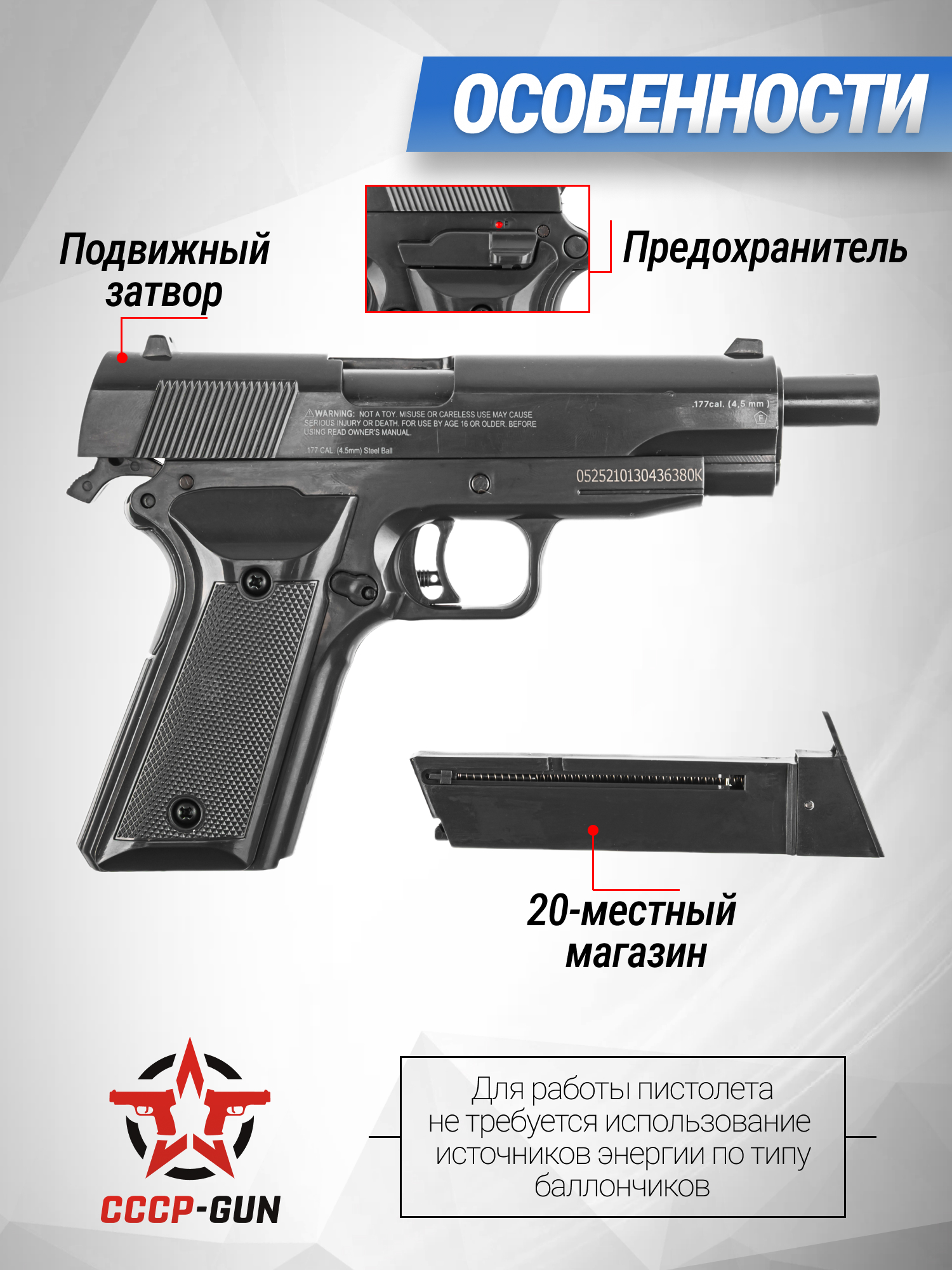 Также для стрельбы потребуются пульки, в роли которых тут выступают металлические шары 4.5 мм - представленный боеприпас считается наиболее распространенным ввиду его дешевизны, что делает тренировки дешевле. В отъемный магазин пистолета войдет до 20 зарядов - соответственно пользователю придется реже отвлекаться на дозарядку. Этот элемент съемный - для извлечения необходимо нажать на кнопку, расположенную в рамке.