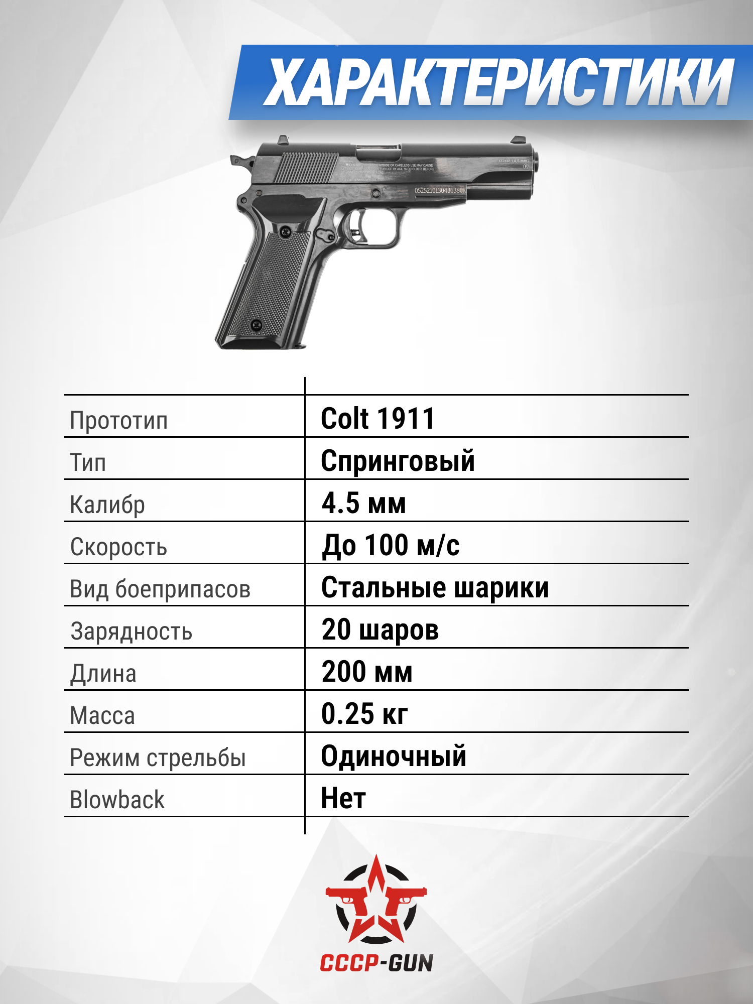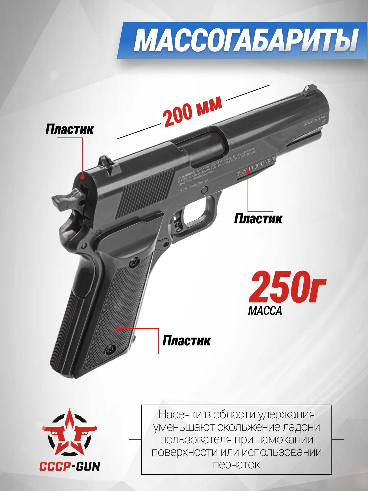 Colt 1911 пневматический примечателен и качеством изготовления - затвор и рамку здесь выполняют из пластика и металла, что придает корпусу надежности. Вместе с этим материалы позволили снизить вес конструкции до 250 грамм. Щечки на рукоятке также изготавливают из пластика для комфорта удержания изделия в холодную погоду.