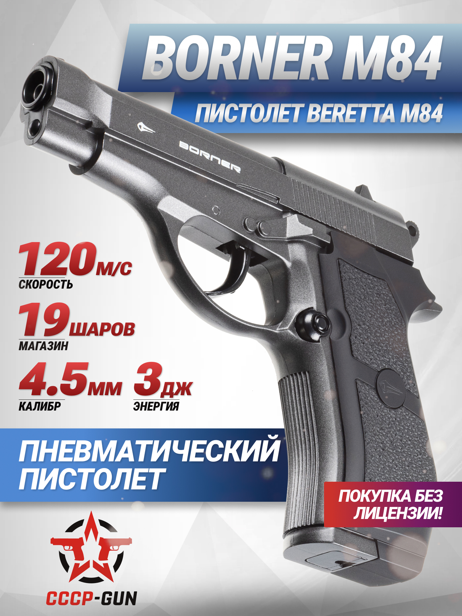 Магазин модели Борнер М84 вмещает до 19 шариков, а его извлечение происходит после нажатия на кнопку с левой стороны рукояти. Для защиты стрелка и окружающих людей в конструкции присутствует двухпозиционный предохранитель с дополнительным фиксатором. Такая конструкция исключает моменты случайного перевода пистолета в режим стрельбы, следовательно, повышается класс безопасности изделия.