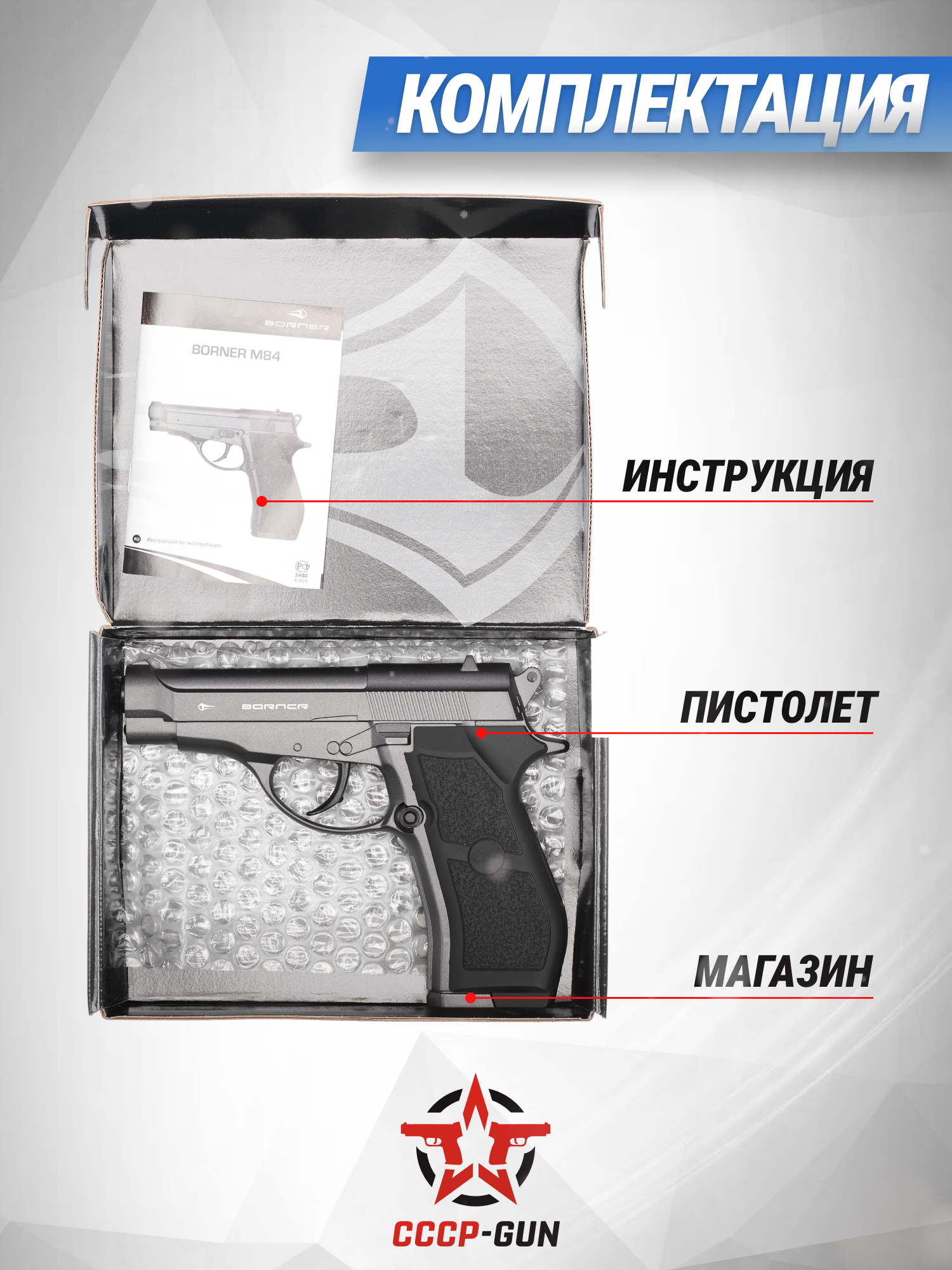 Корпус и затворная рама модели выполнены из металла, поэтому вес изделия равен 710 граммам и повторяет массу пистолета Beretta M84, дизайном которого вдохновлялись инженеры компании Borner. Полные габариты пневматики составляют 17.5 сантиметров, благодаря чему этот экземпляр комфортно лежит в руках, а противоскользящие накладки помогают уверенно удерживать оружие во время динамичной работы.