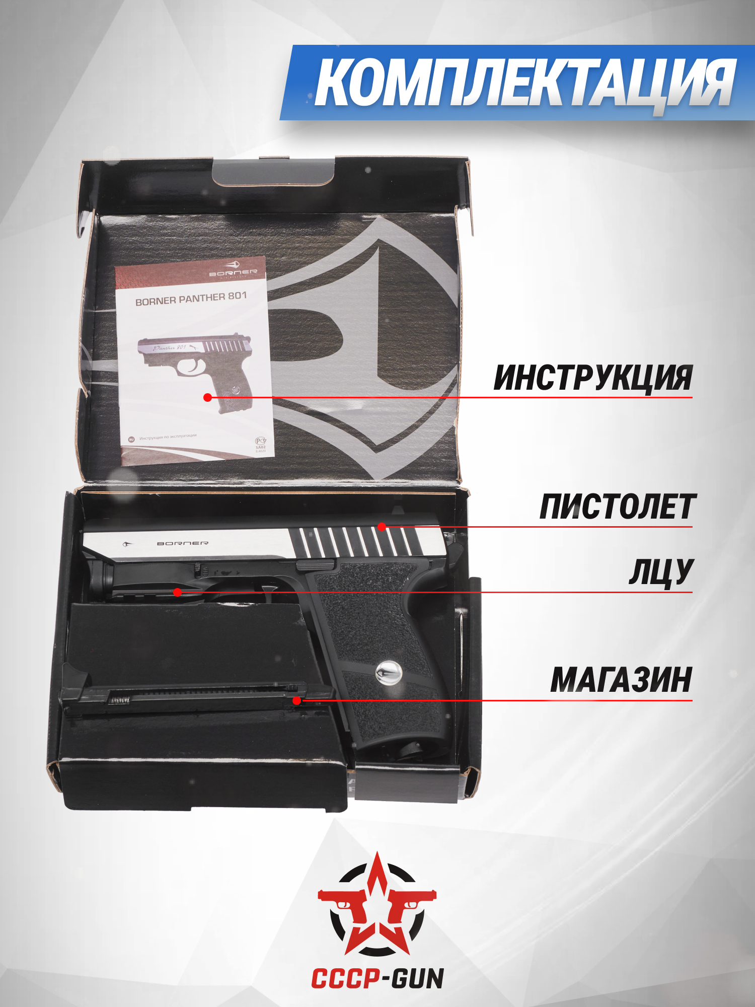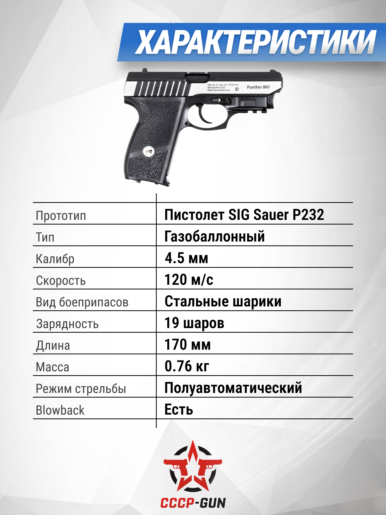 Борнер Пантера 801 под калибр 4.5 мм использует в качестве боеприпасов стальные шарики, которые заряжаются в магазин на 19 пуль. Так как пистолет оснащен гладким металлическим стволом, точная стрельба ведется на расстоянии до пятнадцати метров, что считается хорошим показателем для подобной пневматики с механическими прицельными приспособлениями. Важно отметить, что после того как пользователь отстреляет боезапас, механизм изделия встает на затворную задержку.