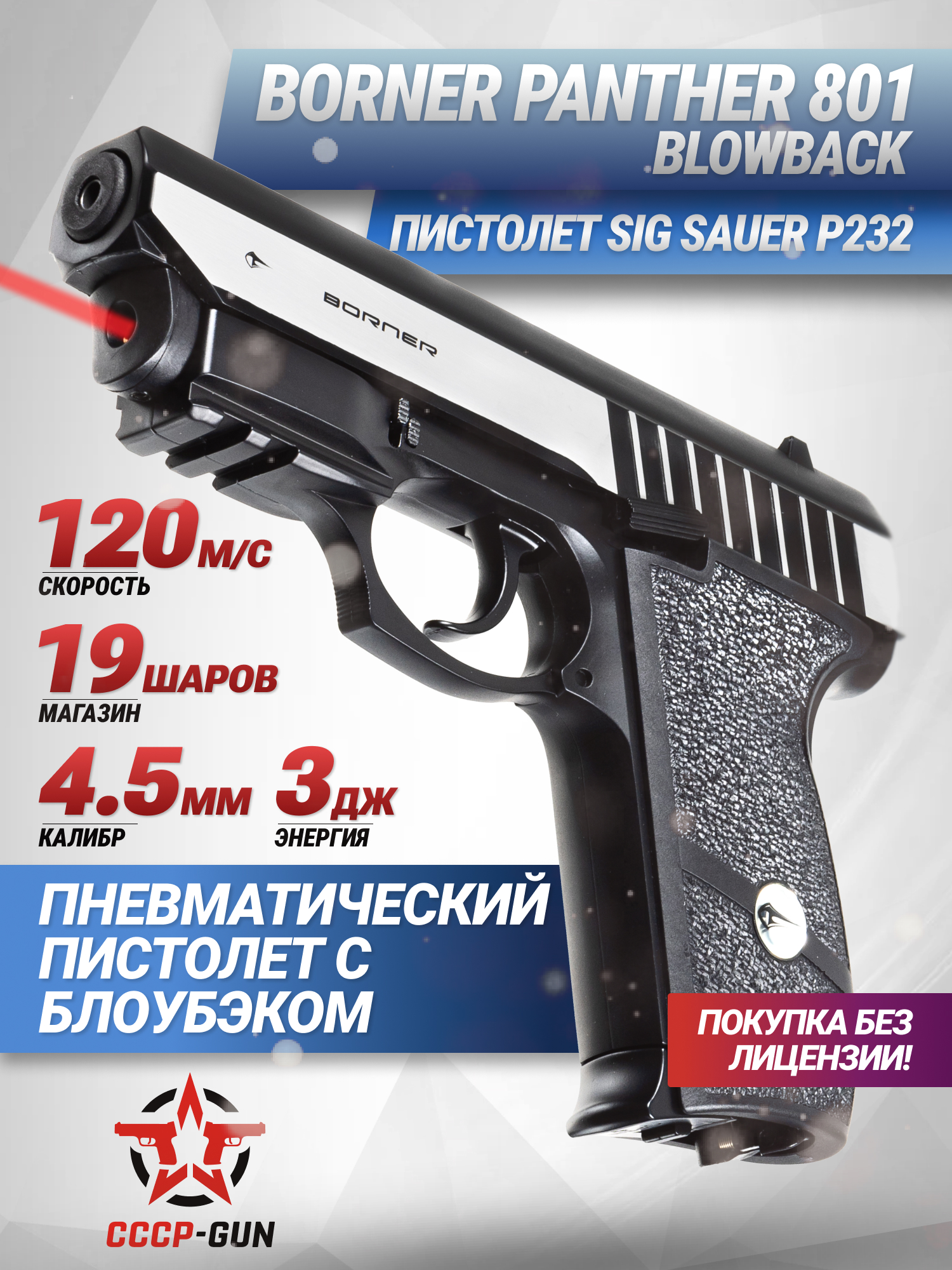 Скорость полета снаряда при выстреле достигает 120 метров в секунду, а дульная энергия не превышает значения в 3 J. Исходя из этих характеристик можно отметить то, что покупать изделие имеет право любой совершеннолетний гражданин РФ, так как оформлять дополнительные разрешения на пистолет не потребуется. Таким образом компания Borner делает пневматику доступнее для тренировок новичков и любителей развлекательной стрельбы.
