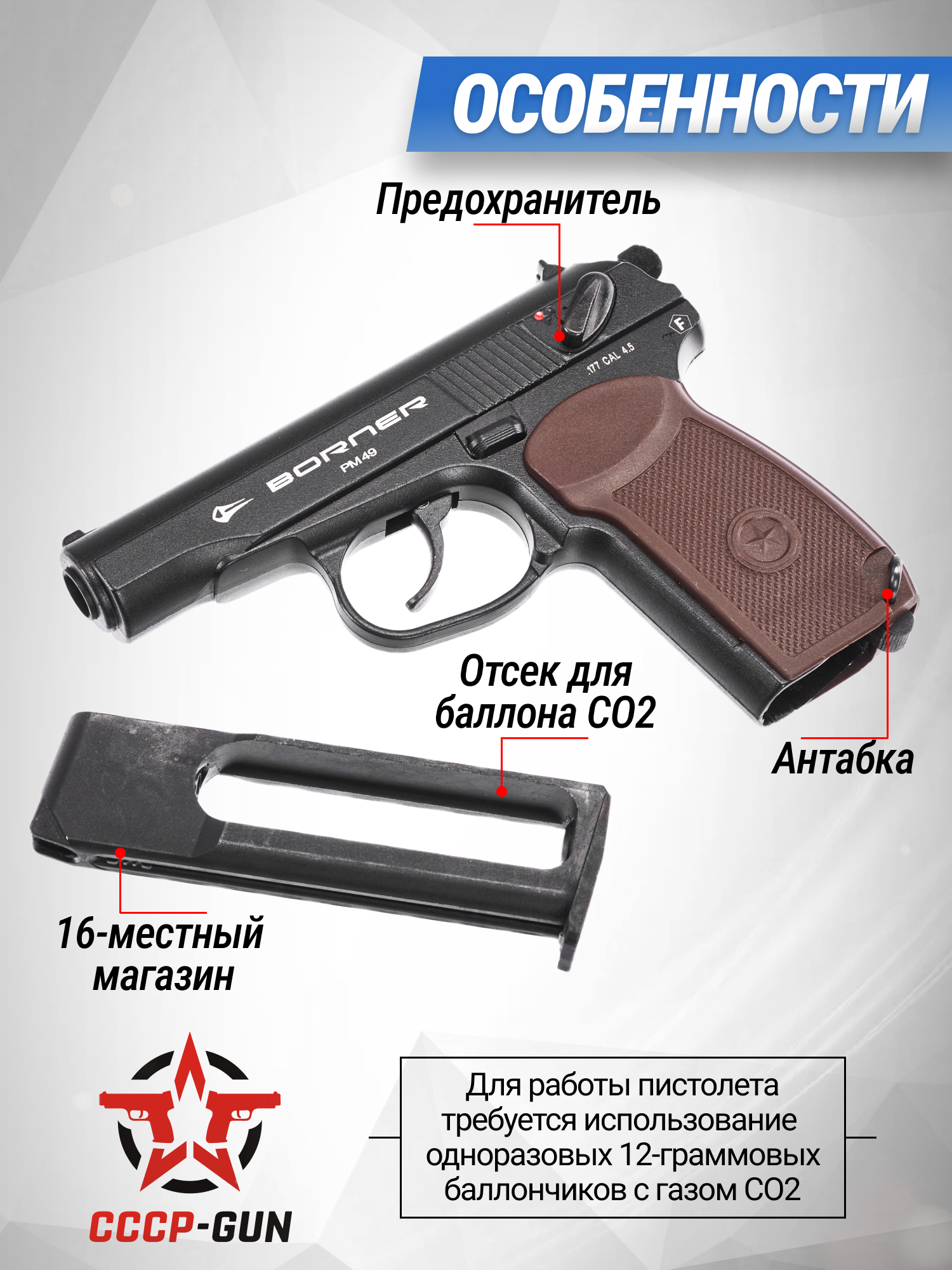 Пневматический пистолет Борнер ПМ 49 построен на использовании СО2 баллончиков объемом 12 грамм, которые обеспечивают эксплуатацию без необходимости ручной подкачки или применения внешнего источника воздуха. Устройство оснащается полноразмерным магазином на 16 стальных шариков калибра 4.5 мм, этого хватит на полноценную прицельную серию. В этот же элемент боепитания устанавливается резервуар с углекислым газом.