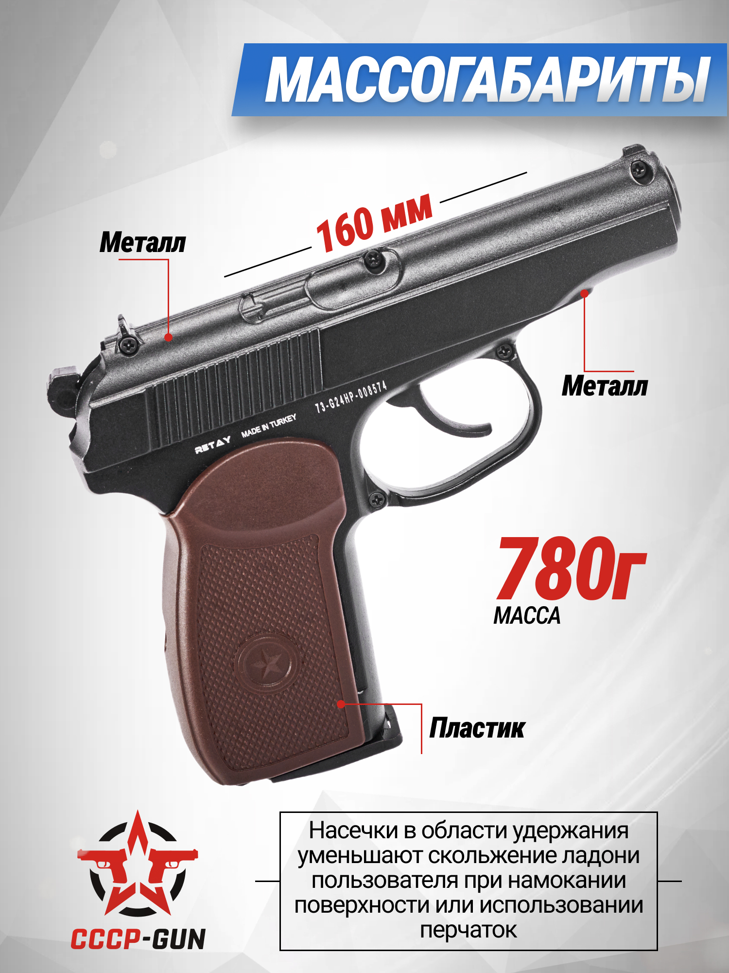 Длина модели составляет 160 мм, а вес - 0.78 кг. Эти параметры схожи с подлинным ПМ, что способствует удобству практической эксплуатации и сохранению привычной балансировки при стрельбе. Благодаря компактным размерам, Борнер PM 49 легко переносить в поясной кобуре или держать в руке при прицеливании.