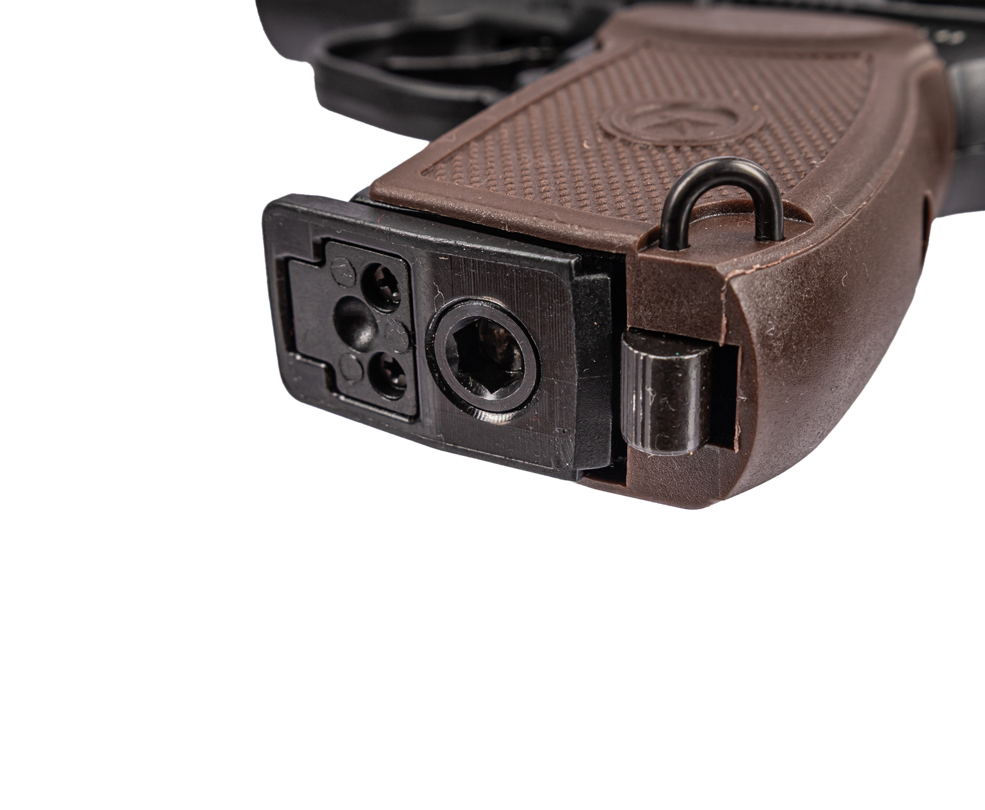 Корпус Borner PM 49 сочетает металлическую раму с полимерными накладками на рукоять коричневого цвета, которые выполнены с текстурированной поверхностью. Такое решение не только улучшает удержание оружия в руке, но и делает образ устройства еще больше похожим на настоящий Макаров.