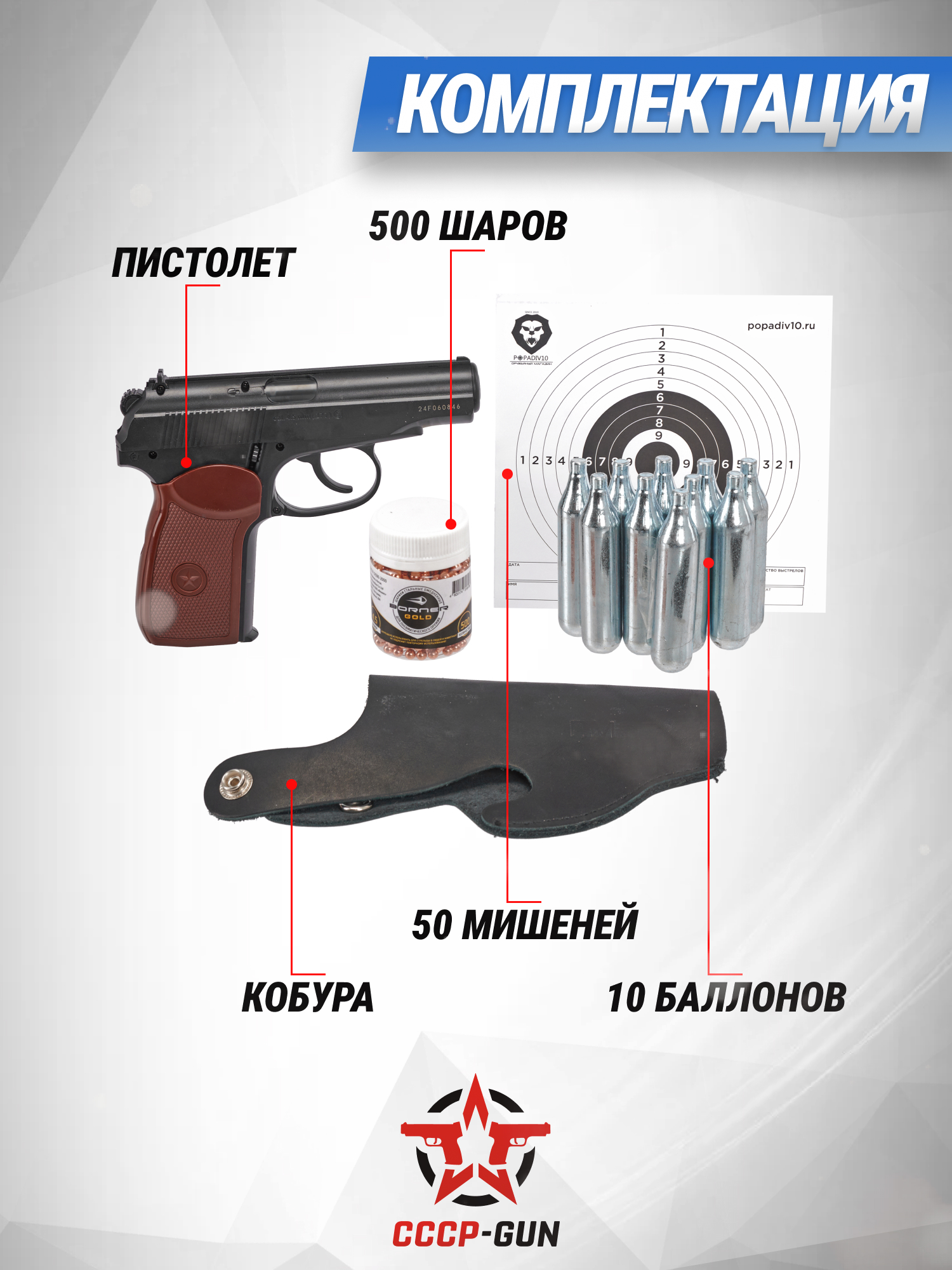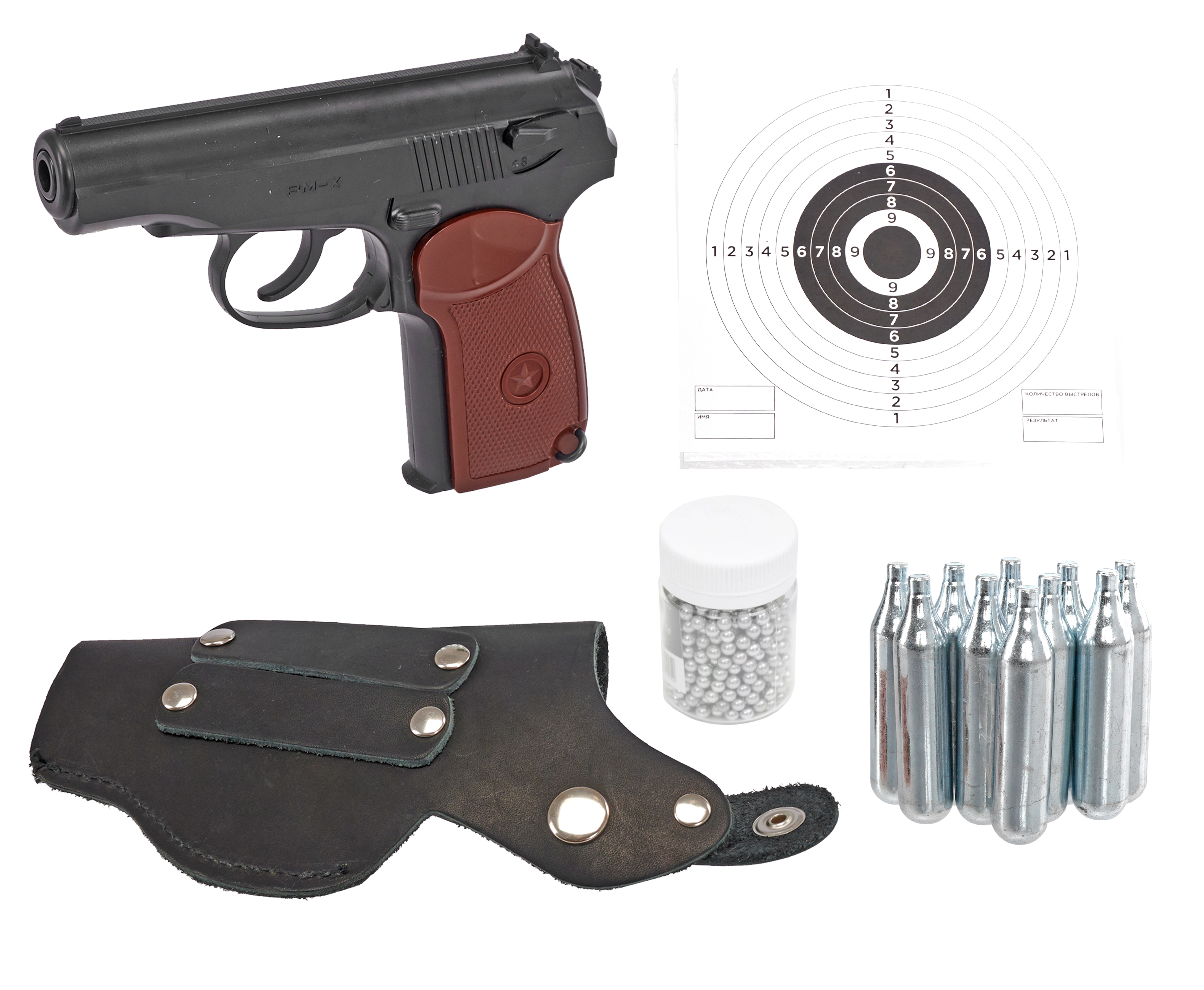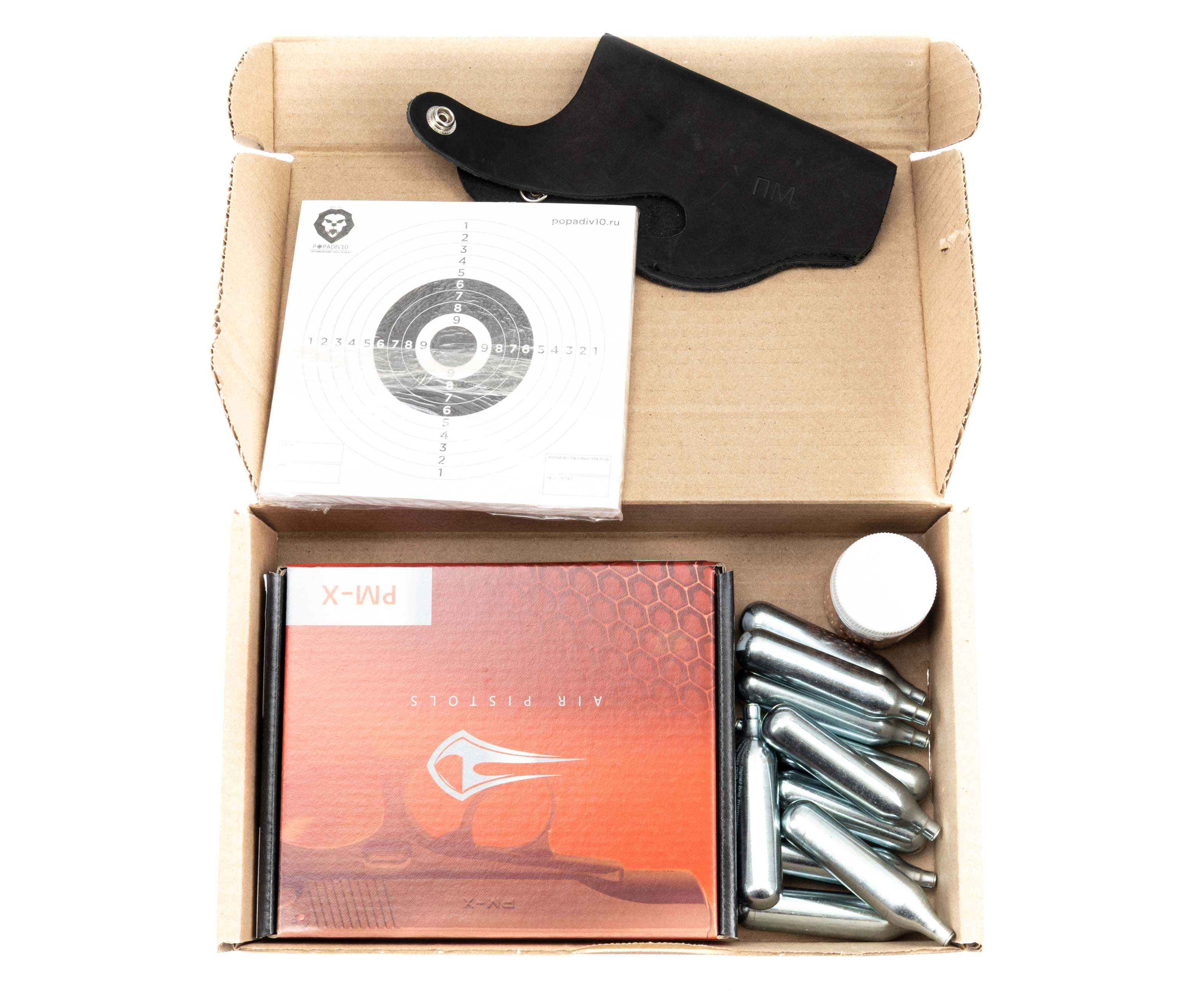 Подарочный комплект Борнер ПМ Х включает в себя все необходимое для использования изделия сразу из коробки. В наборе присутствует 500 стальных шариков и 10 баллончиков с CO2 на 12 грамм, которые выступают в роли источников энергии. Вскипая углекислота внутри емкости образует давление за счет расширения газа, которое спускается при выстреле и выталкивает снаряд по гладкому каналу ствола.