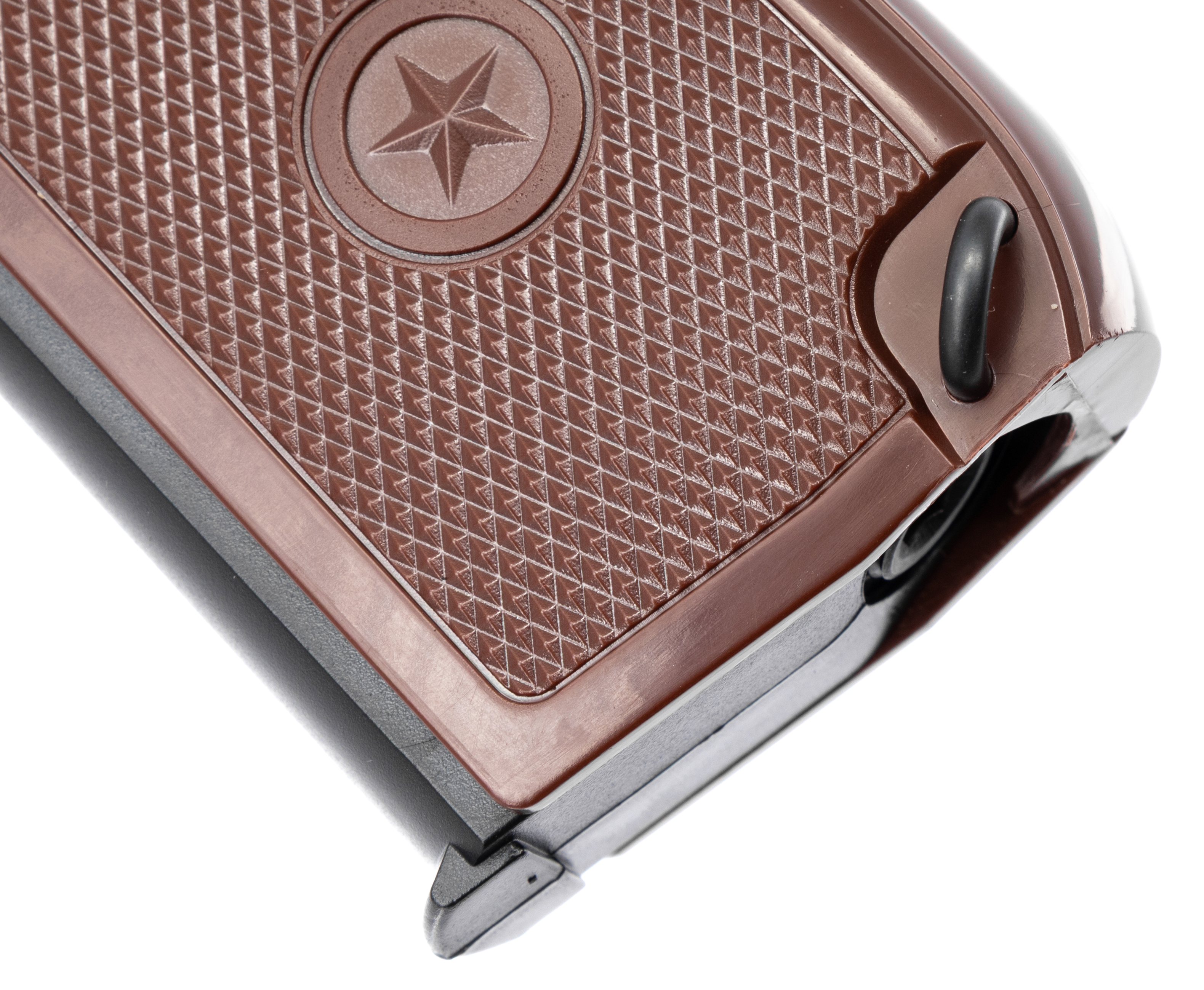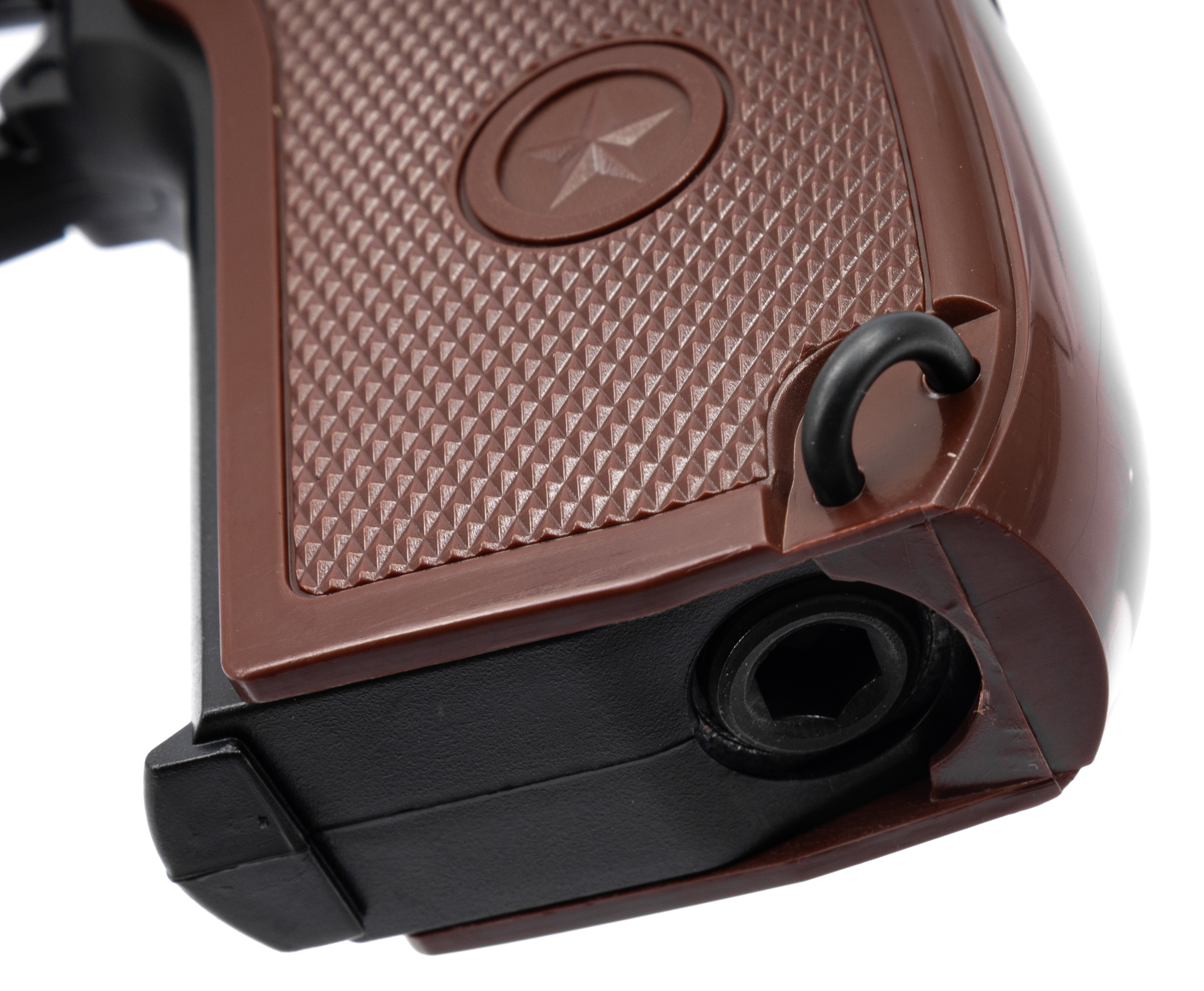 Также в набор добавлена поясная кобура для удобной переноски пистолета и 50 мишеней, чтобы пользователь мог комфортно отслеживать попадания и тренировать меткость. Стреляет пневматика стальными шариками калибра 4.5 миллиметра, которые заряжаются внутрь интегрированного в рукоять 16-слотового магазина. Этот узел прикрывается пластиковой накладкой, которая также скрывает и нишу для установки газового баллончика, фиксирующегося с помощью шестигранного ключа специальным винтом.