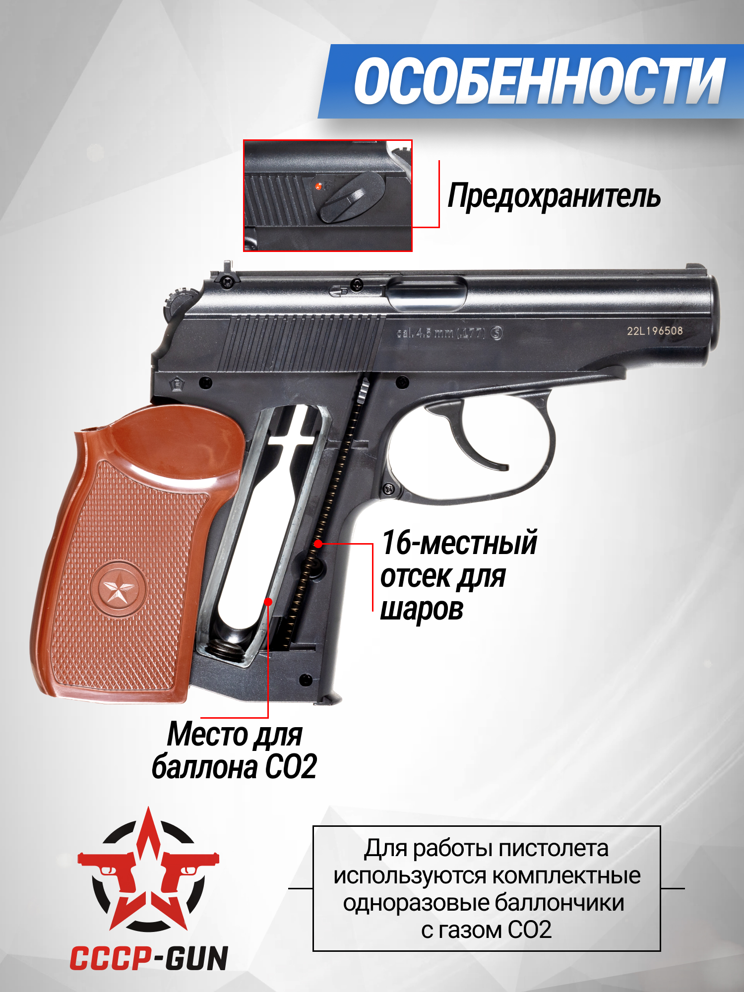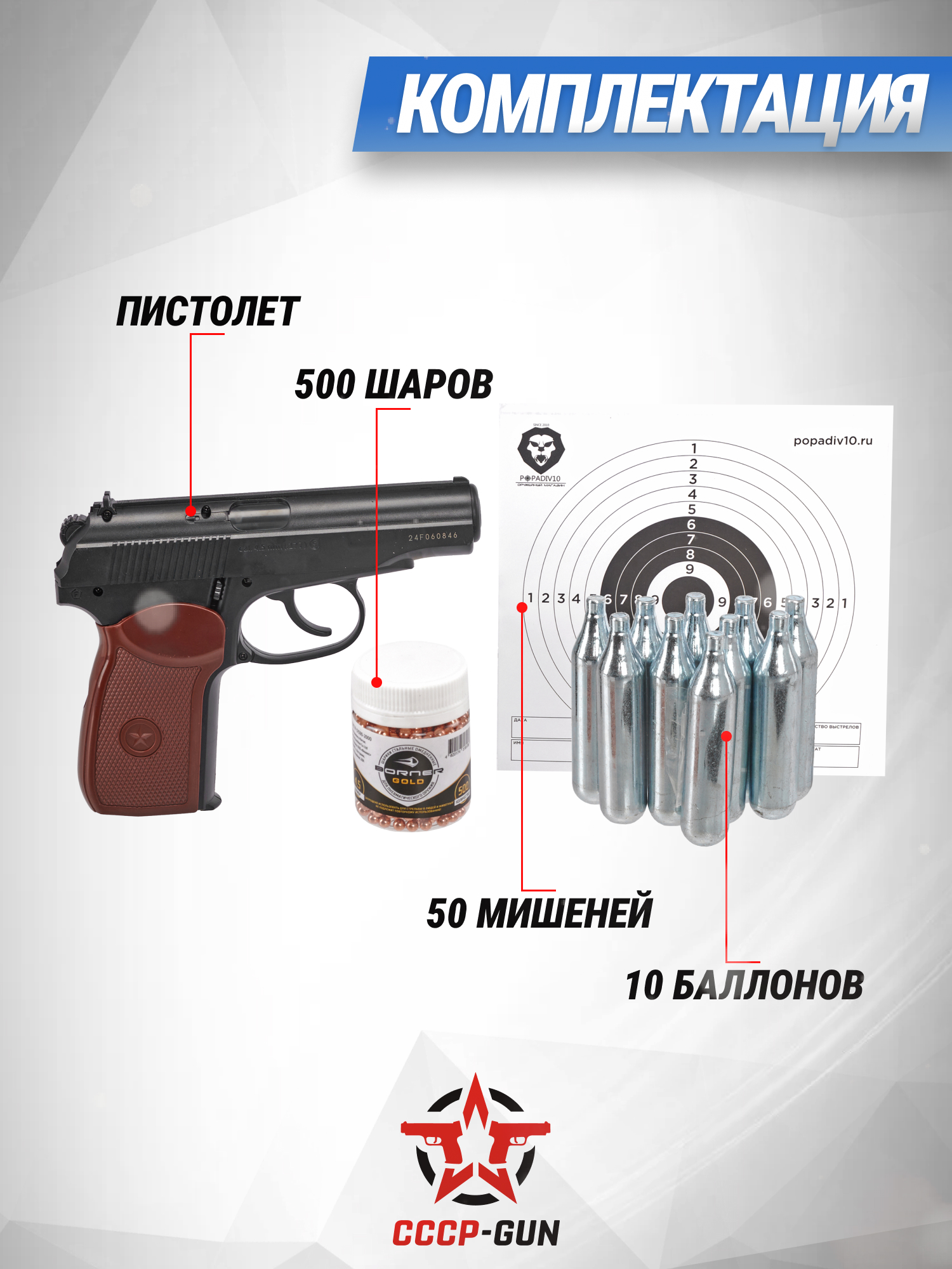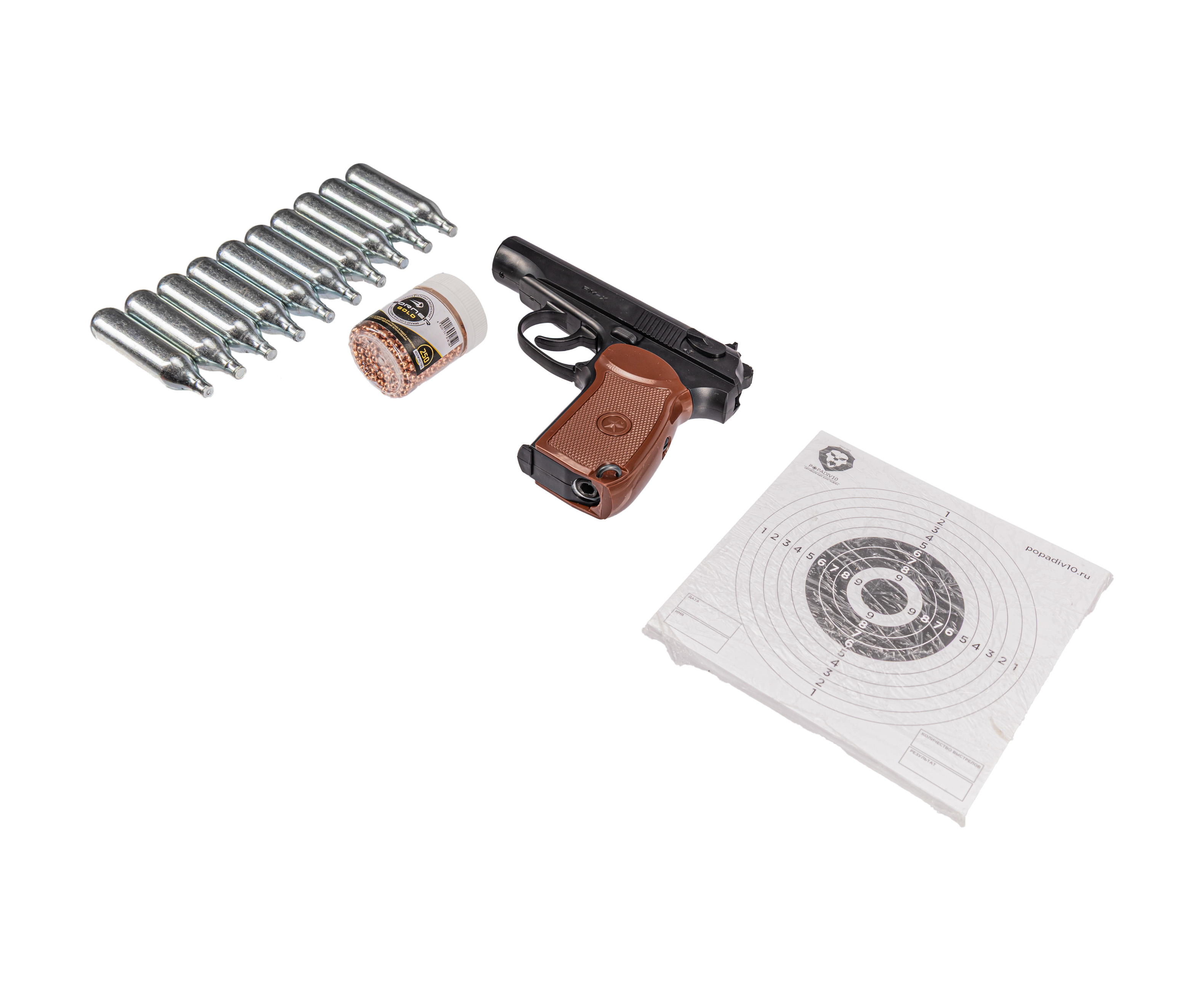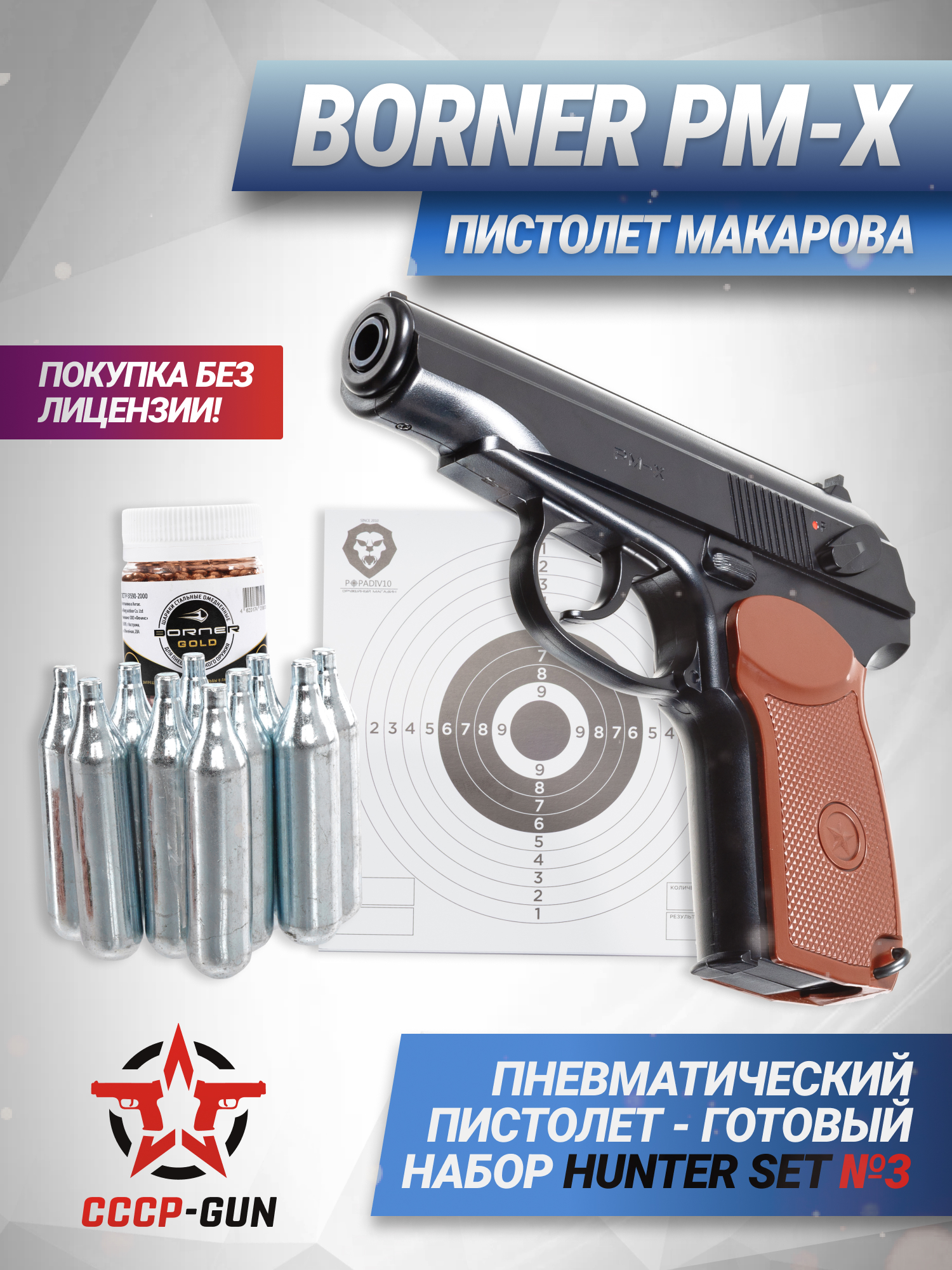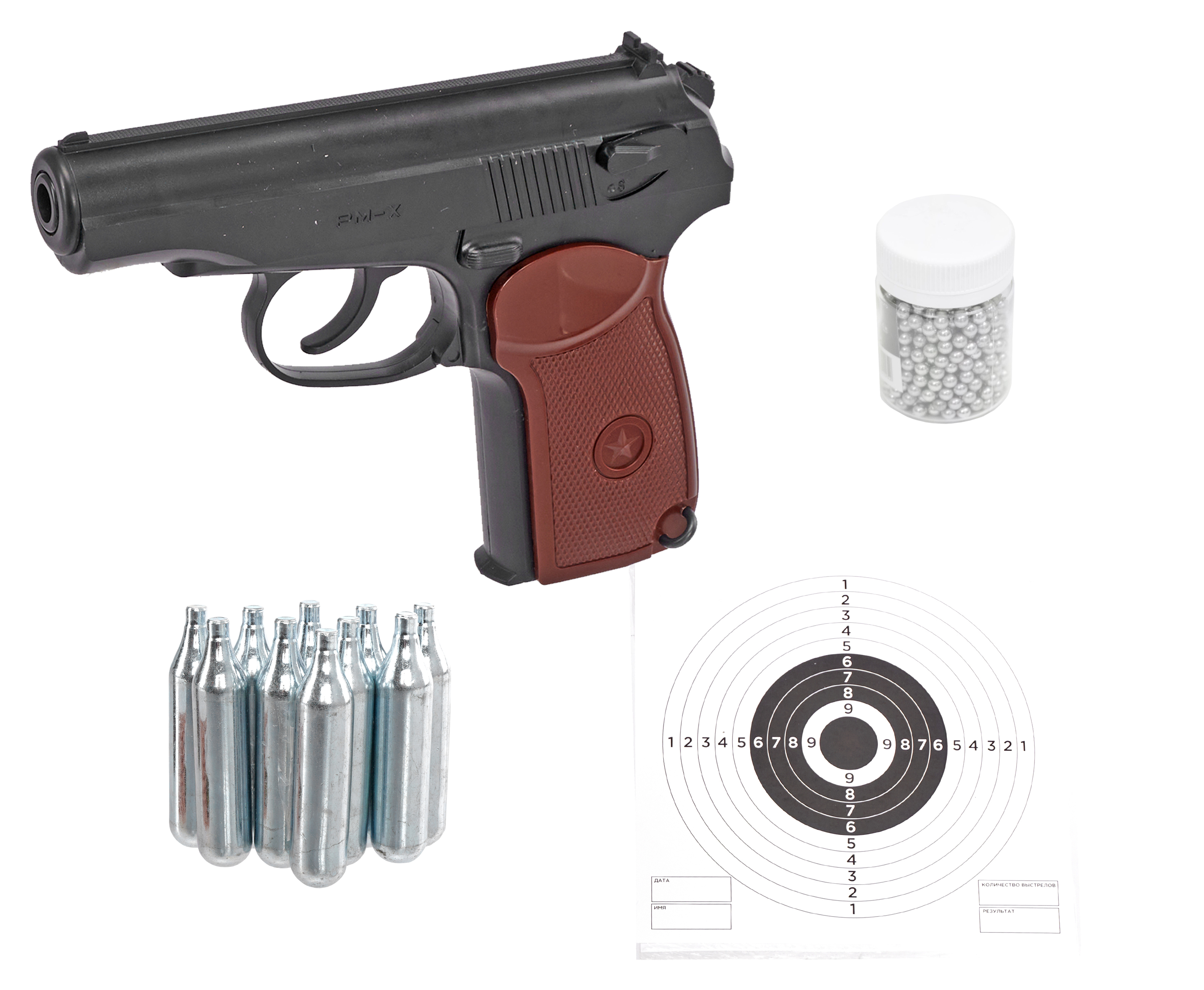 В обозреваемом комплекте присутствует пистолет Borner PM-X и 10 баллончиков с углекислотой, за счет которых функционирует пневматический механизм. Также в наборе добавлено 500 шариков для стрельбы и 50 мишеней, благодаря которым пользователь сможет оттачивать меткость. Таким образом покупатель получает готовый к работе пистолет с полным перечнем подходящих расходников.