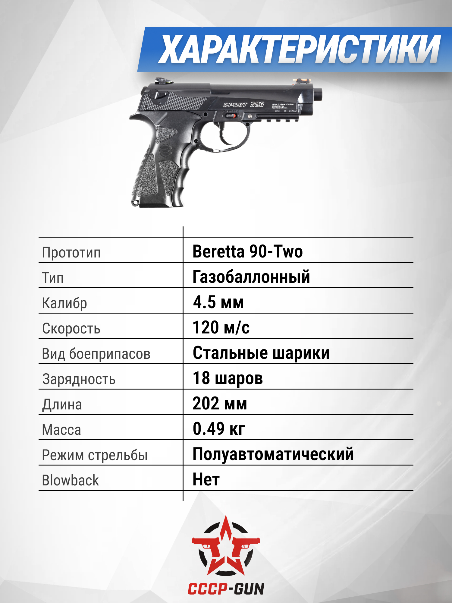 Рассматриваемая модель выполнена в стиле пистолета Beretta 90-Two, который стал популярен в массах после фильма «Обитель зла 4», так как героиня Клэр Редфилд использует именно это оружие. Полная длина изделия равна 200 миллиметрам, в то время как вес не превышает 0.48 килограмма. Производителю удалось достичь такой легкой массы за счет применения полимерных материалов при изготовлении корпуса и затворной рамы пневматики.