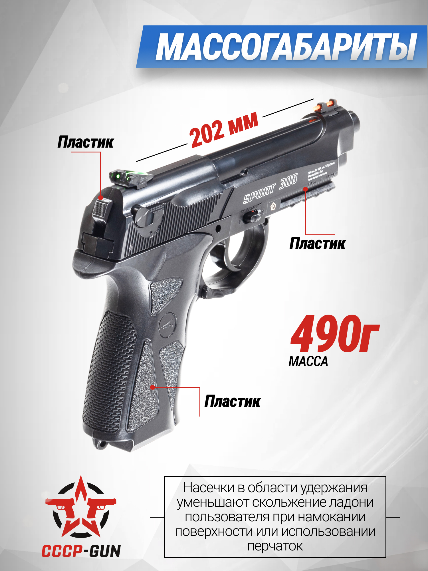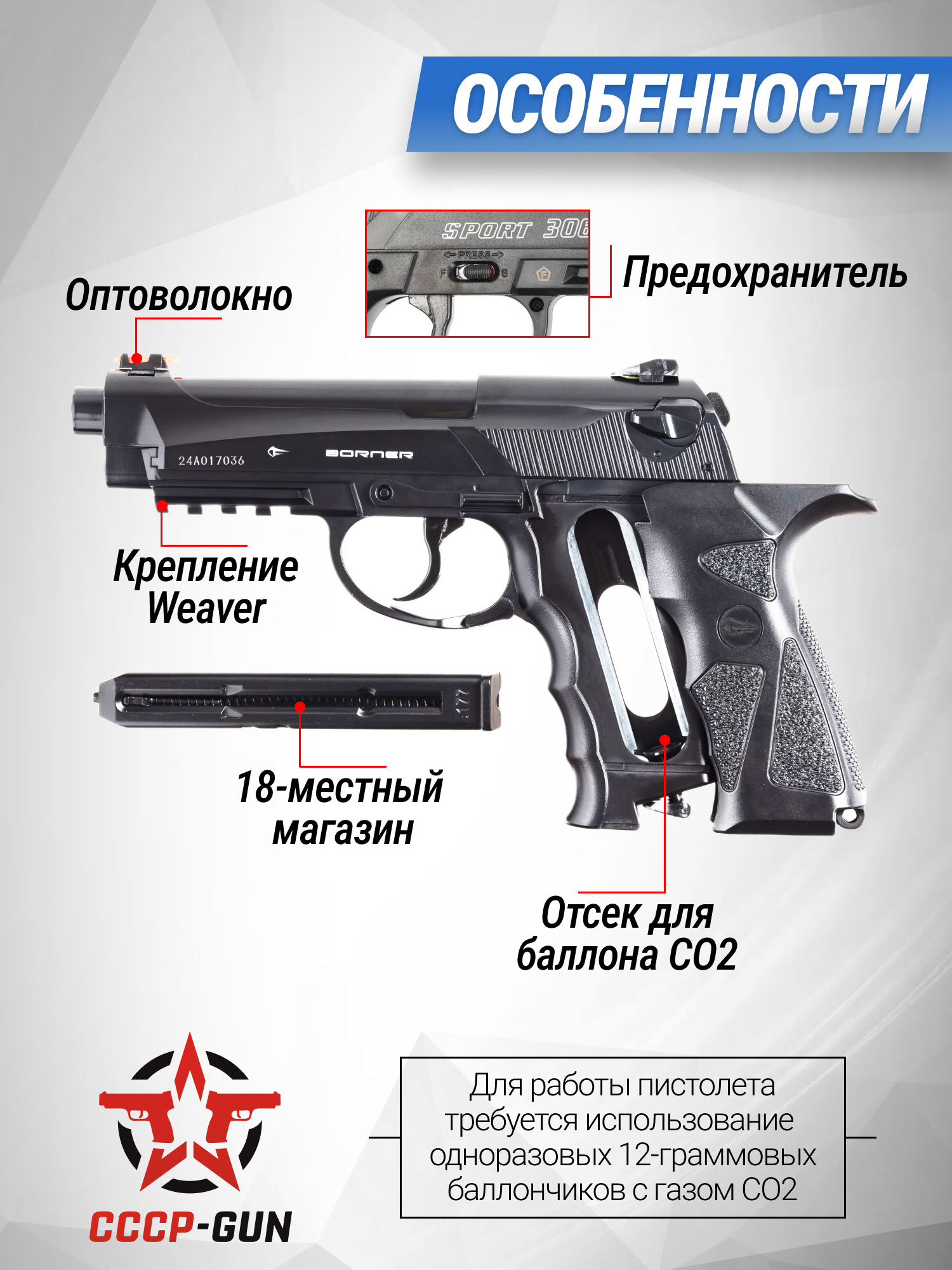 Магазин пистолета Борнер Спорт 306 вмещает до 18 шариковых BB боеприпасов калибра 4.5 миллиметра, при этом извлечение указанного элемента происходит с помощью специального рычажка, который выполнен в виде части спусковой скобы. Производитель уточняет, что одного баллончика будет хватать от восьмидесяти до девяноста выстрелов за счет простого механизма без дополнительных подвижных деталей. Для безопасной работы с изделием на правой стороне корпуса спроектирован двухпозиционный предохранитель.