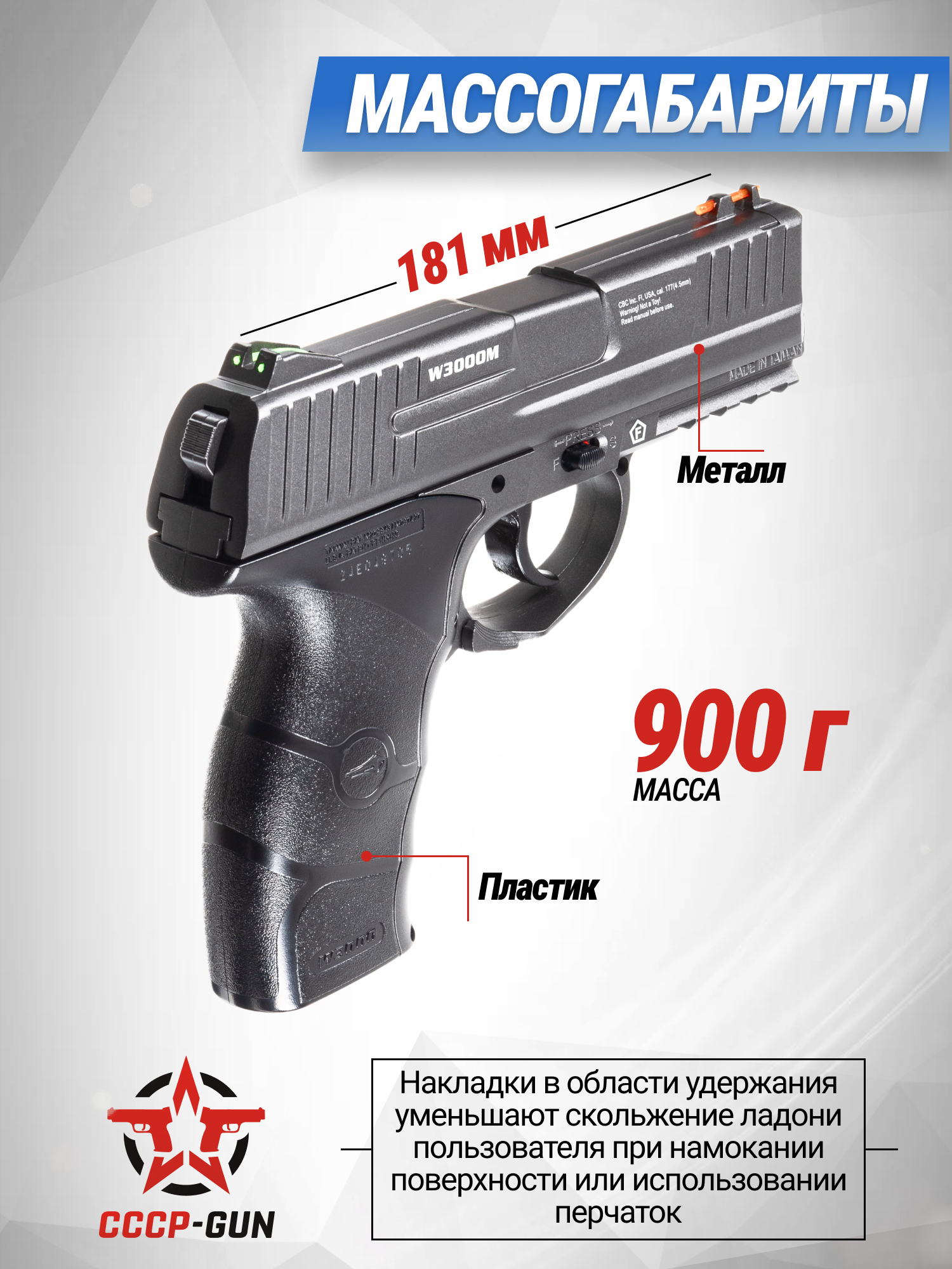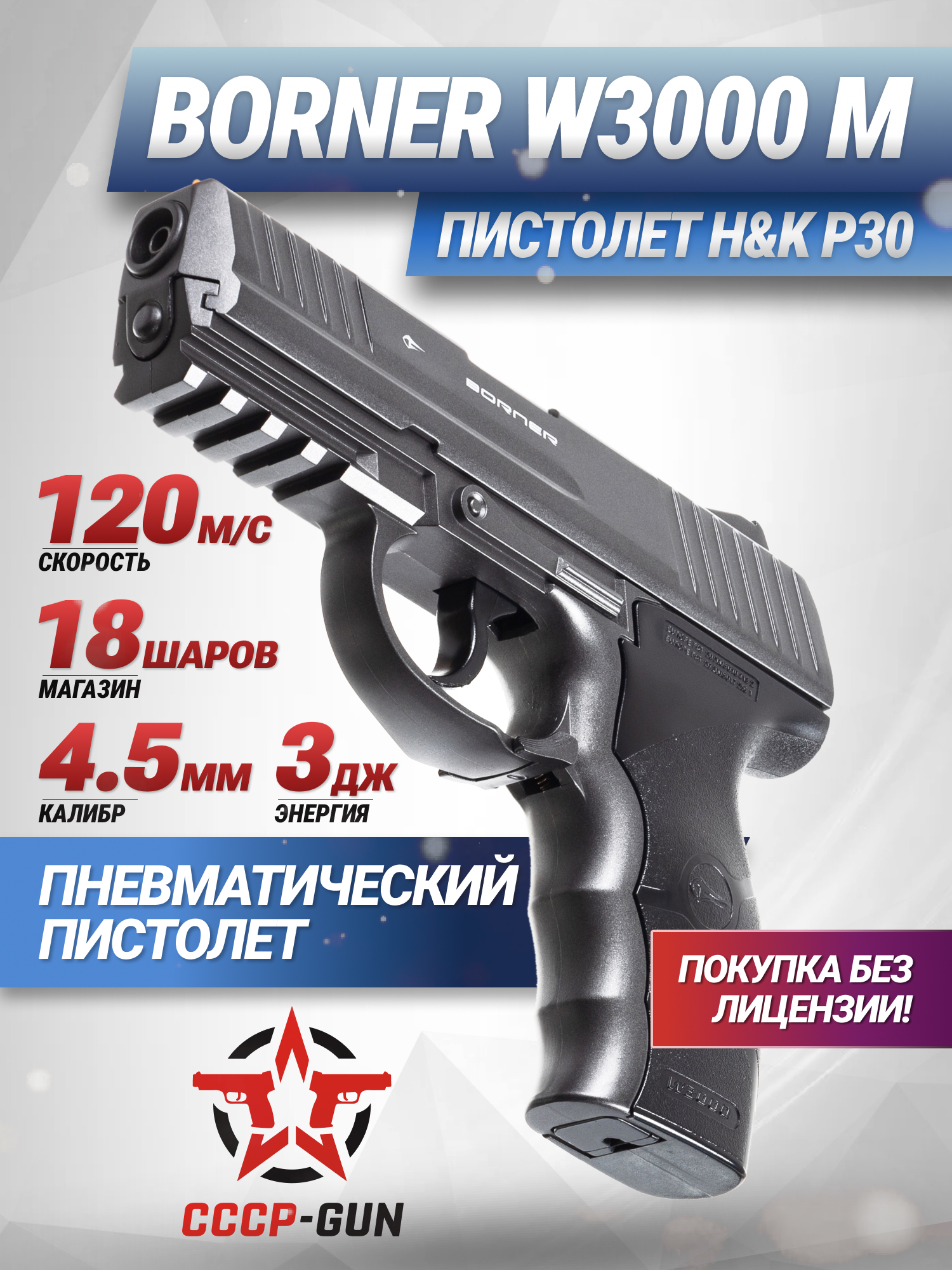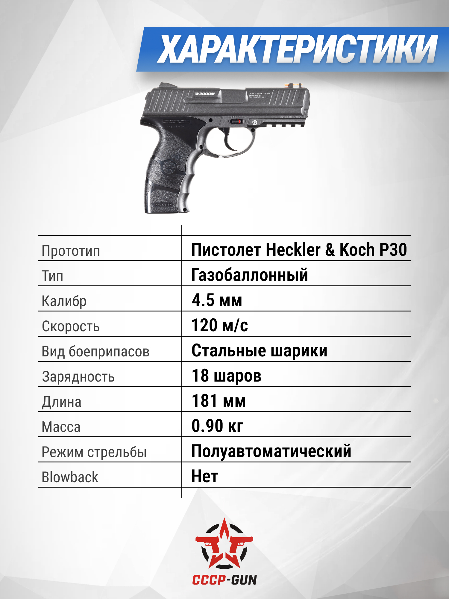 Корпус обозреваемого пистолета Borner W3000M 4 5 мм изготовлен из металла, исключение составляют пластиковые накладки, которые обеспечивают приятный и надежный хват изделия. Так как при создании деталей используются сплавы, масса модели составляет 890 грамм, при длине 180 мм. Подобные характеристики выбраны производителем для того, чтобы максимально передать внешние параметры и вес немецкого пистолета Heckler & Koch P30.