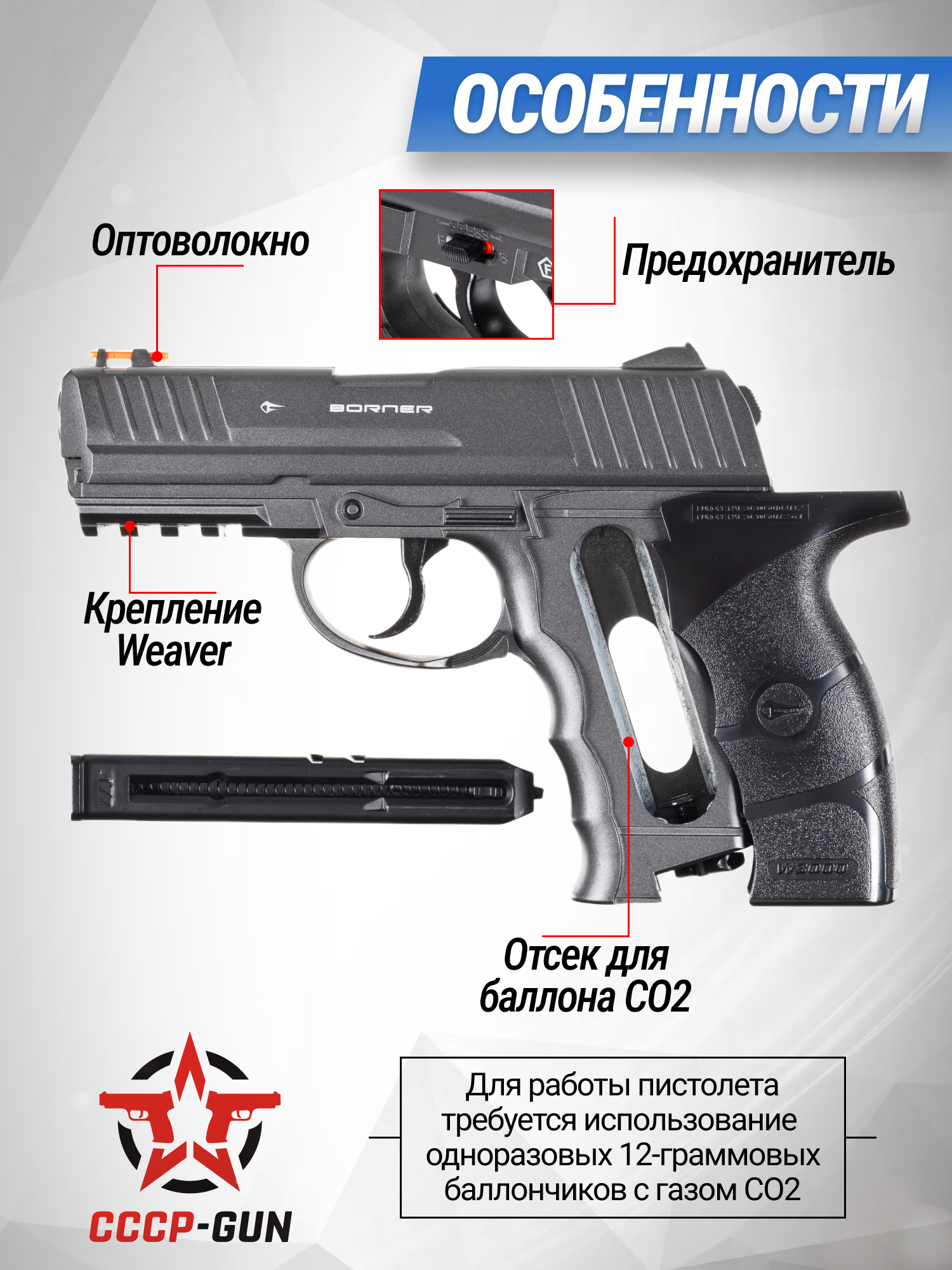 Американская компания Borner, являющаяся дочерним предприятием CBC Inc и занимающаяся изготовлением пневматики, зарекомендовала себя в оружейных кругах, как производитель, который делает ставку на бюджетные модели и тщательно следит за качеством изделий. Бренд берет за основу популярные дизайны огнестрельных образцов и визуализирует их в варианте пневматических экземпляров.