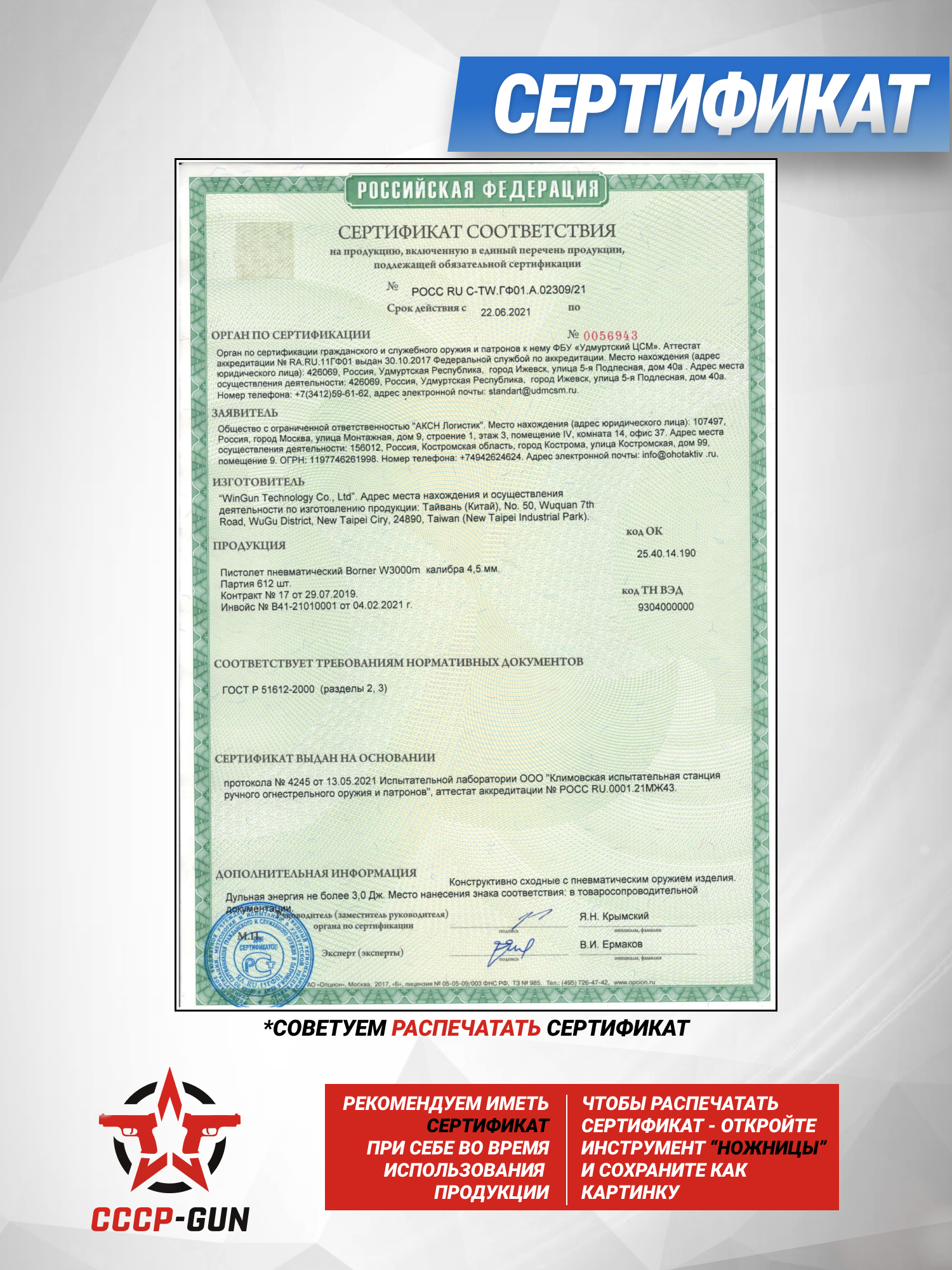 Представленная модель способна разгонять стальной шарик до скорости в 120 метров в секунду, что в совокупности с дульной энергией до 3 Джоулей сохраняет возможность свободного приобретения изделия. Для покупки покупателю понадобится предъявить только паспорт и не нужно будет оформлять дополнительную лицензию. Таким образом Borner W3000M заслуженно считается доступным представителем средне-бюджетного сегмента для тренировок и развлечения.