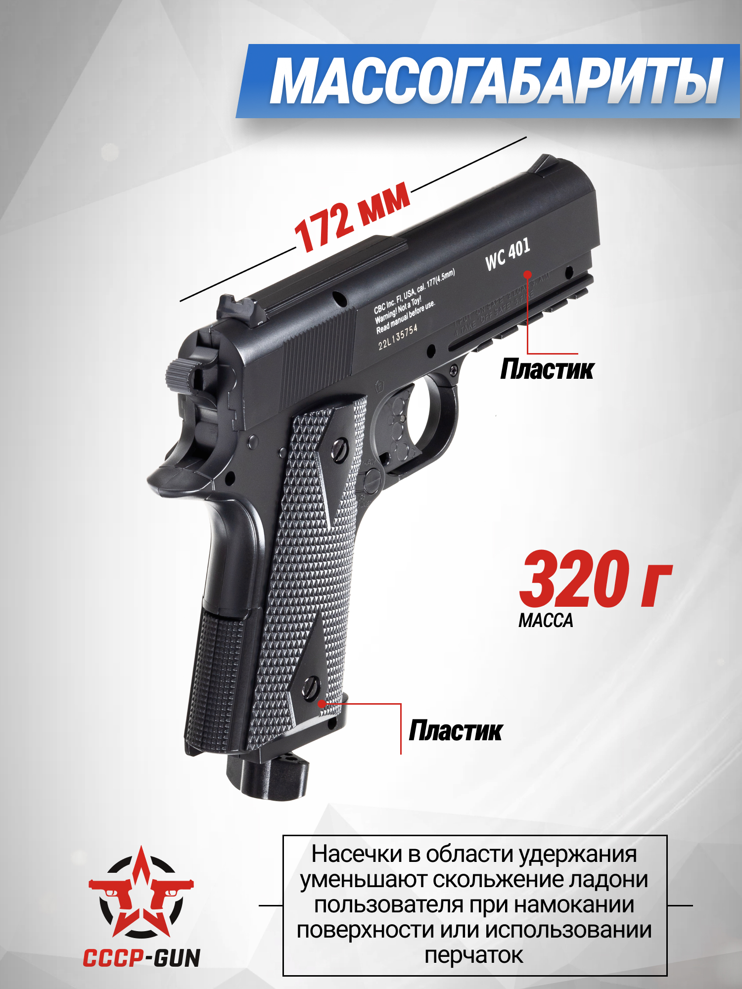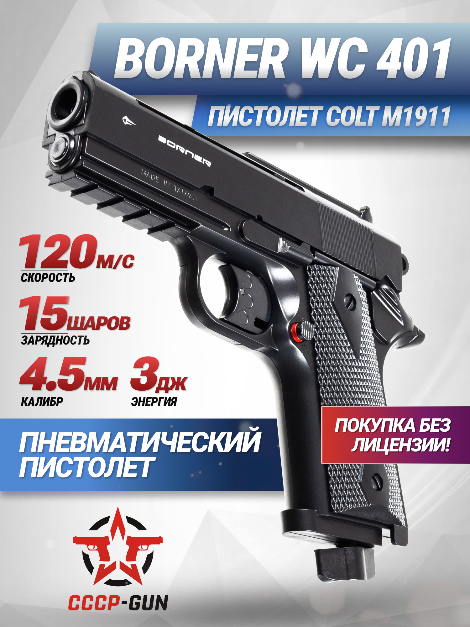 При проектировании модели Borner WC 401 инженеры компании брали за основу дизайн культового огнестрельного экземпляра Colt M1911, который встречается в различных кинокартинах и компьютерных играх. По этой причине полные габариты пистолета составляют 180 миллиметров, а вес не превышает 350 грамм за счет комбинированных материалов. Рукоять и основание корпуса пистолета изготовлены из прочного пластика, который по словам пользователей помогает комфортно удерживать пистолет в руках.