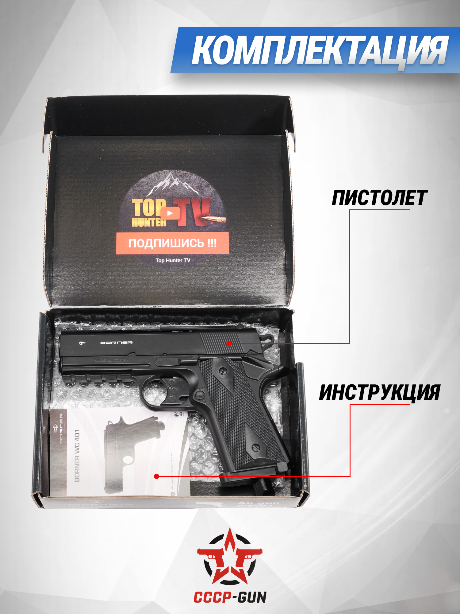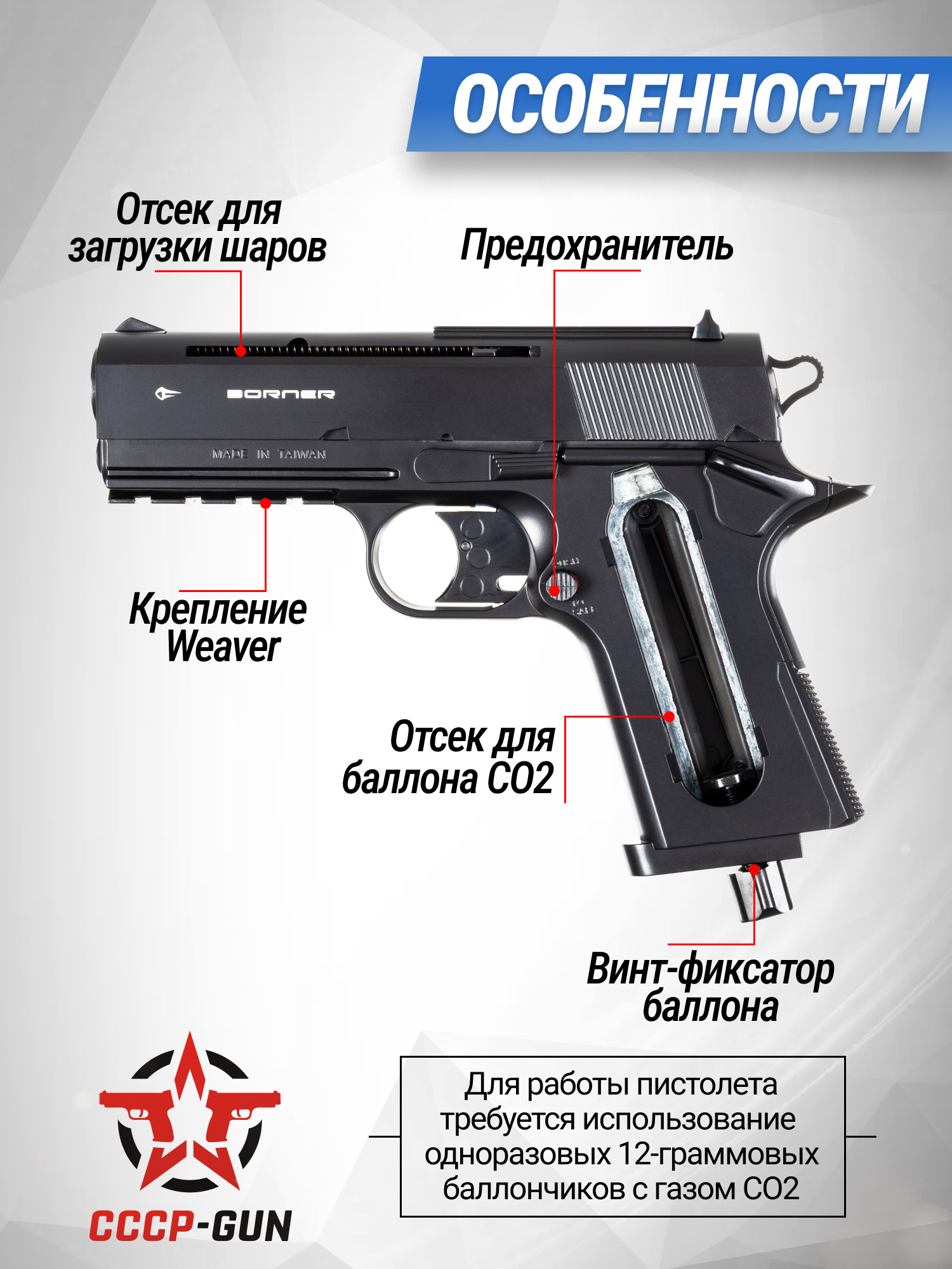Американские модели пневматического оружия от бренда Borner ценятся в стрелковых кругах за серьезный, заложенный производителем, ресурс работы конструкции и доступную стоимость на рынке. Помимо этого, изделия могут похвастаться достаточной мощностью, которая подойдет для развлекательной стрельбы и тренировок. Главной особенностью пистолетов Борнер является то, что конструкторы компании при проработке дизайна вдохновляются боевыми экземплярами, благодаря чему визуальная составляющая пневматики обладает особой аутентичностью.