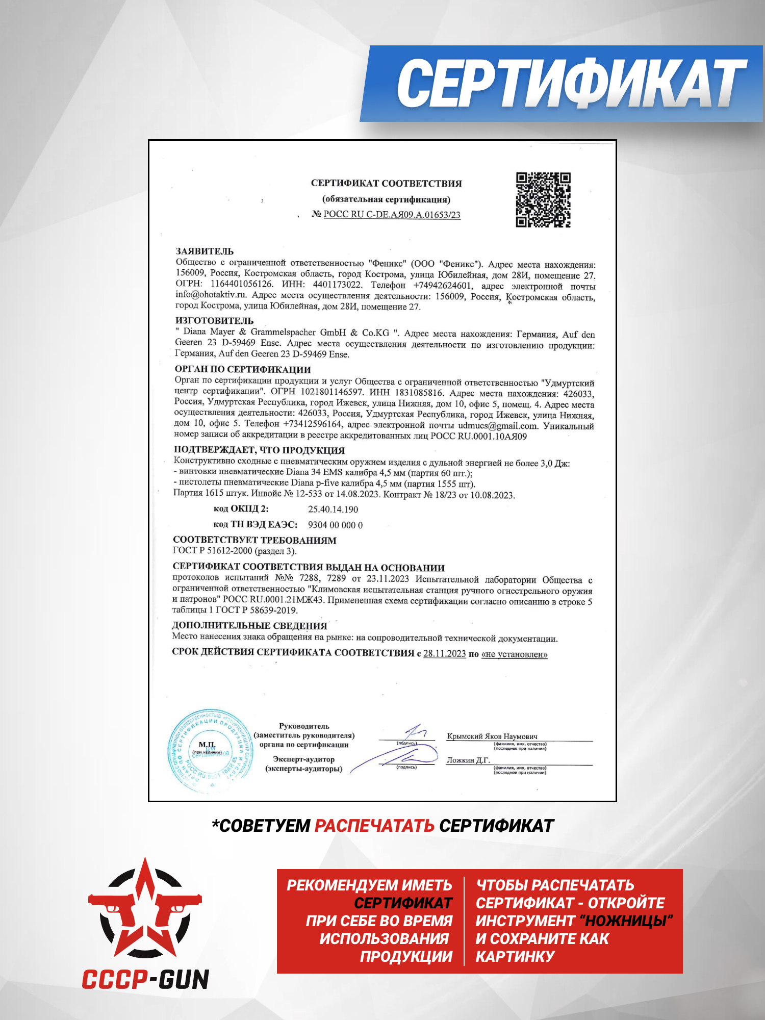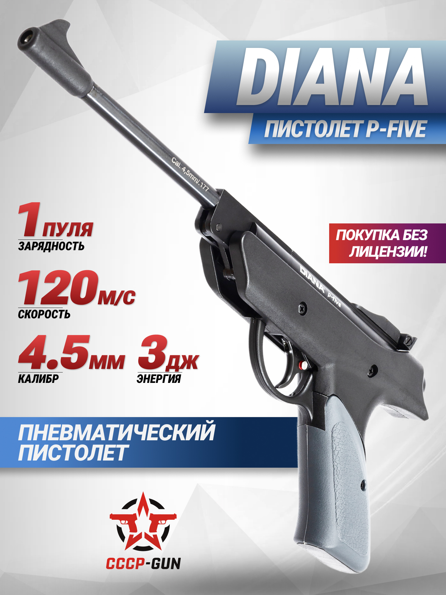 В России рассматриваемая немецкая пневматика продается без требования получения разрешительных документов, по той причине, что мощность выстрела изделия не переходит за рамки ограничения в 3 J. Таким образом Diana P-Five при максимальной скорости полета пули равной 115 метрам в секунду, подойдет даже для начинающих спортсменов и любителей развлекательной стрельбы, у которых нет оружейной лицензии.