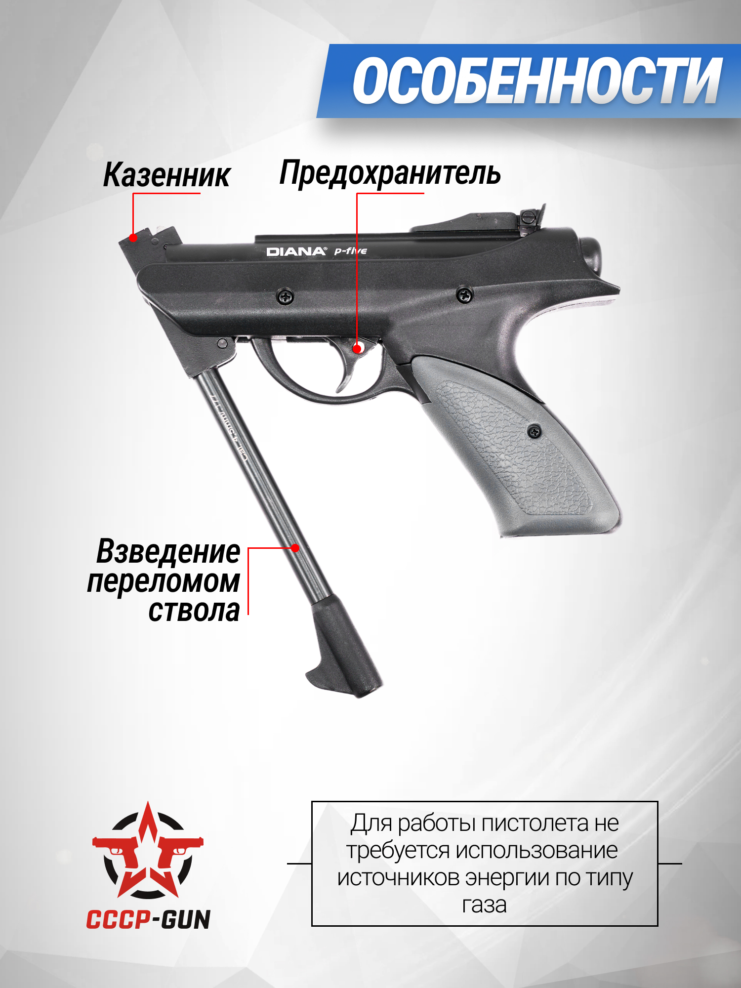 Diana P Five относится к представителям пружинно-поршневой пневматики однозарядного плана. Ствол пистолета выполнен в формате переломной системы для взведения оружия перед выстрелом, что помогает исключить дополнительные расходники. По отзывам владельцев оружие имеет колоссальный ресурс за счет внутренних деталей механизма с правильно продуманной геометрией из стали высокого качества.