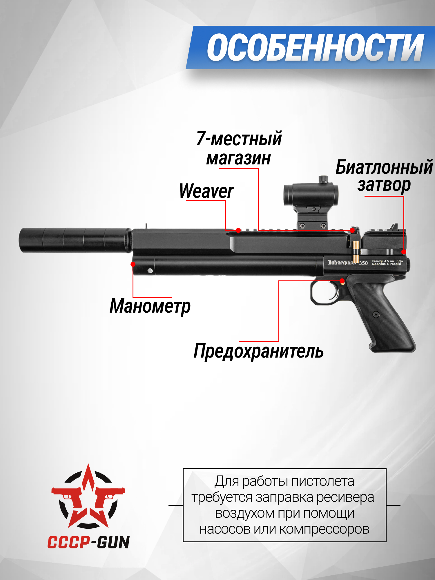 Пневматический пистолет Dobermann 350 Эксцентрик 5.5 мм (250 мм, редуктор)