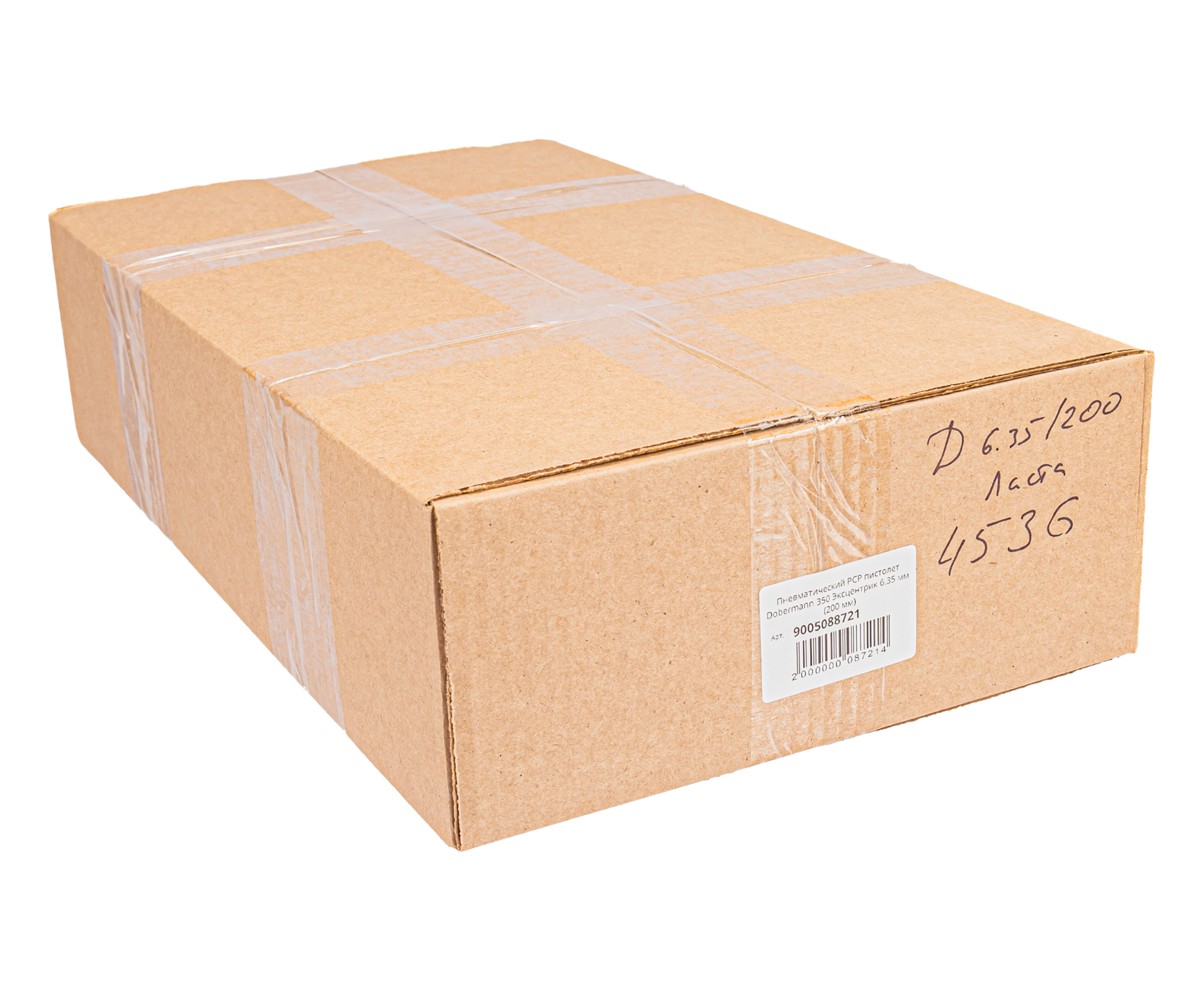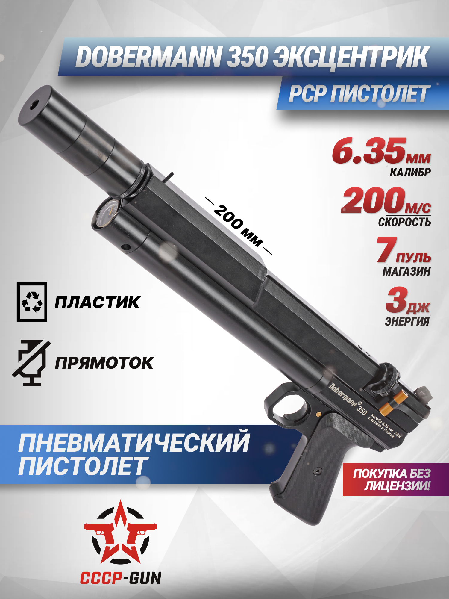 Усиленная вариация Доберманн 350 Эксцентрик способна разгонять свинцовую пулю калибра 6.35 миллиметров до скорости, превышающей 200 метров в секунду. Механизм пневматики рассчитан на одиночный режим стрельбы, а для удобства использования спроектирован 7-местный магазин барабанного форм-фактора. Взводится пистолет с помощью рычага, который располагается на левой стороне корпуса.