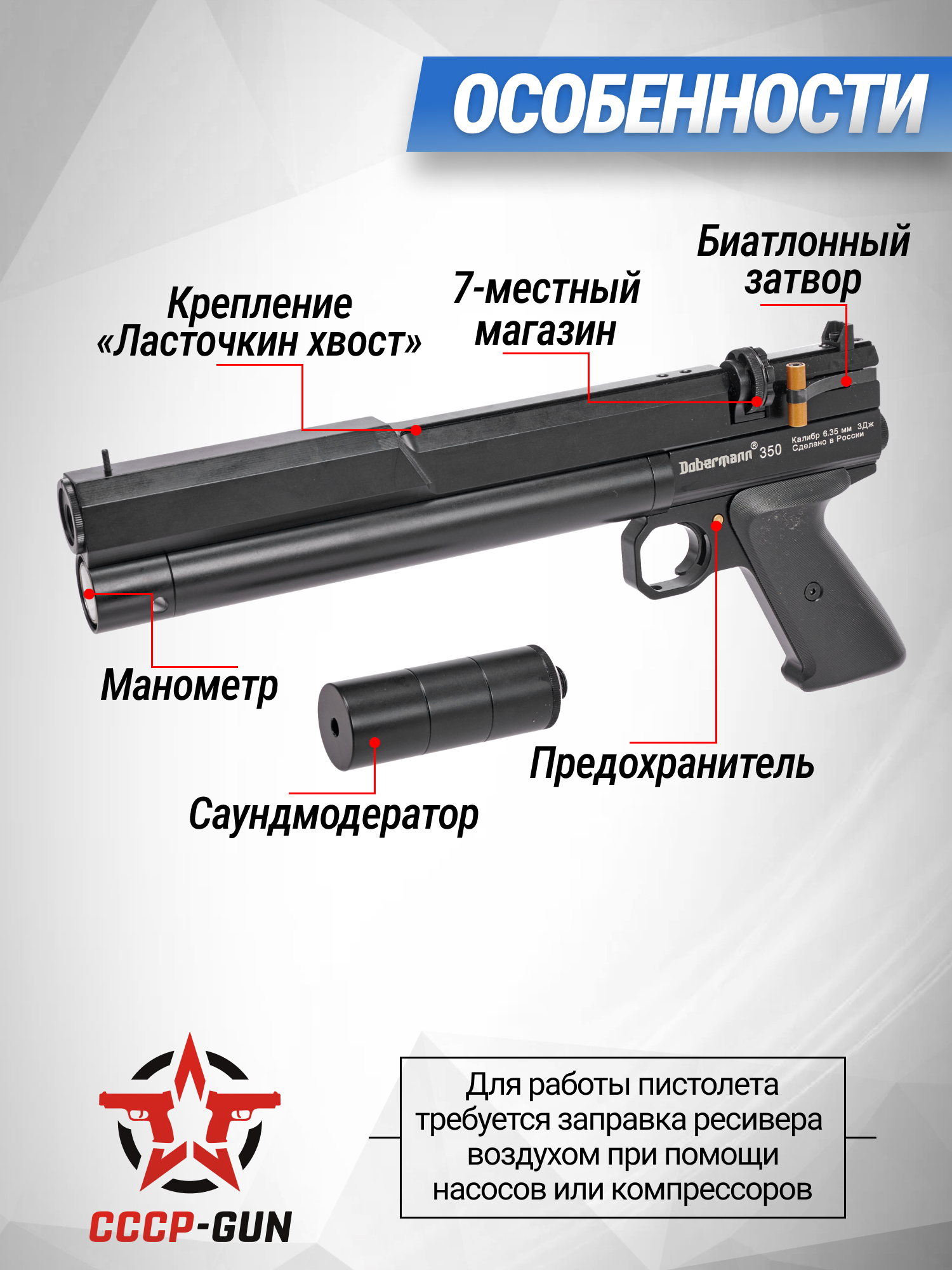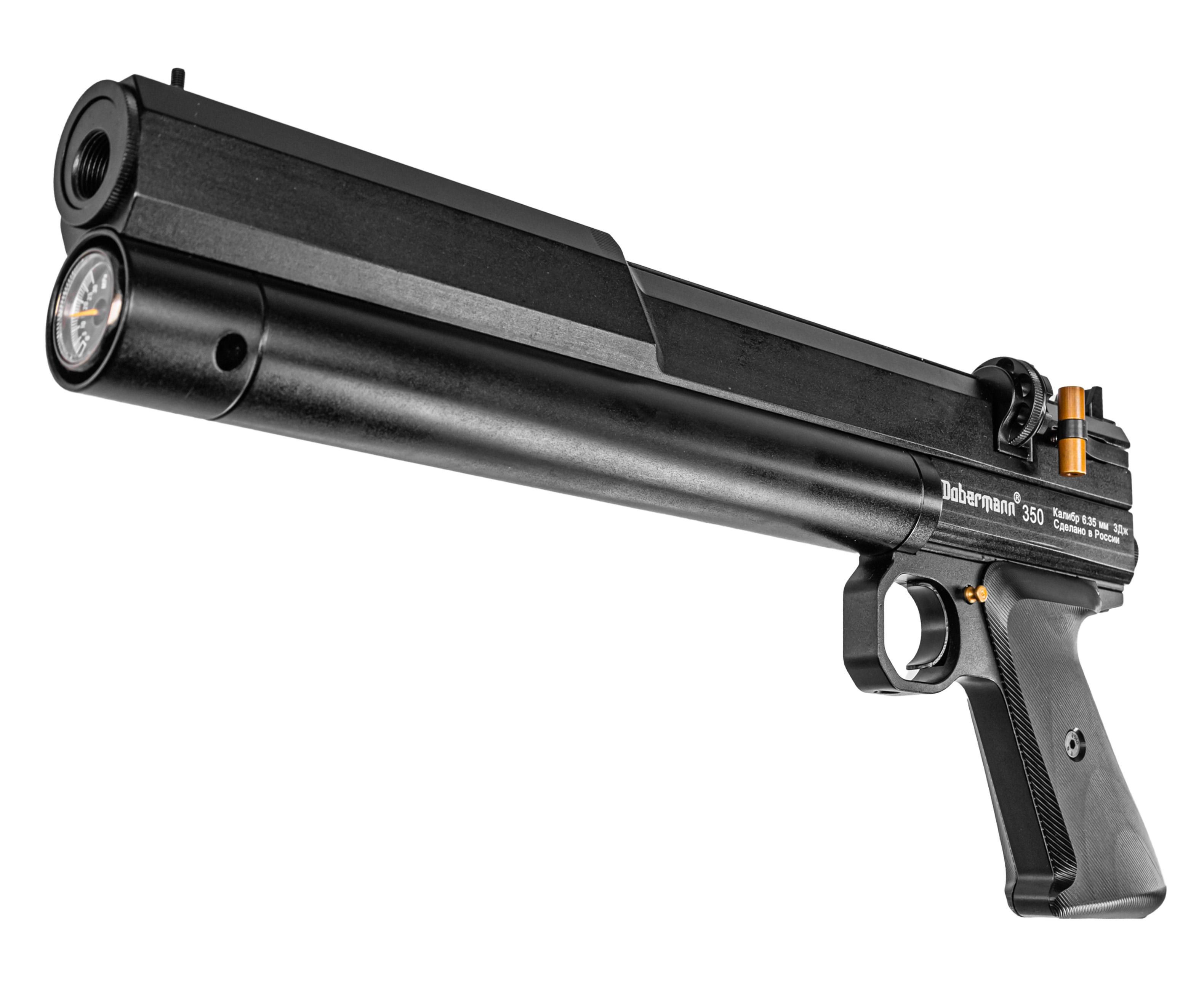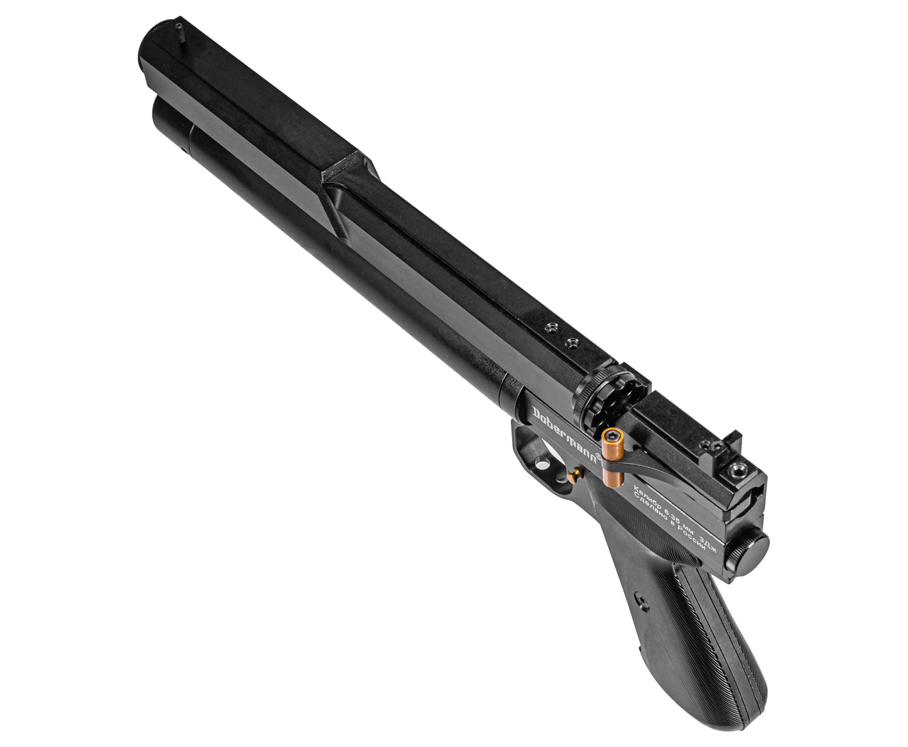 Функционирует представленная пневматика по принципу прямоточных образцов предварительной накачки. Энергия берется за счет сжатия газа внутри подствольного ресивера объемом 108 кубических сантиметров, который заправляется перед работой при помощи насоса благодаря комплектному штуцеру. На торце указанного трубчатого резервуара конструкторы Dobermann установили манометр, который помогает отслеживать рекомендуемое давление в 250 Бар.