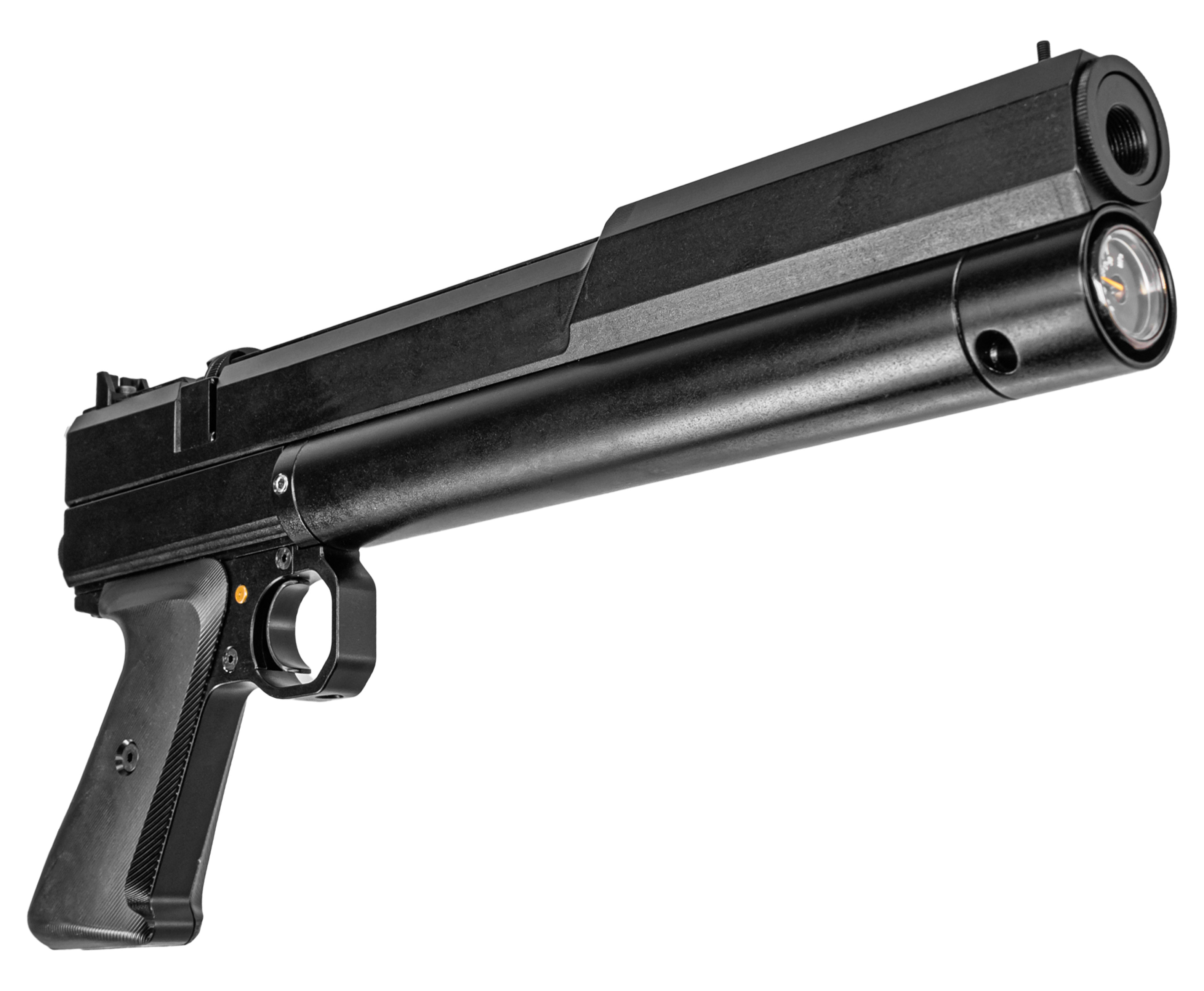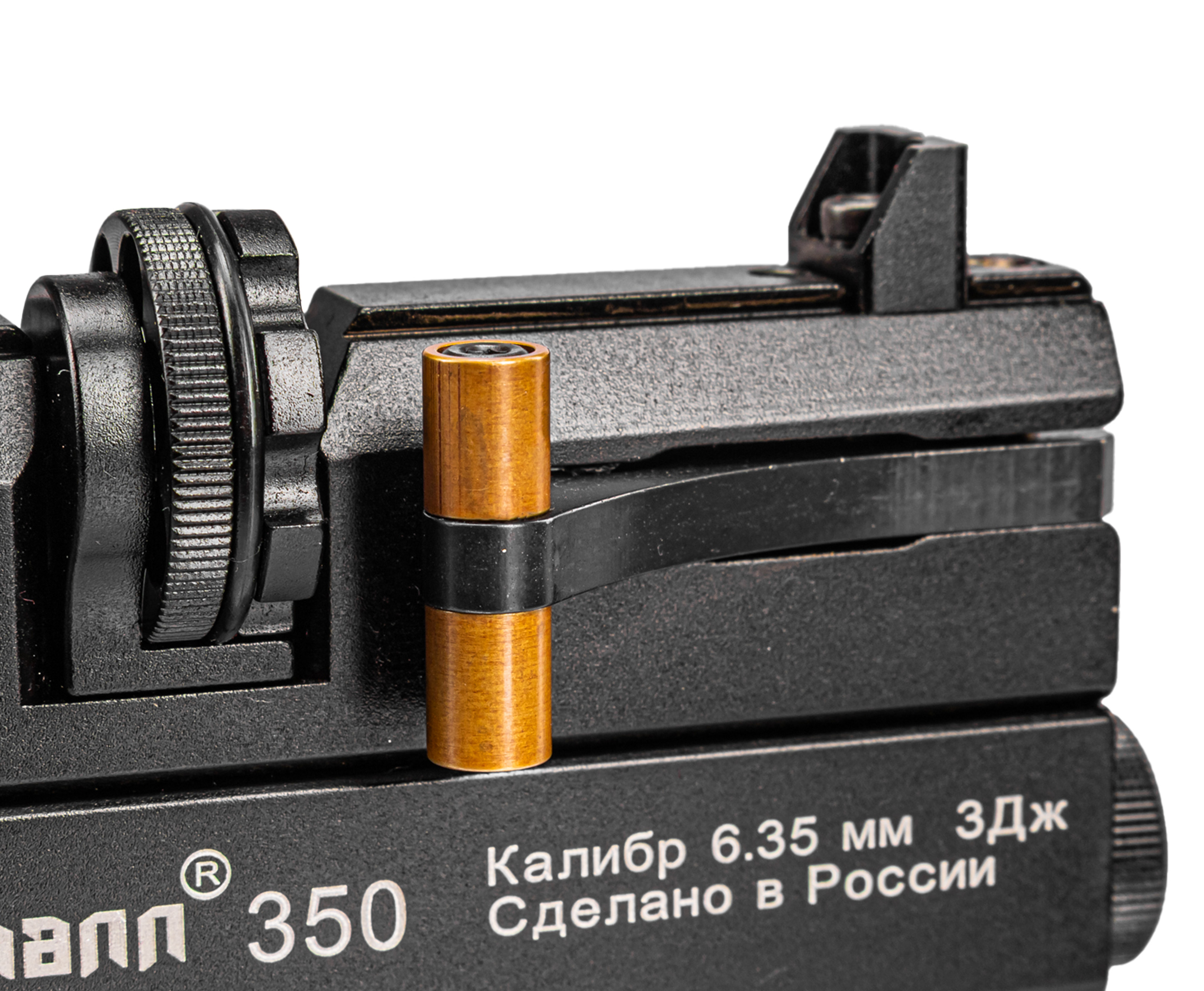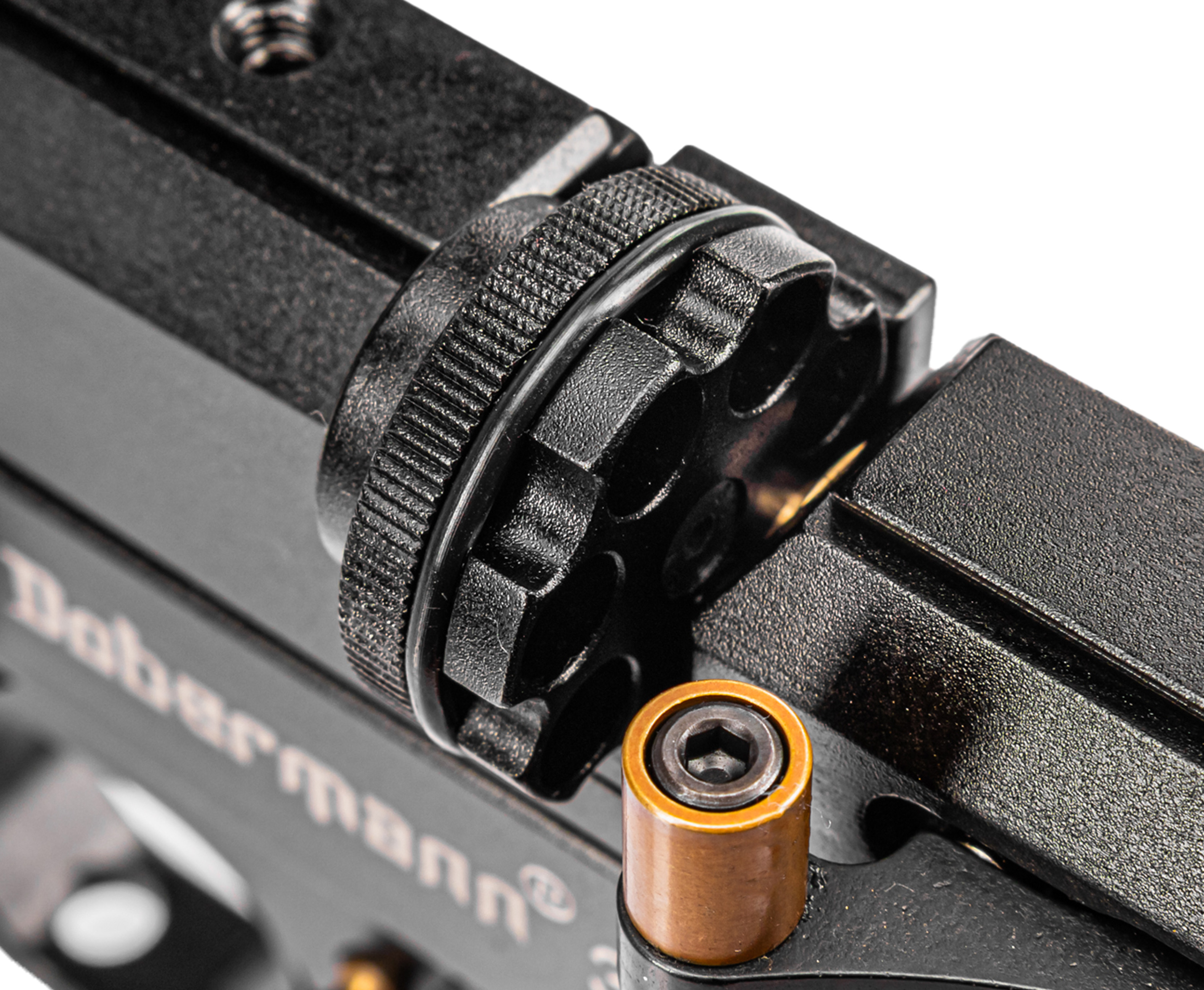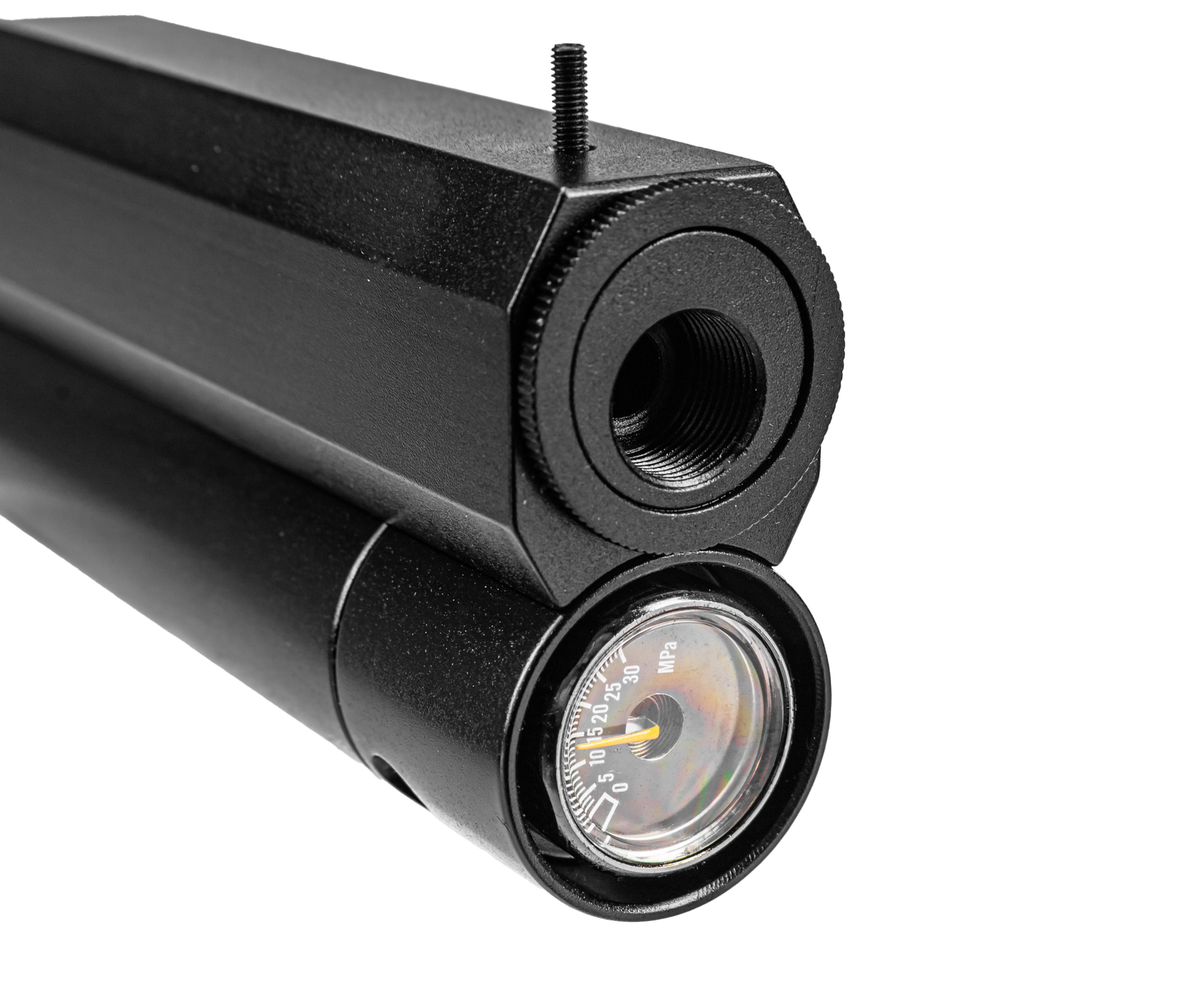 Функционирует представленная пневматика по принципу прямоточных образцов предварительной накачки. Энергия берется за счет сжатия газа внутри подствольного ресивера объемом 108 кубических сантиметров, который заправляется перед работой при помощи насоса благодаря комплектному штуцеру. На торце указанного трубчатого резервуара конструкторы Dobermann установили манометр, который помогает отслеживать рекомендуемое давление в 250 Бар.