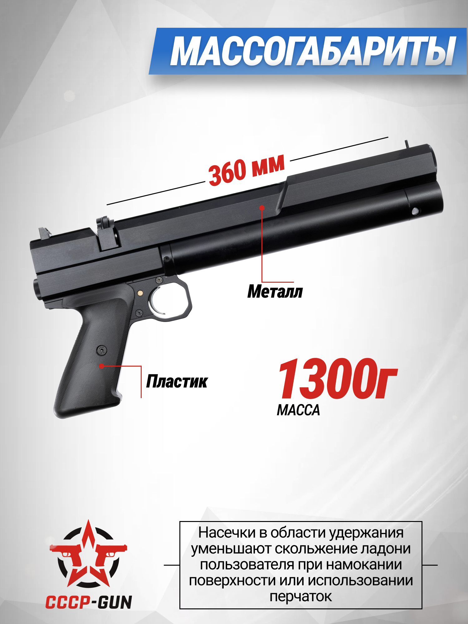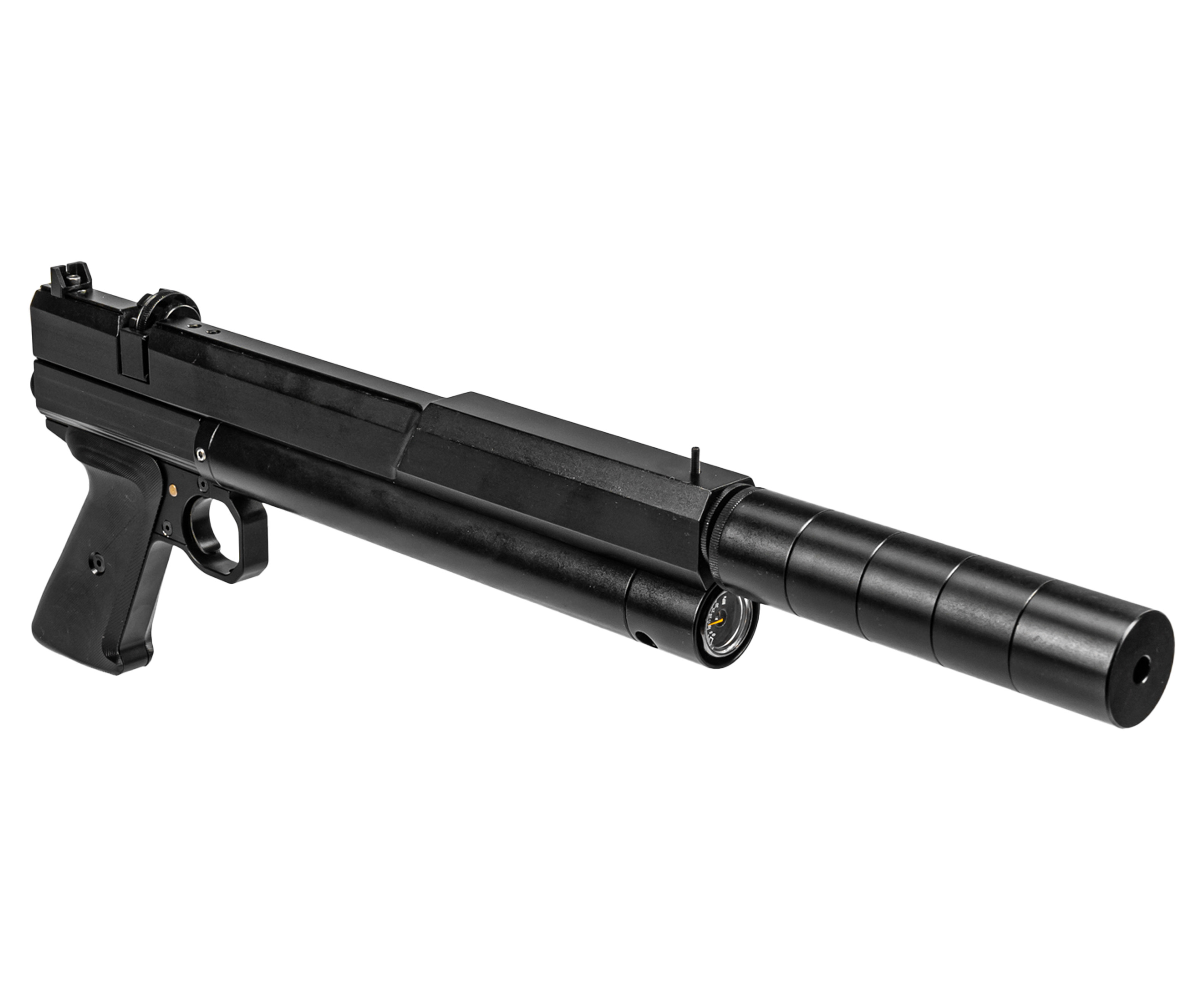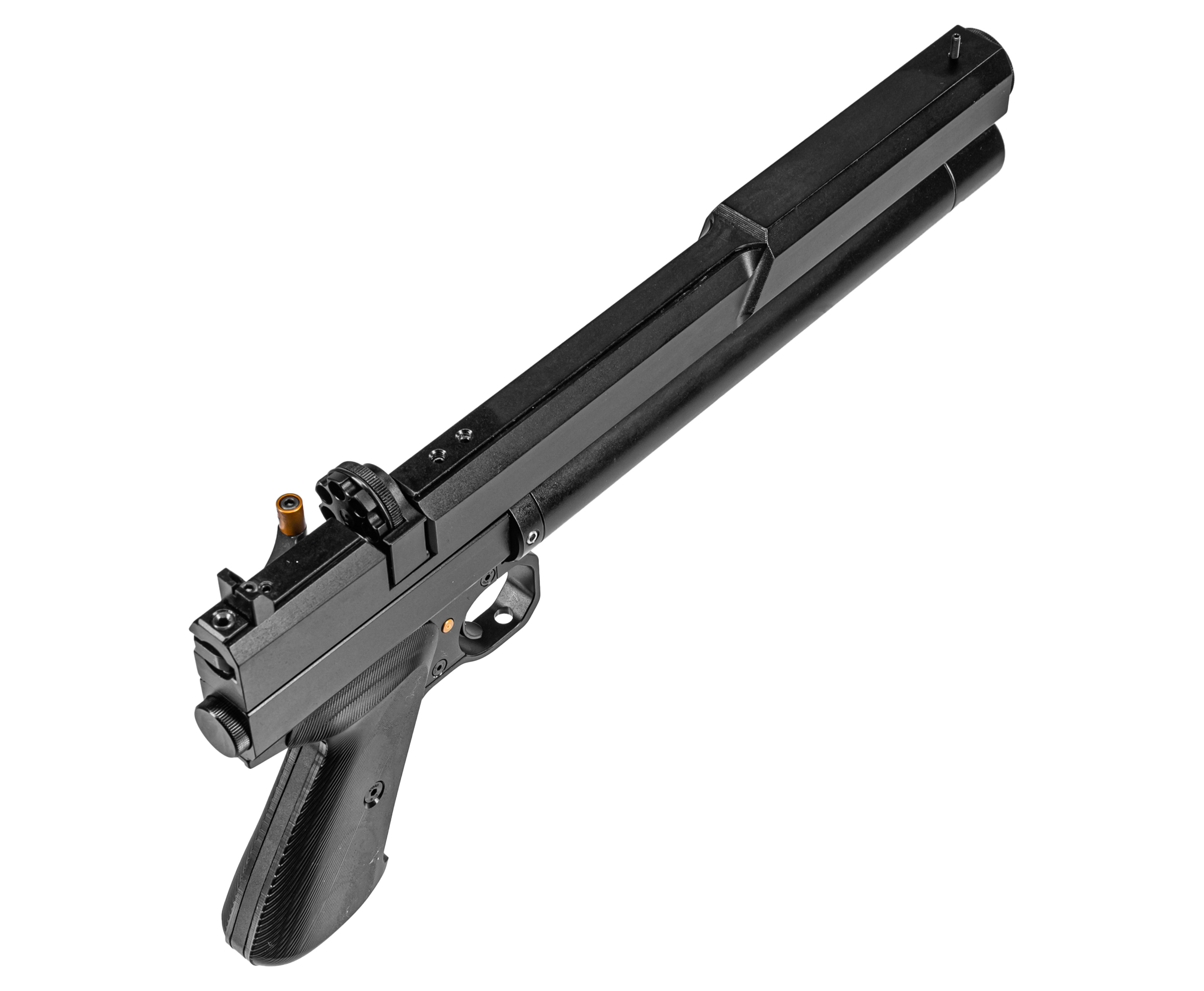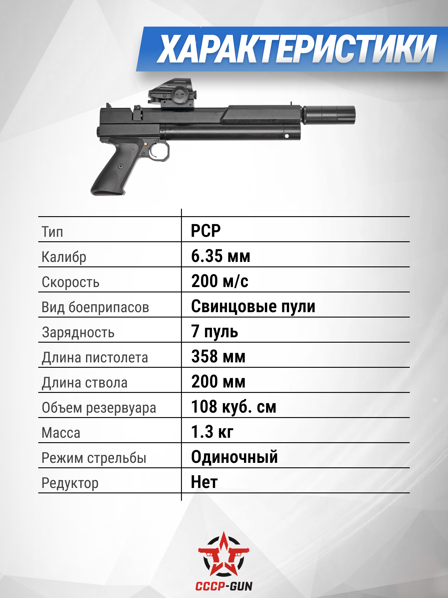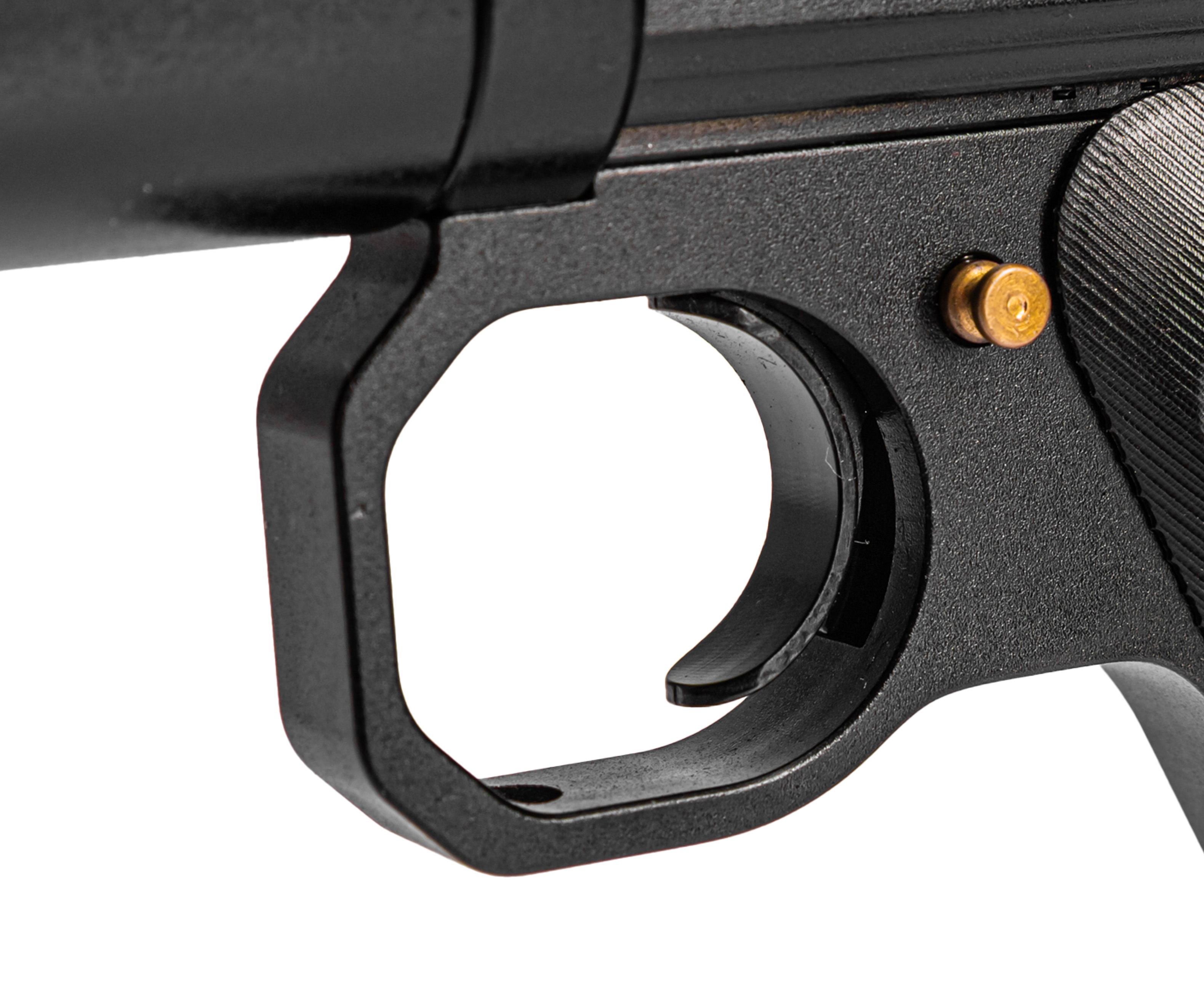 Точная стрельба достигается при помощи 200-миллиметрового нарезного ствола, а для снижения шума в момент высвобождения сжатого газа пистолет включает интегрированный модератор звука на четыре камеры и съемный на три секции. Прицельными приспособлениями выступают механические мушка и целик, изготовленные из металла, что повышает прочность этих элементов. Также пневматика предусматривает установку сторонних приборов в виде оптики или коллиматоров на встроенную планку шириной 11 мм формата «Ласточкин хвост».