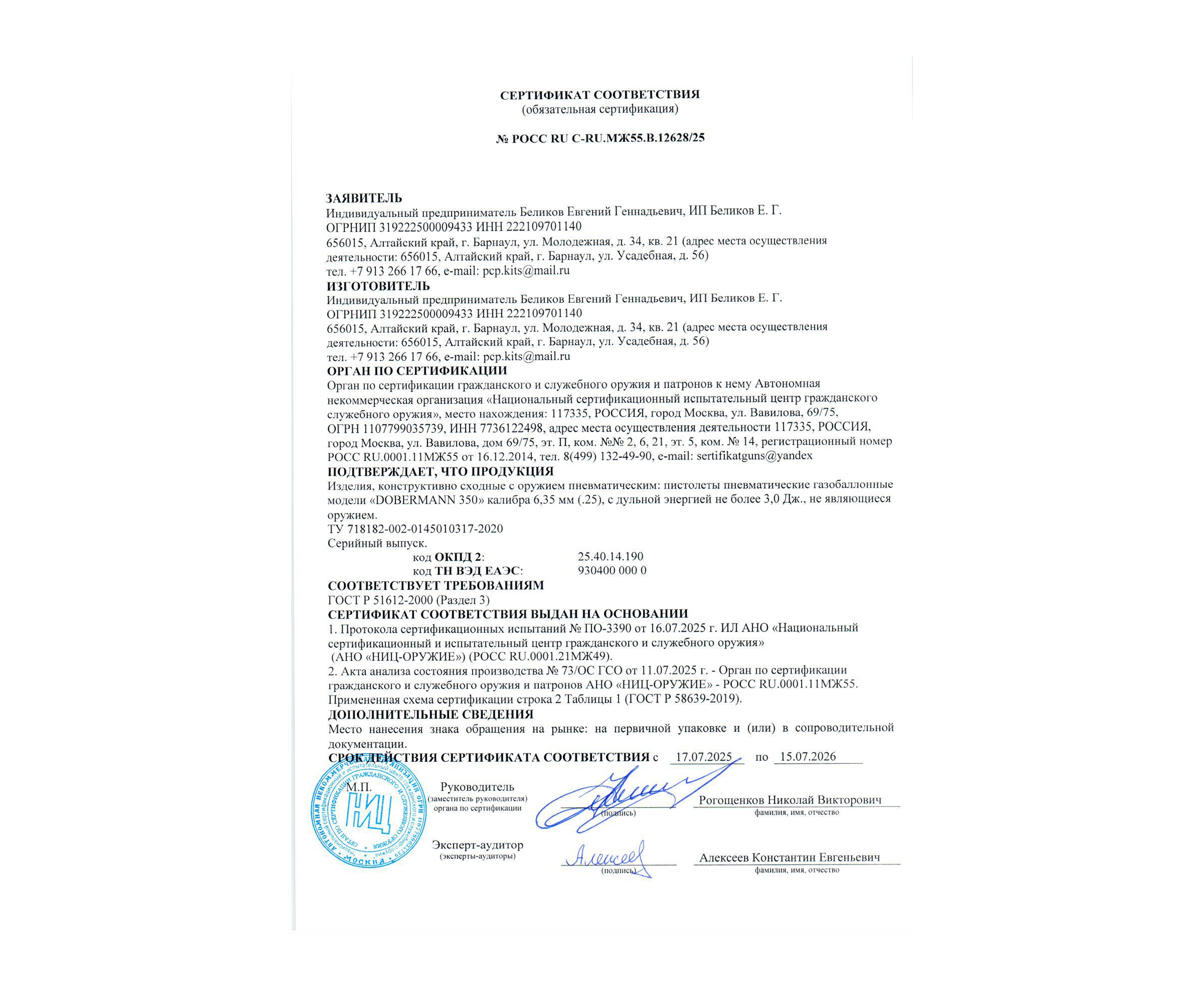 Размещение боеприпасов перед подачей осуществляется внутри съемного барабанного магазина на 7 мест. Для досылания пули стрелку необходимо отвести биатлонный рычаг, вынесенный на левую сторону ствольной коробки. Дополнительно Доберман 350 пневматический 6 35 предусматривает крепежную платформу Вивер 22 миллиметра для установки оптических прицелов или коллиматоров.