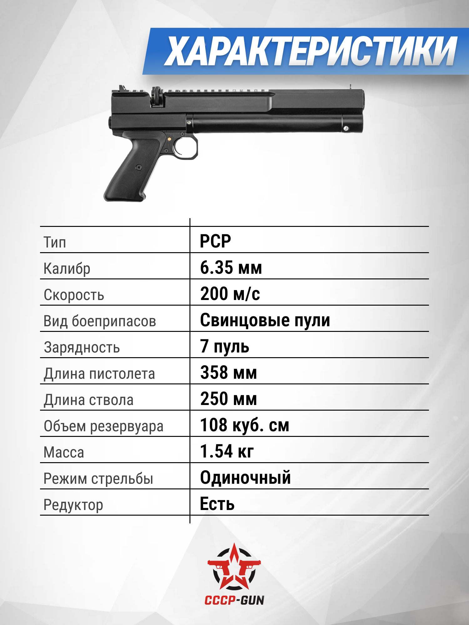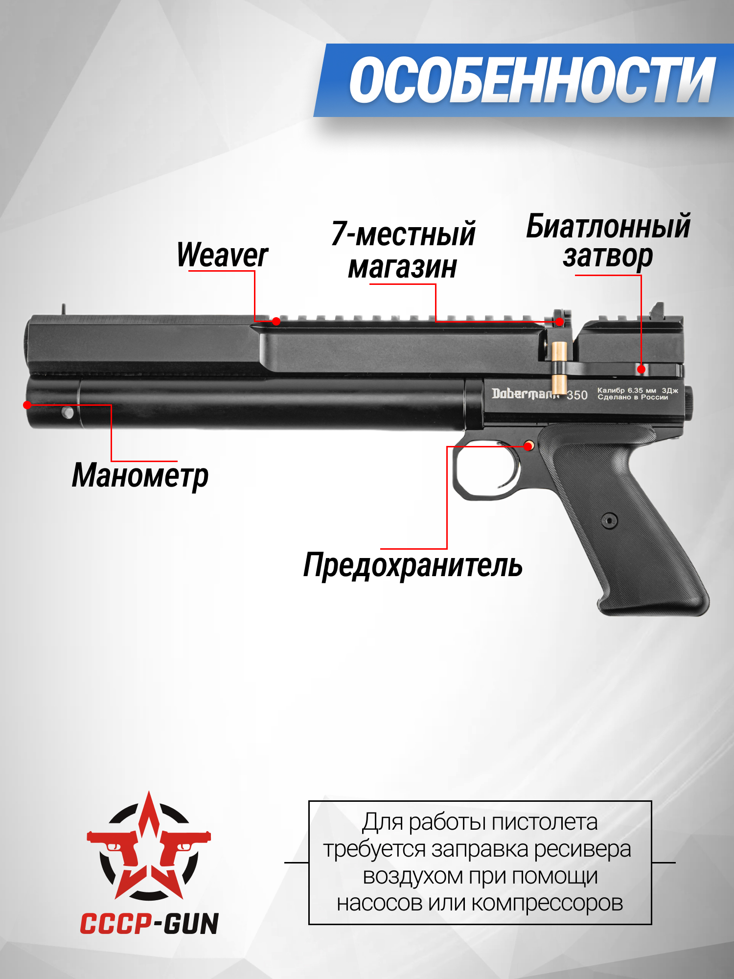 Пневматический пистолет Dobermann 350 Эксцентрик 6.35 мм (200 мм, редуктор)